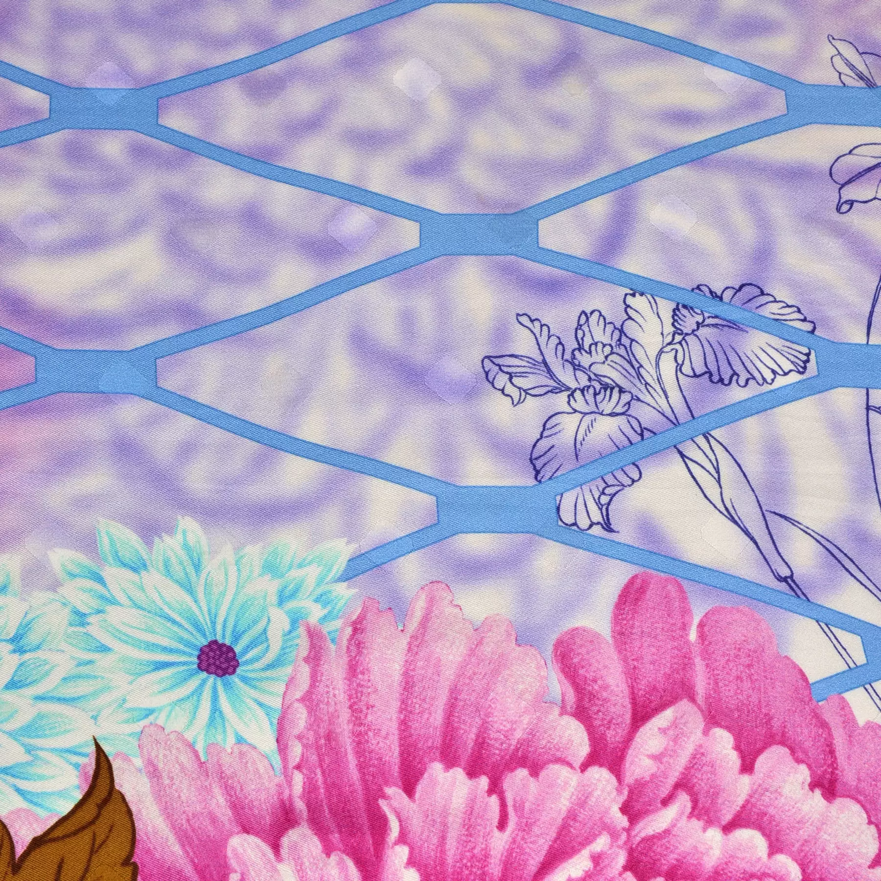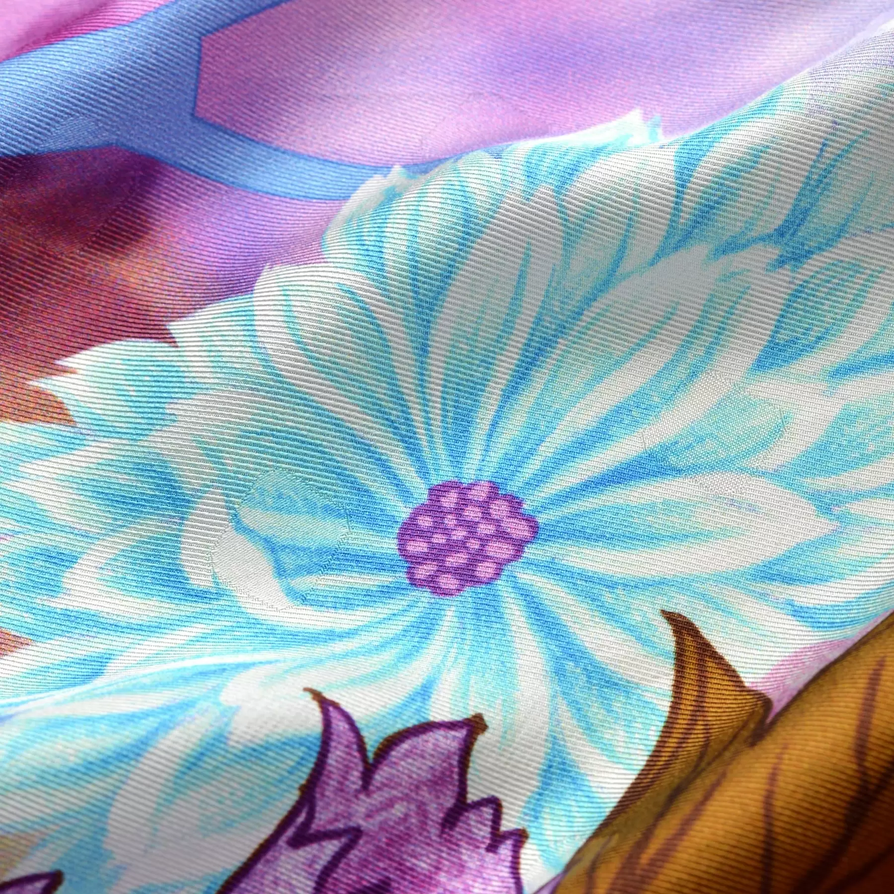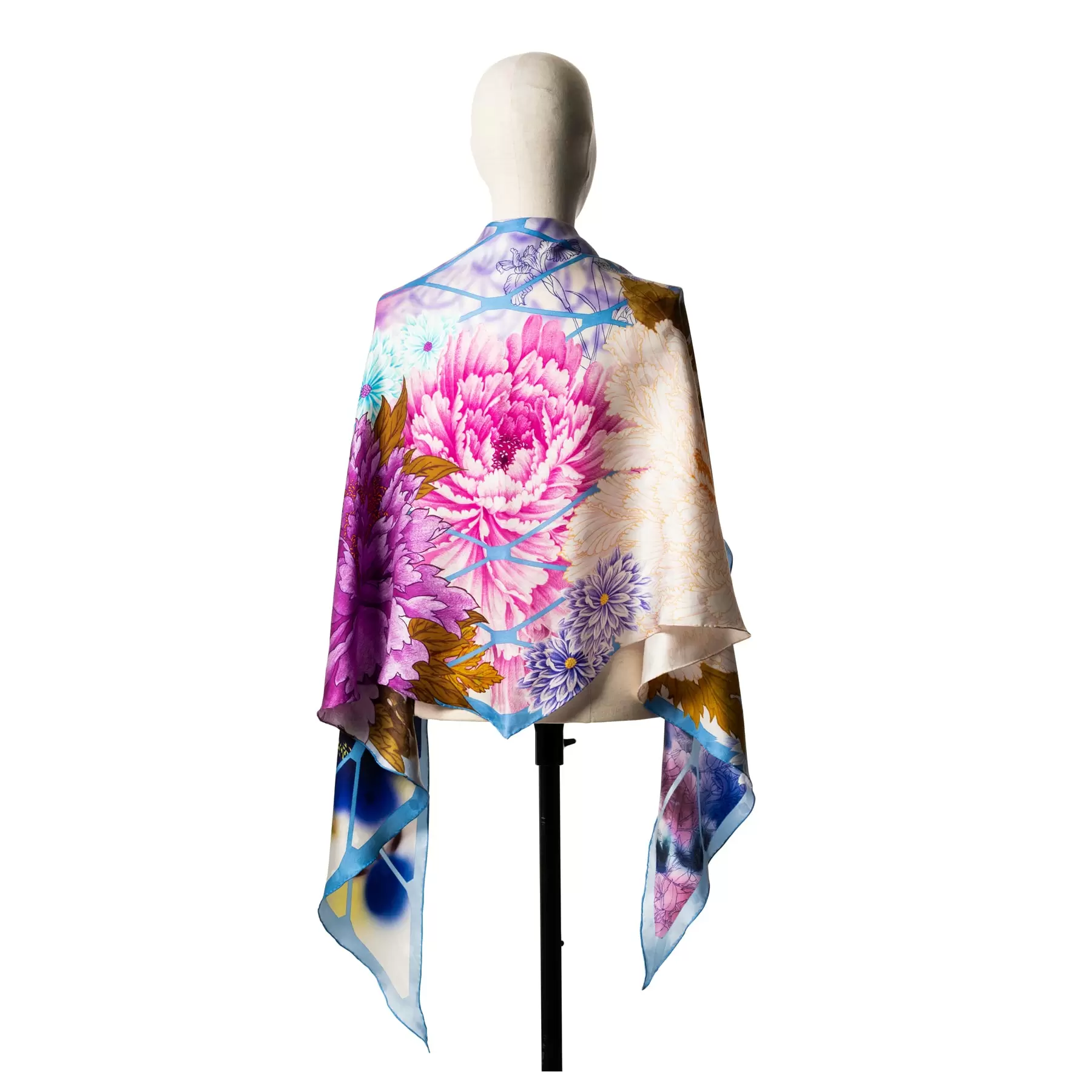 この春夏を代表するデザインです。暈しや線描き、水彩画のようにと、様々な描き方で草花を表現しました。結び方によりアクセントとなる花も変わる、上品さと遊び心を合わせた一枚。ひし形は巻きやすいだけでなく、美しいラインが自然と現れるおすすめの形です。スカーフの端はすべて職人が一枚一枚手で縫製して仕上げた逸品。どんな装いも華やかにしてくれるスカーフです。