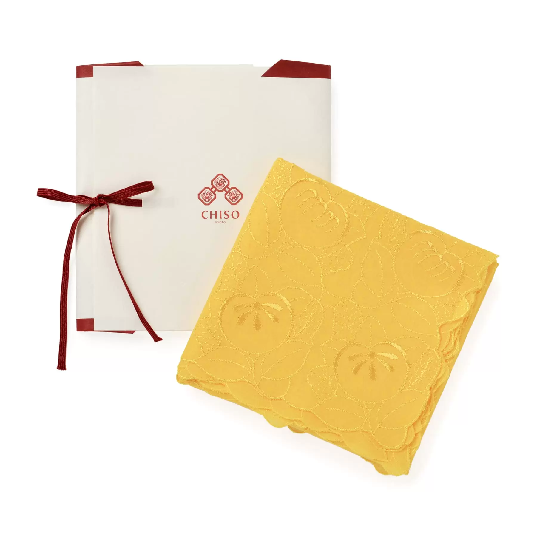 図案家がこのハンカチのために描き下ろしたオリジナルのデザインは、永遠の繁栄や長寿の象徴で、千總の紋でもある橘。