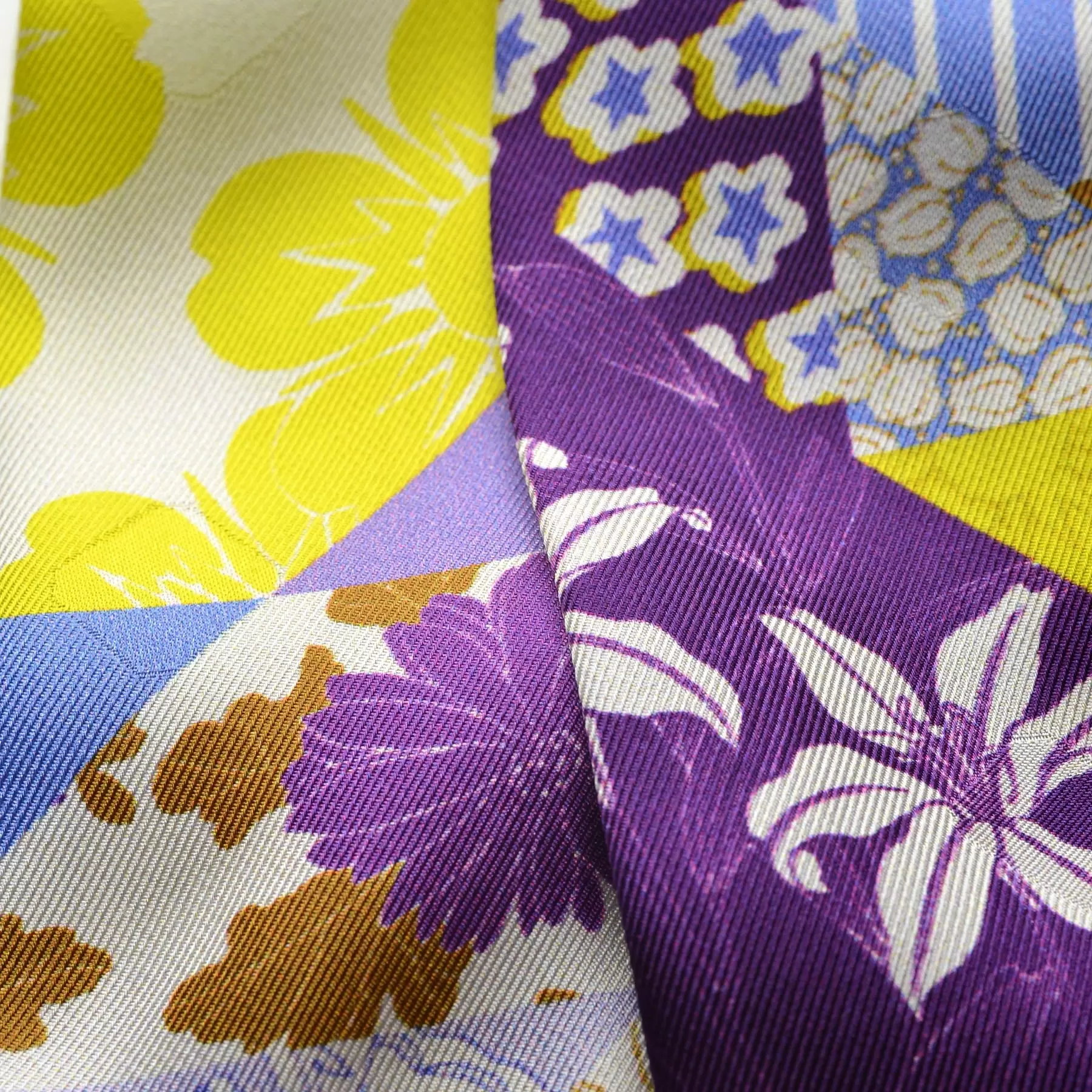 八角形に沿ってパッチワークのように小布をつなぎ合わせたようなデザイン。散りばめられた可愛らしい小花とカラーリングは装いに楽しさを与えてくれます。アクセサリー感覚で首に巻いたり、バッグに付けたりと手軽に取り入れられる一枚です。