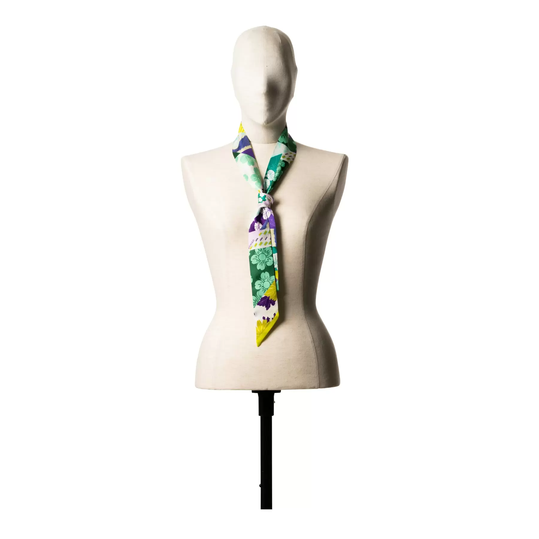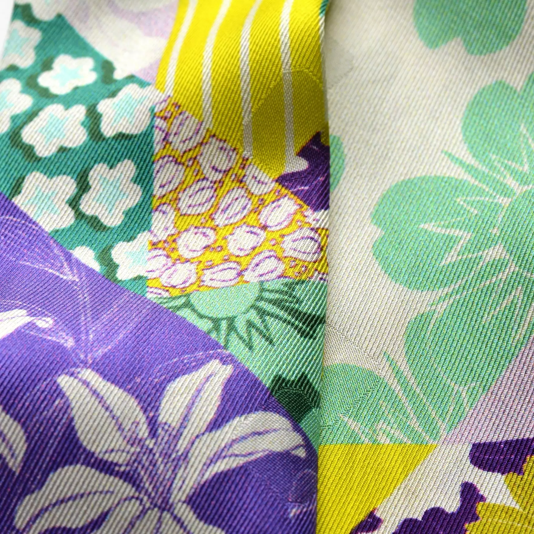 八角形に沿ってパッチワークのように小布をつなぎ合わせたようなデザイン。散りばめられた可愛らしい小花とカラーリングは装いに楽しさを与えてくれます。アクセサリー感覚で首に巻いたり、バッグに付けたりと手軽に取り入れられる一枚です。