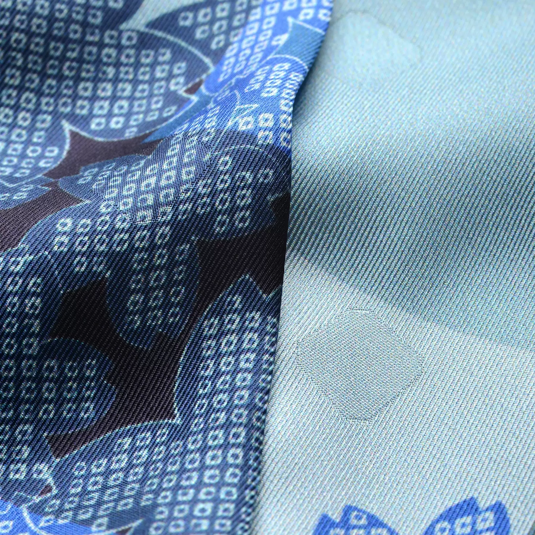 千總の紋にもある八角形を織り込んだスカーフのためのオリジナルの生地を開発。やわらかな風合いと上品な艶が、手で触るだけでも幸せな気持ちにさせてくれます。