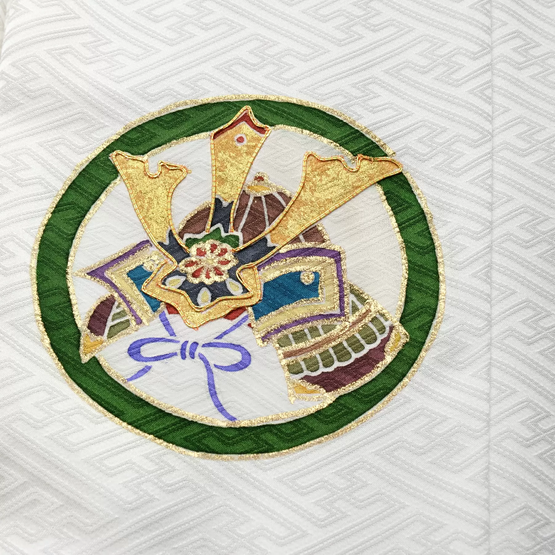 男の子の成長を願うきものの柄に描かれることの多い「兜」と「鷹」を丸紋でデザインしました。勇壮なモチーフを優しく愛らしく表現することで、きものとのコーディネートがしやすい一枚となっております。