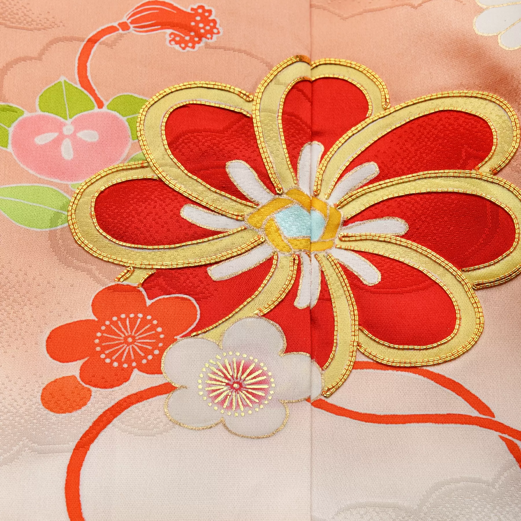 菊や梅などの花々を結び紐によってあらわしました。結びの文様には縁を結ぶという意味があり、親子の絆、また周りの人々との良縁に恵まれますようにとの願いが込められています。地色の暈し美しい染めの技を堪能できる一枚です。