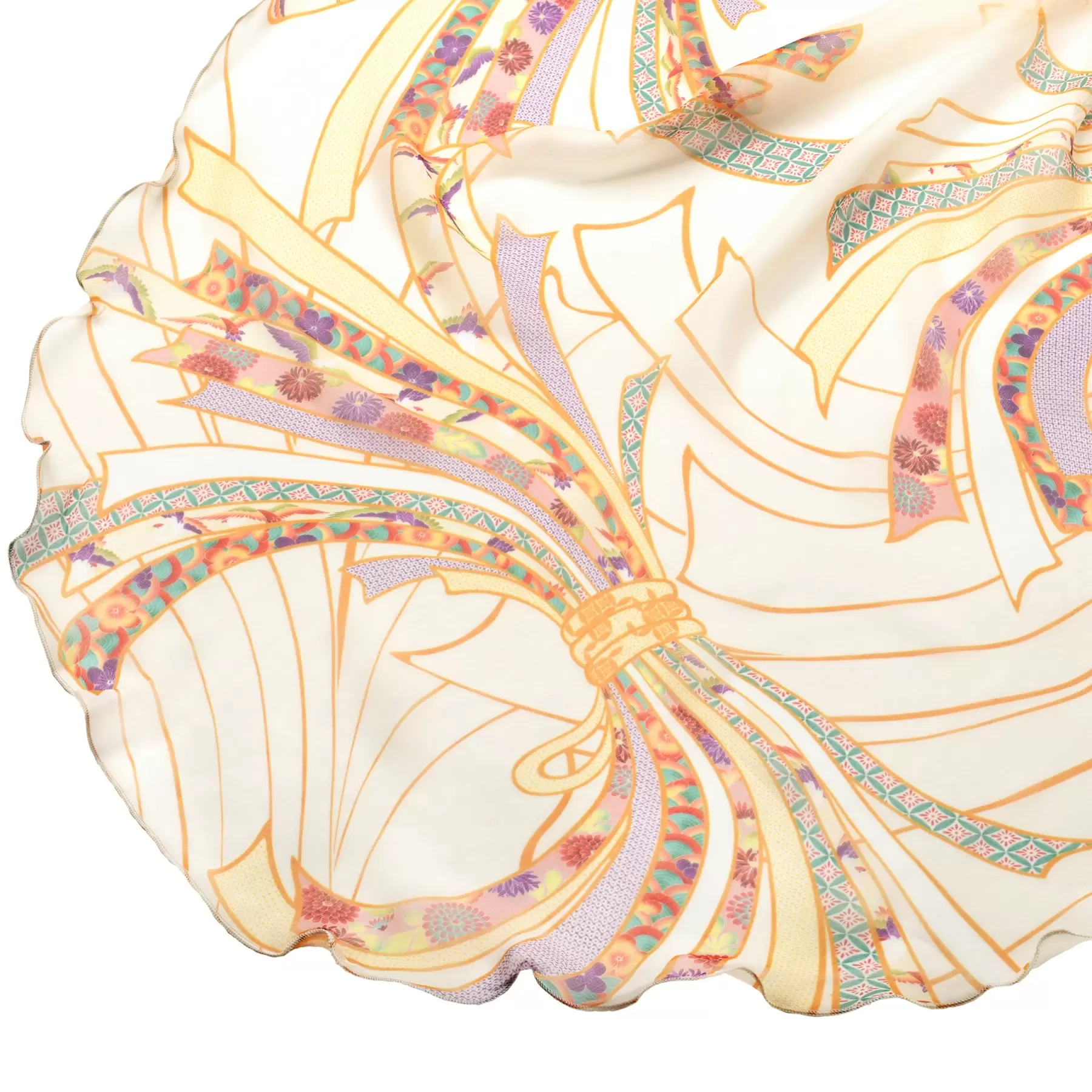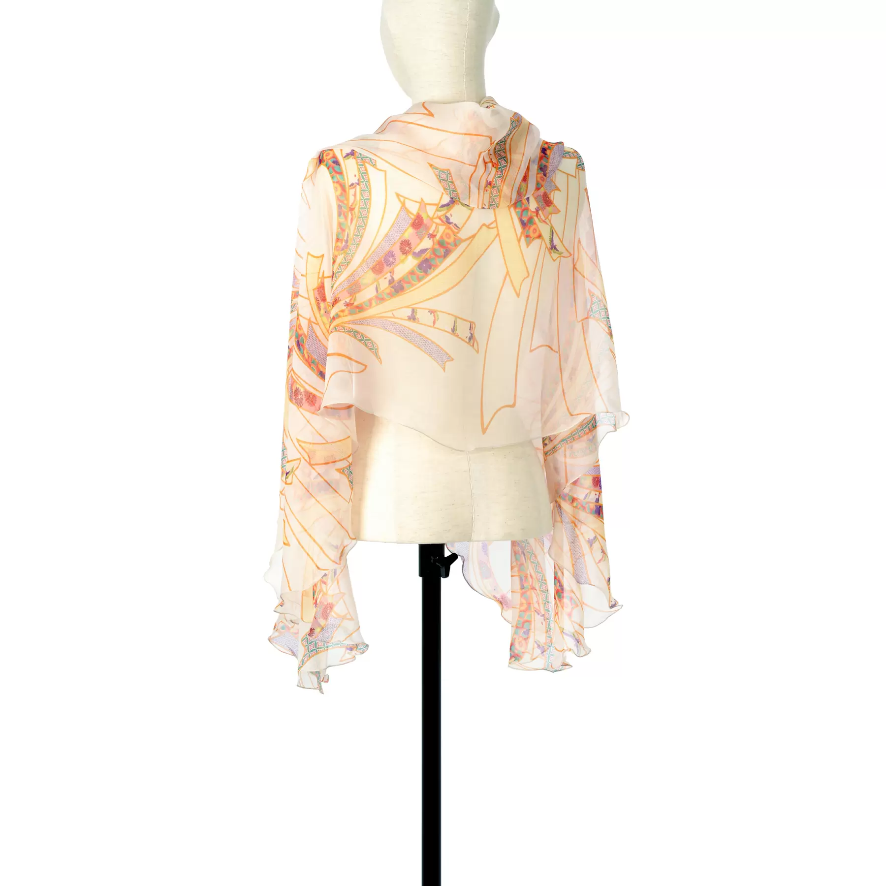 約35gという軽やかなシルクシフォン素材を用いたユニークな楕円形のスカーフです。どんな巻き方もきれいに決まるように計算され尽くした角のない形と、動きのある軽やかな表情を生み出すやさしく波打つ縁の仕上がりが、装いに華やぎをプラスしてくれます。