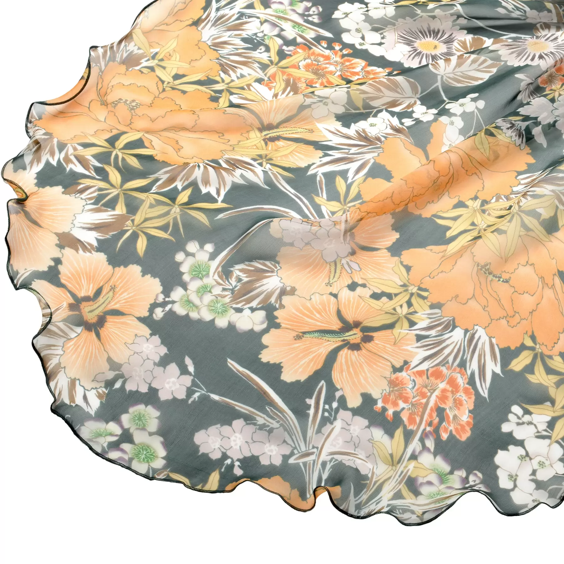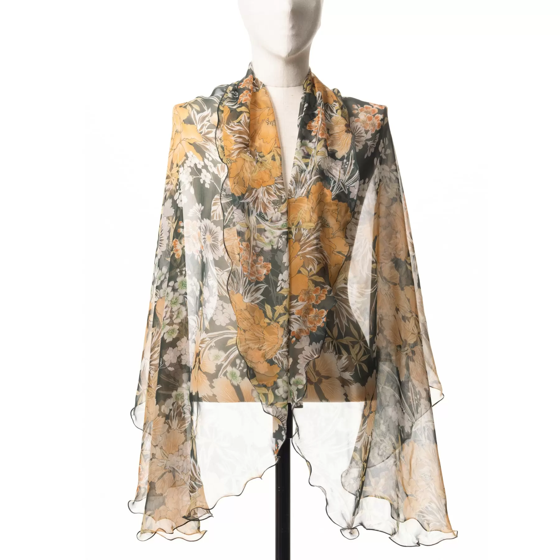 約35gという軽やかなシルクシフォン素材を用いたユニークな楕円形のスカーフです。どんな巻き方もきれいに決まるように計算され尽くした角のない形と、動きのある軽やかな表情を生み出すやさしく波打つ縁の仕上がりが、装いに華やぎをプラスしてくれます。