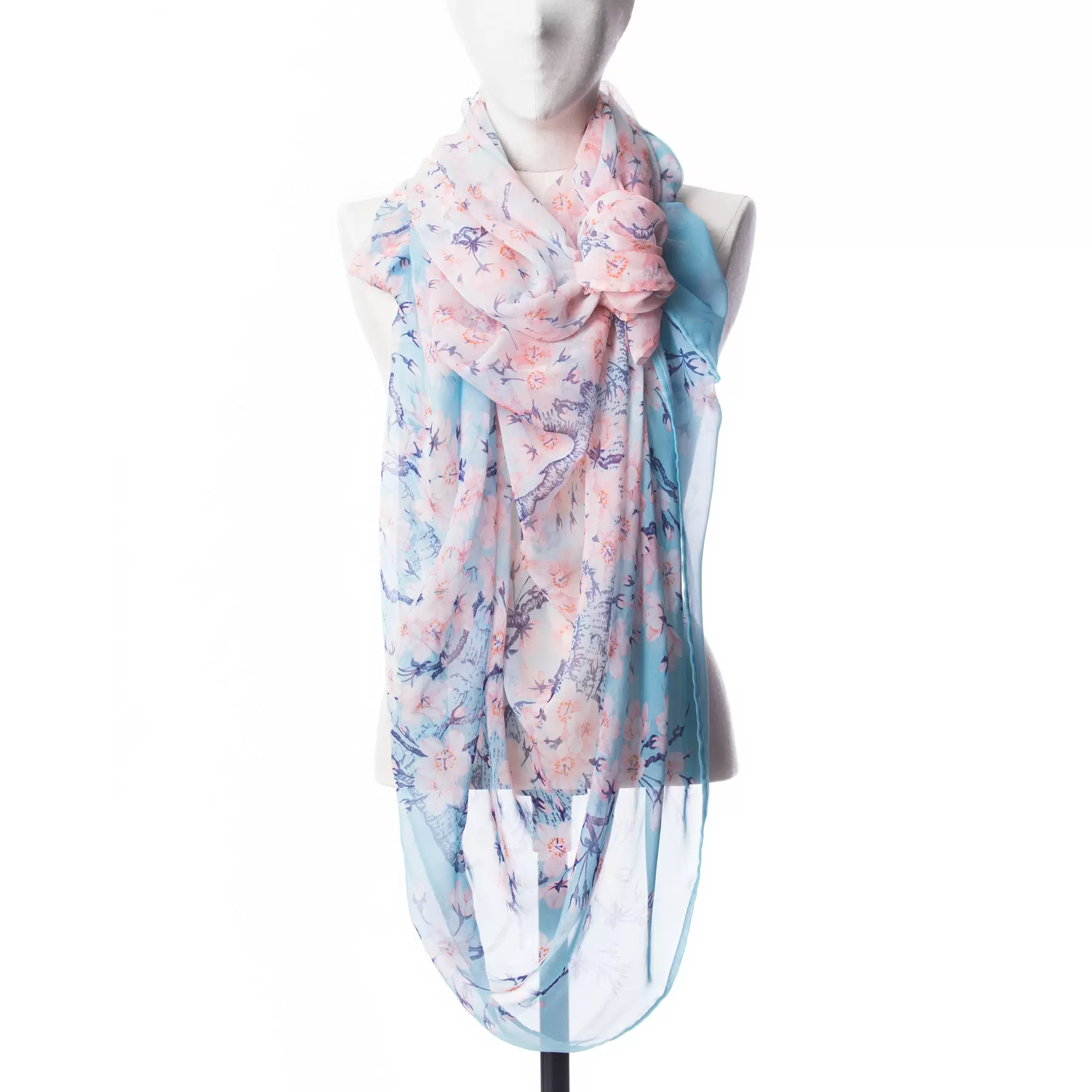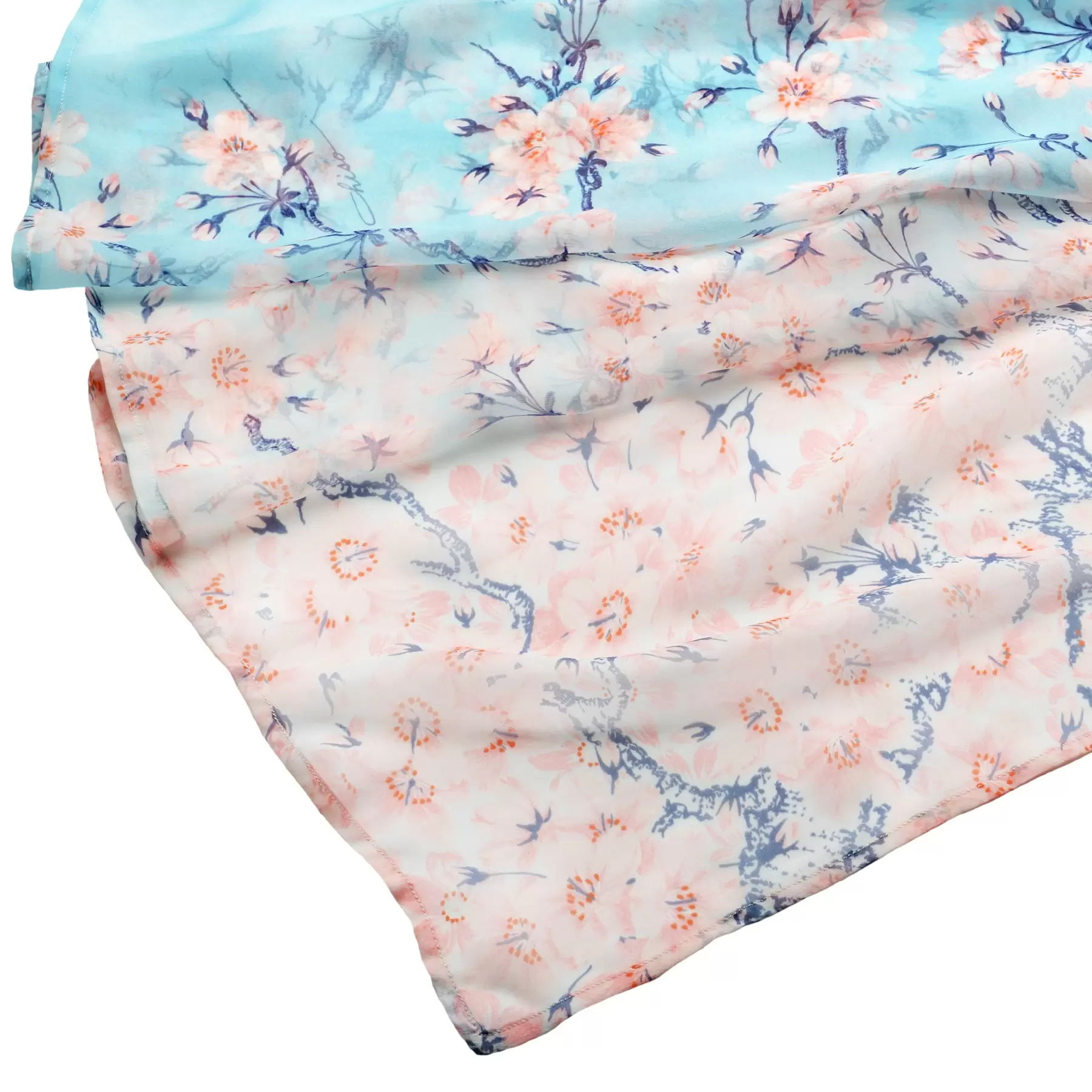 約60gという軽やかなシルクシフォンの大判のストールです。広げると花々をモチーフにしたやさしい絵柄や、色合いの妙、ぼかしの染めの美しさなど、きもので培ってきた千總の技を一枚の絵のように楽しめます。