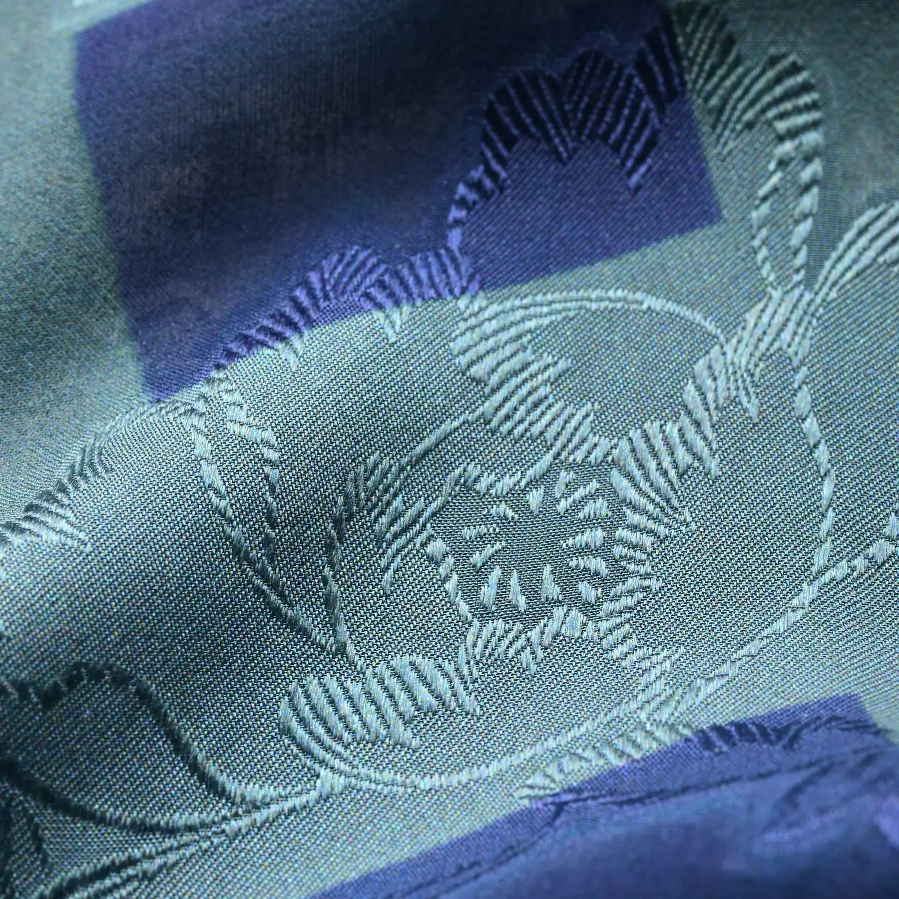 ストール全体に淡くグラデーションをかけ、柔らかさのあるカラーリングに。地紋に織り込まれた牡丹の花が上品に浮かび上がります。細長い形状で巻きやすく、柔らかいシルクの感触が心地良い一枚です。
