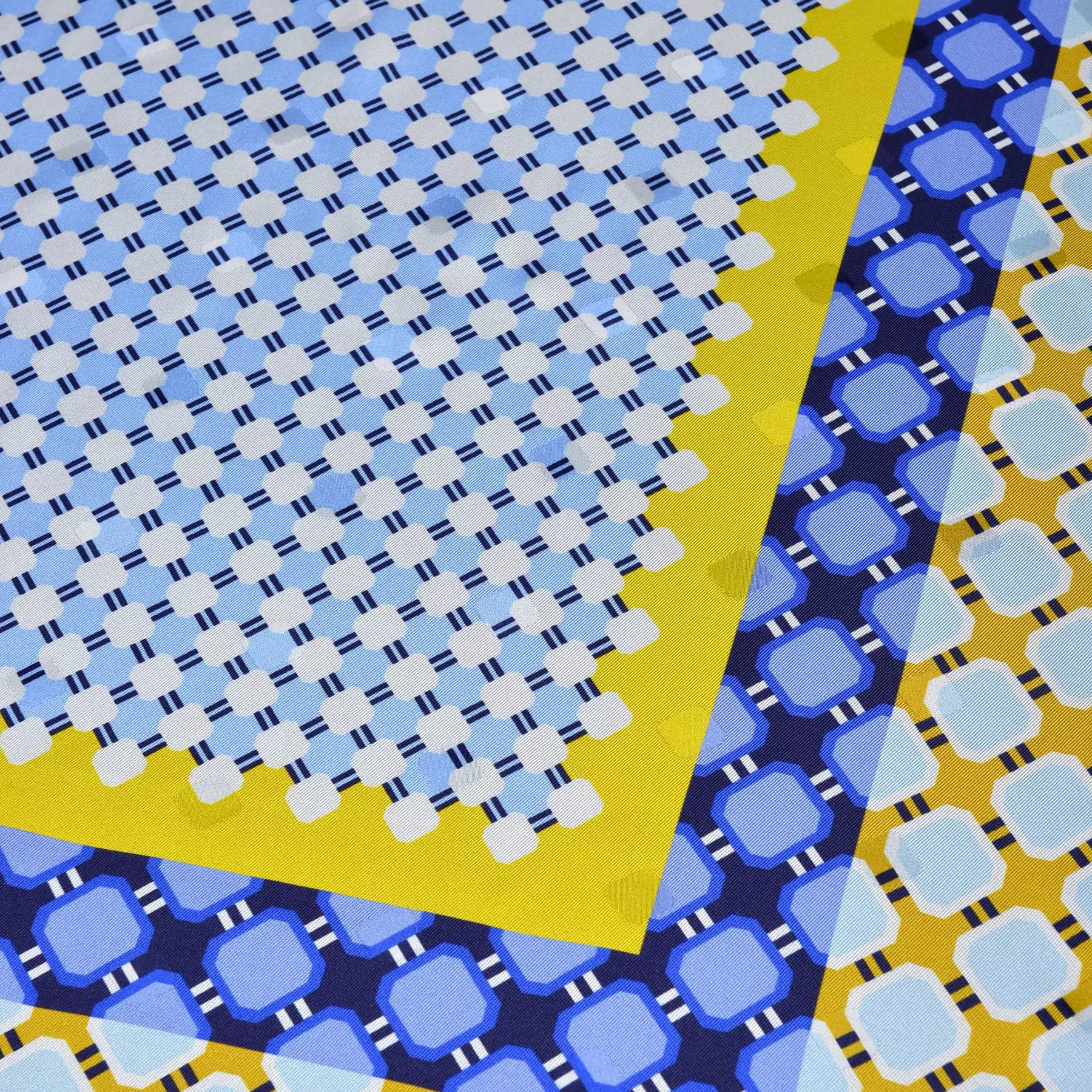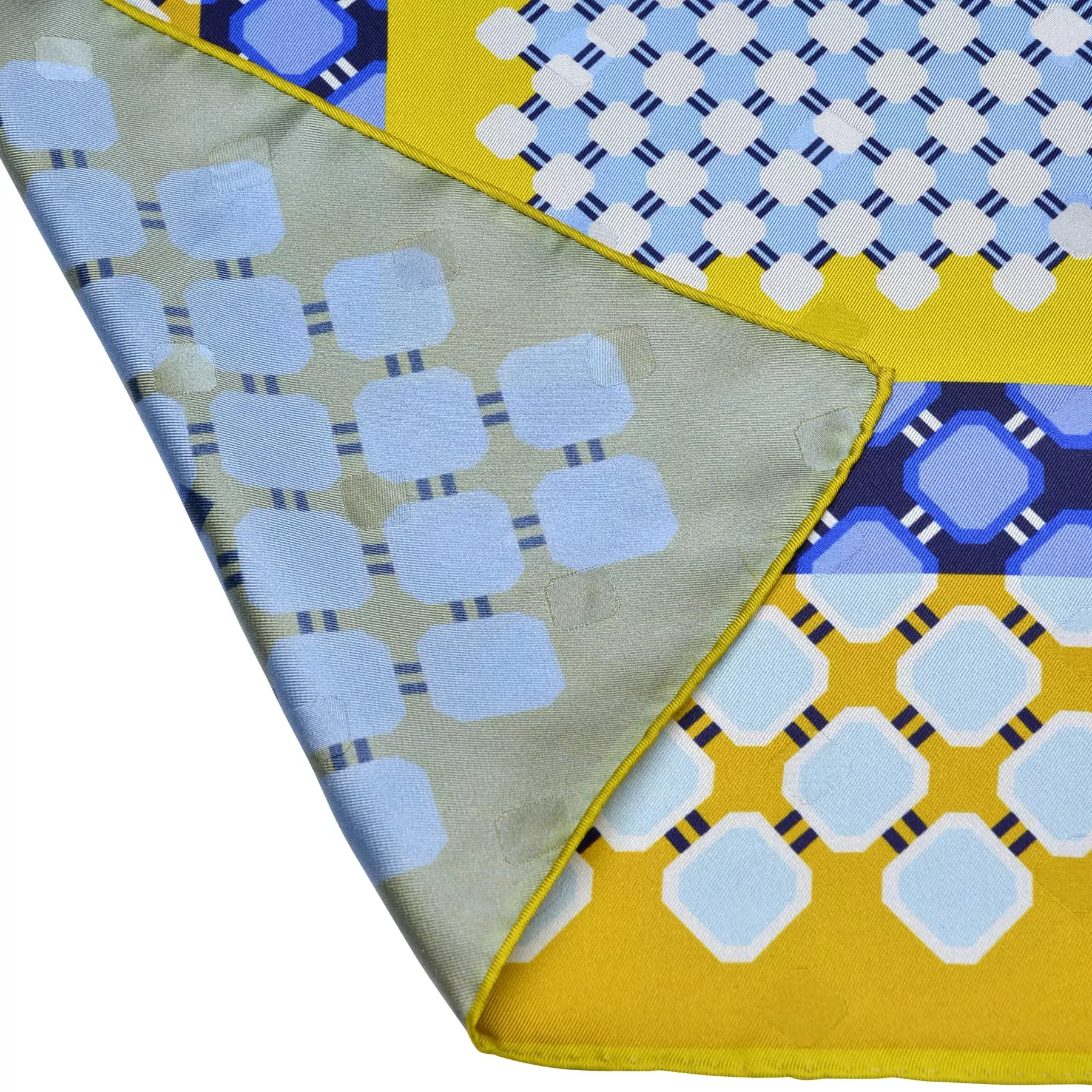 千總の千切紋を組み合わせた立体感のある幾何学模様のスカーフです。ワントーンに近いカラーリングでありながら、アクセントとなる一色がポイントに。どんなシーンも鮮やかに変えてくれる一枚です。