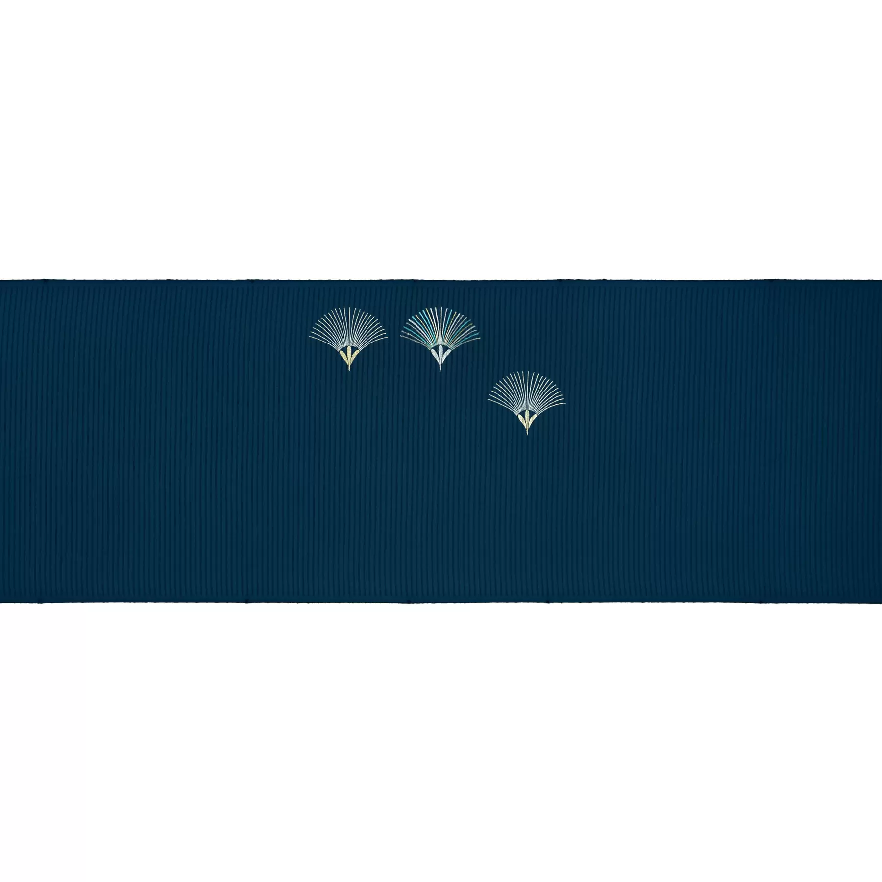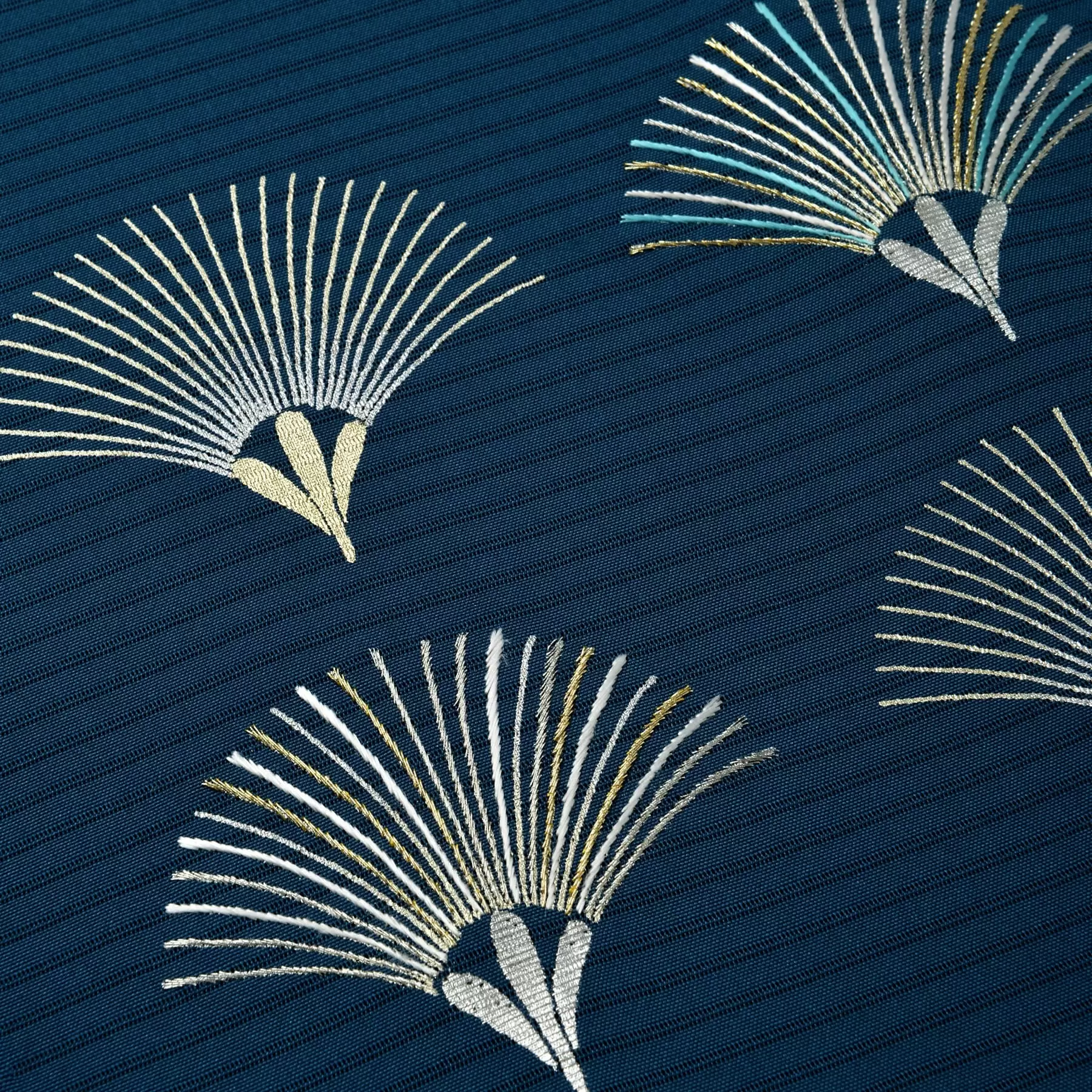 雅楽の舞曲にある「青海波」の装束に使われていたところからその名がついたと言われる青海波文様。永遠の幸福を願う吉祥文様である青海波を、松をモチーフに表現しました。シンプルなデザインに、金箔や金糸、カラフルな色糸がアクセントになっています。和のお稽古に最適な染め帯です。