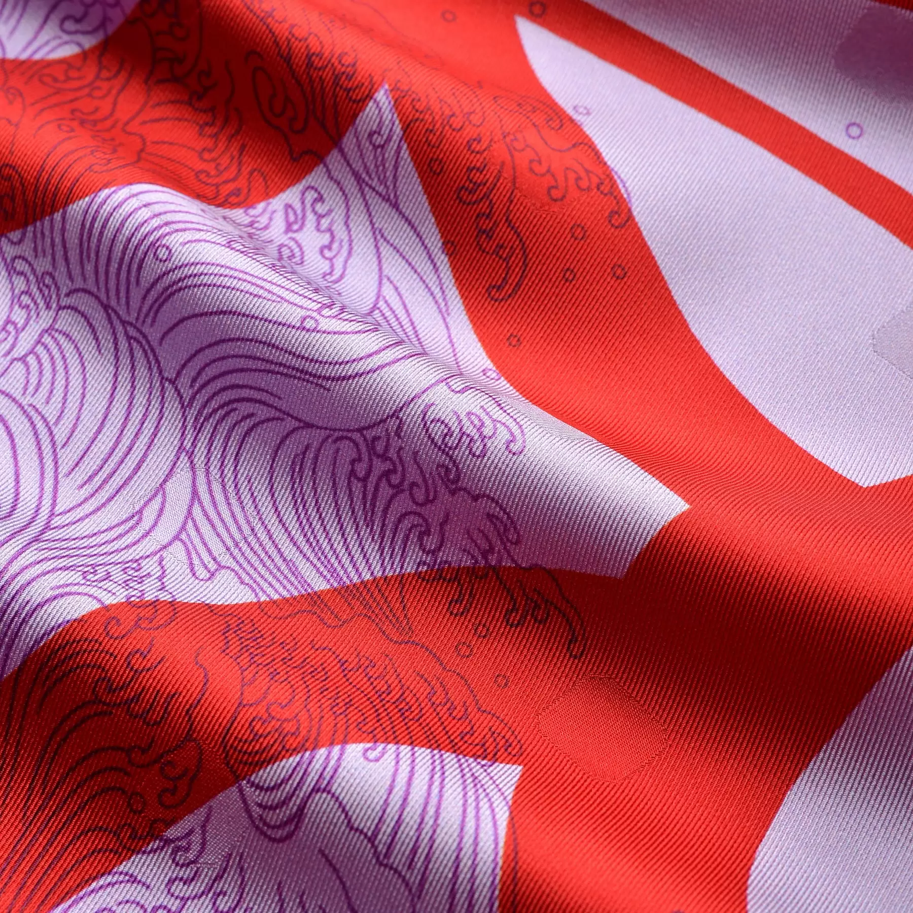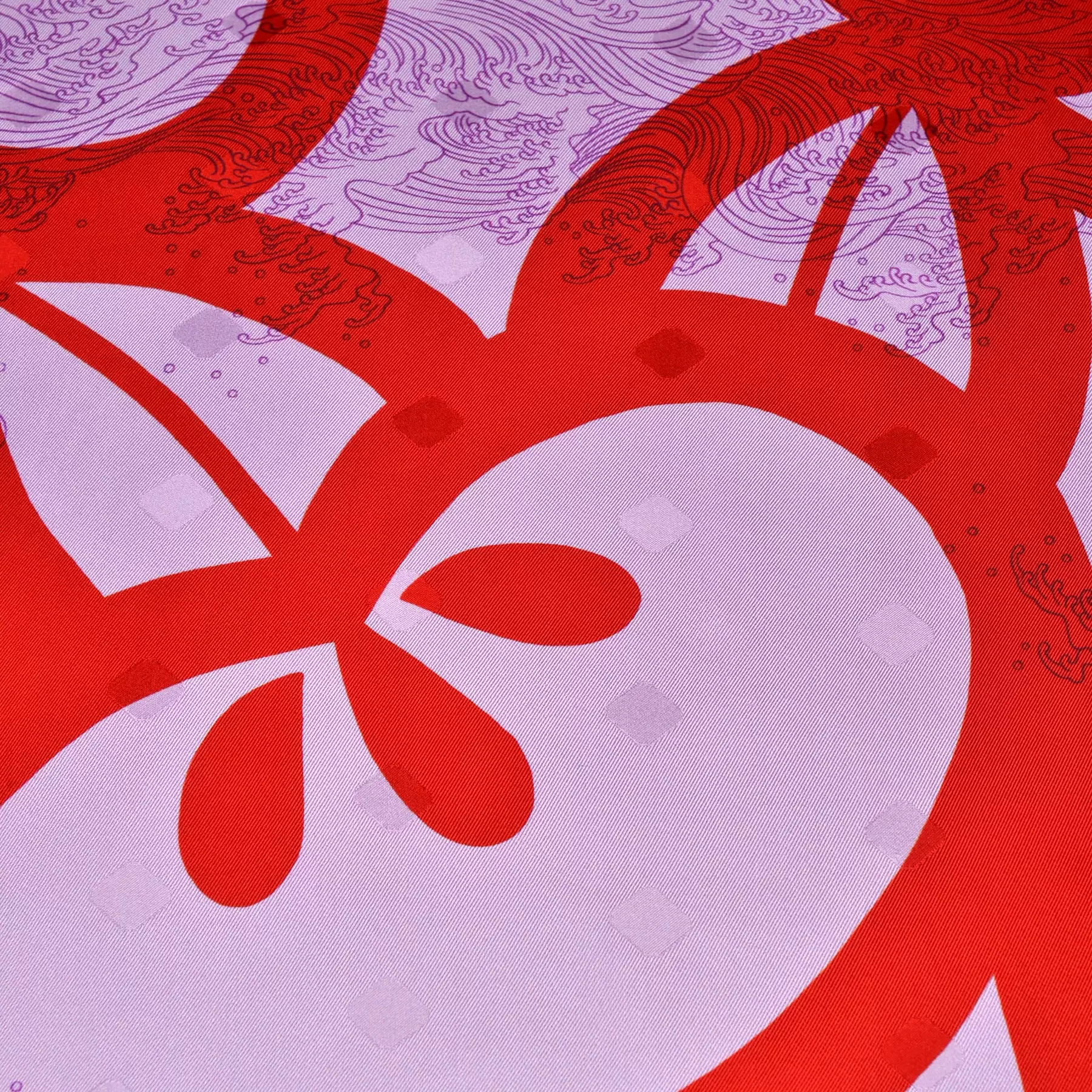 表情豊かな波文様に松竹梅、橘を重ねた、大胆でありながら、波の美しく繊細な曲線に惹きつけられる一枚。千總の紋にも描かれる橘と古来より続く吉祥文様のモチーフを、洋服に合わせやすくアレンジしています。
