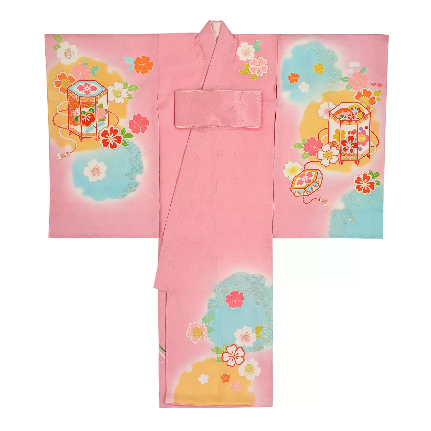 優しいピンクの地色にクリームと水色の柔らかな雪輪が舞う優しい初着です。雅やかな貝桶と桧扇は、女の子らしく華麗に優美にとの成長の願いが込められ、その周りには春秋の花々が散りばめられています。女の子の可愛らしさが詰まった一枚です。