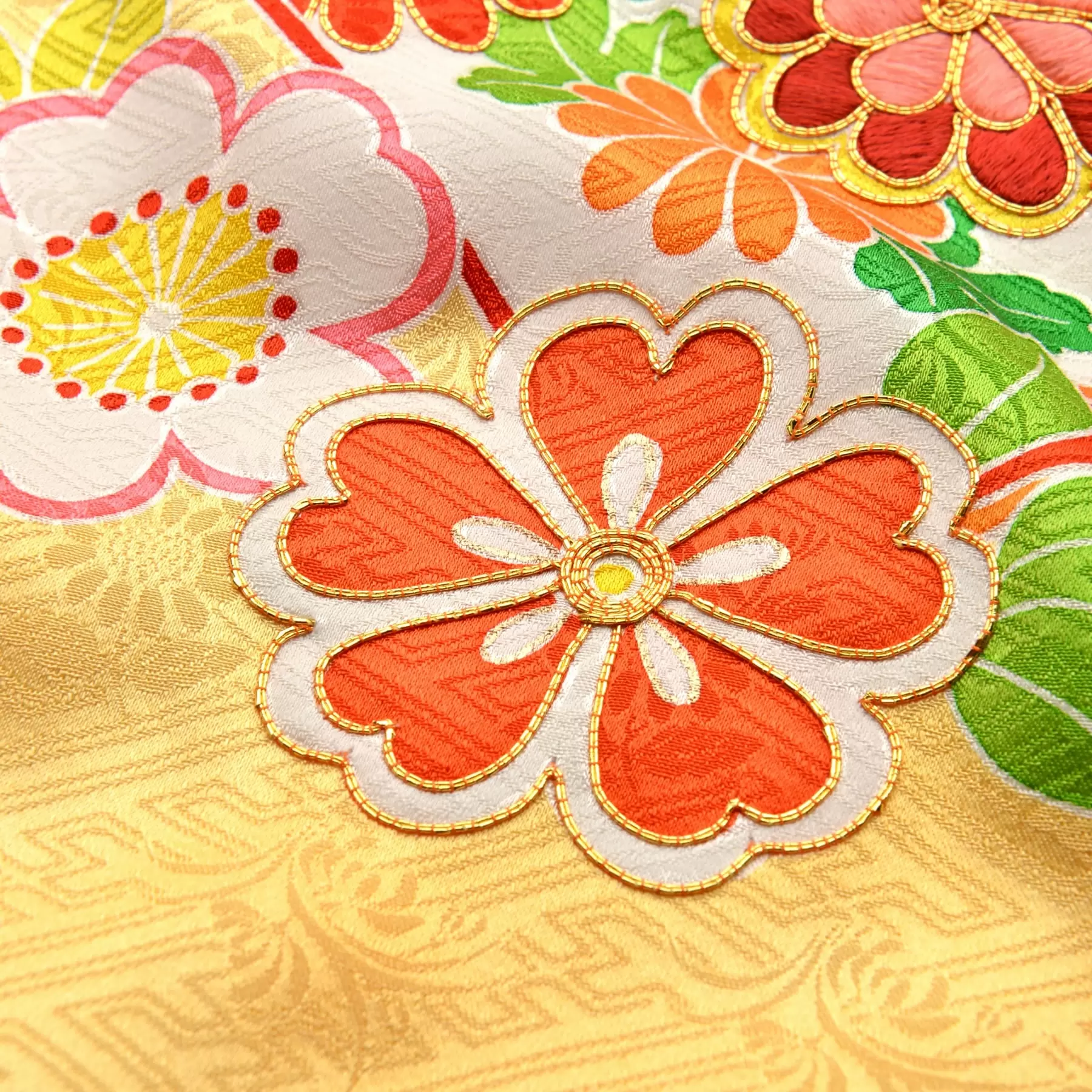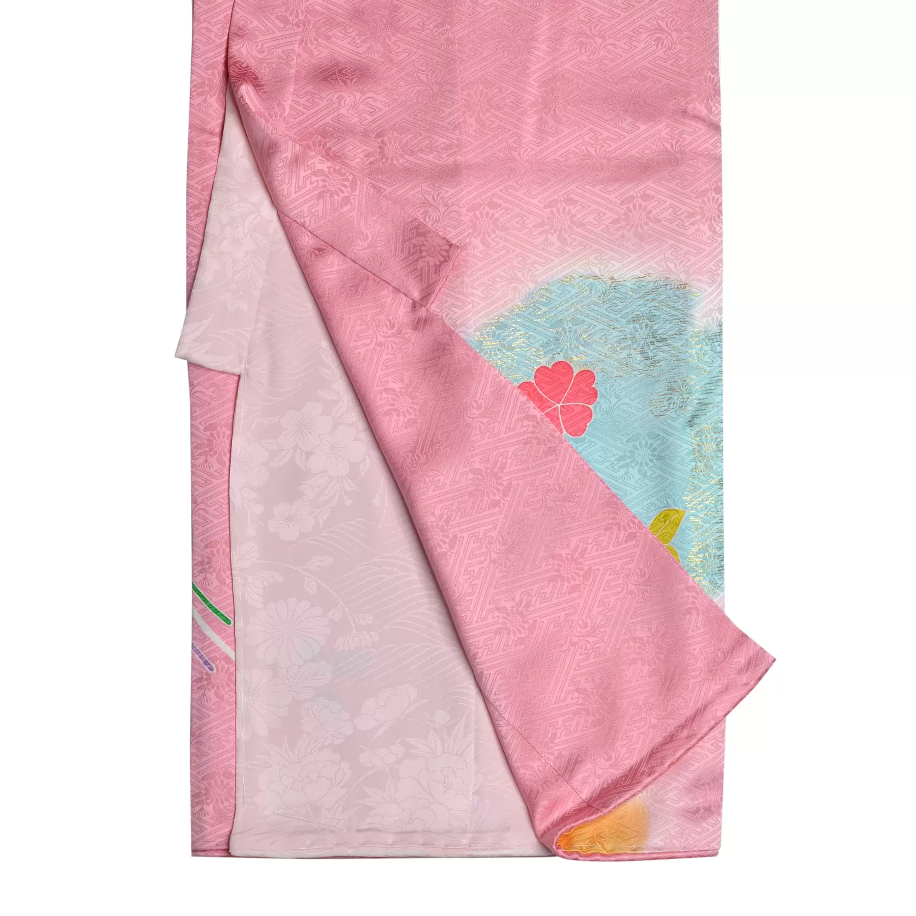 千總の初着は上着、下着とも全て正絹で作られています。下着はピンクで、お袖には赤の地色の付袖が付きとても華やかです。付け紐には紐飾りがされています。