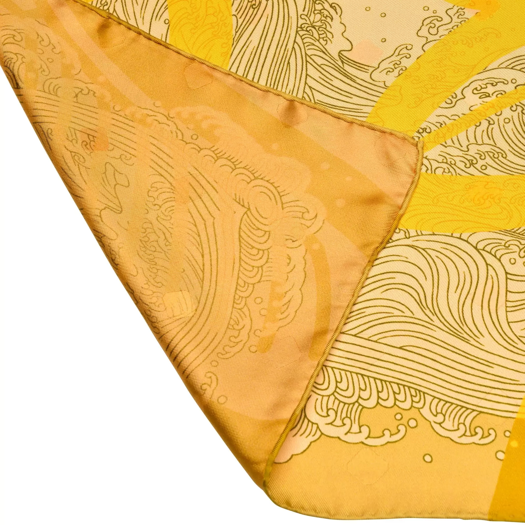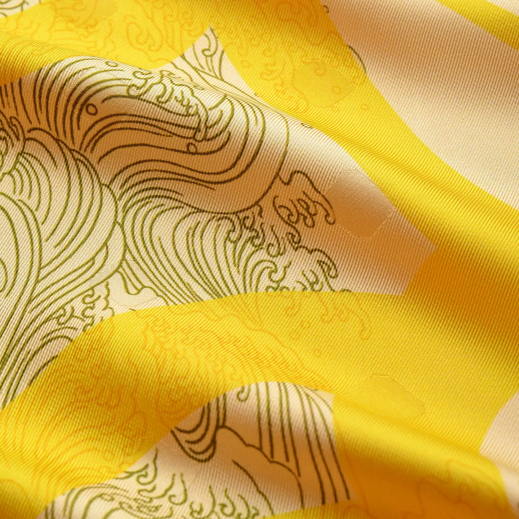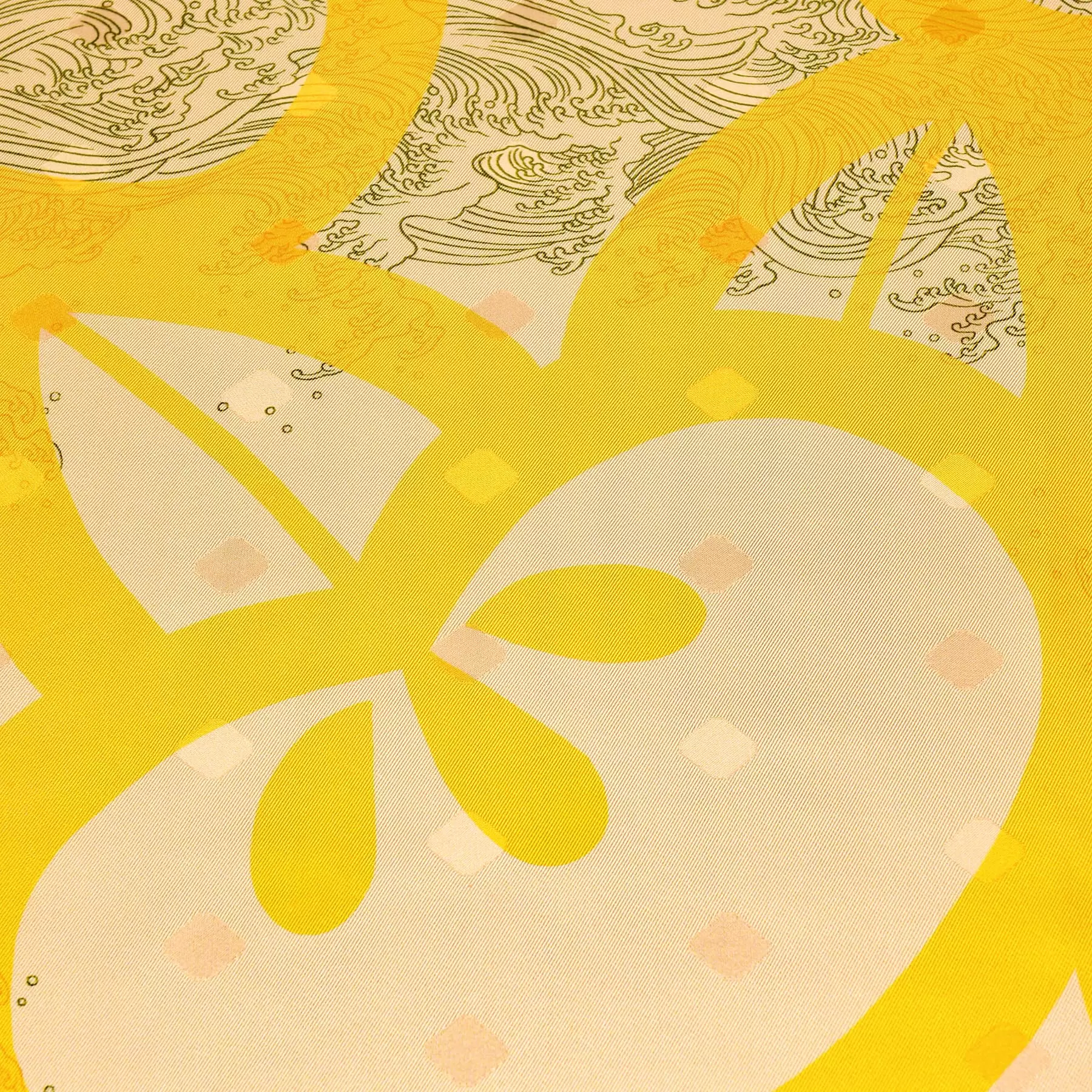 表情豊かな波文様に松竹梅、橘を重ねた、大胆でありながら、波の美しく繊細な曲線に惹きつけられる一枚。千總の紋にも描かれる橘と古来より続く吉祥文様のモチーフを、洋服に合わせやすくアレンジしています。