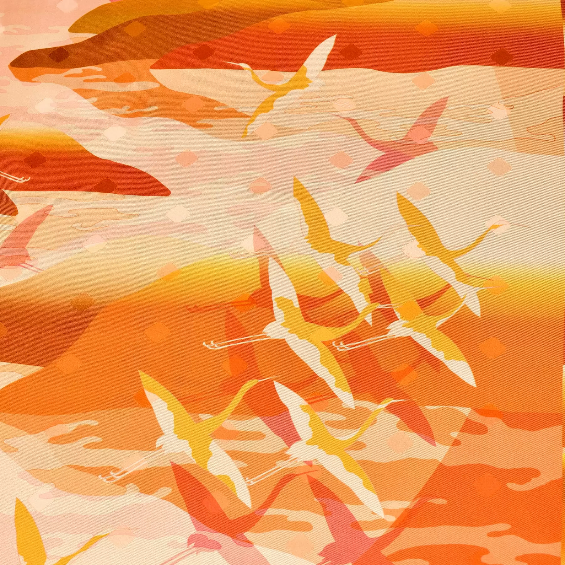 長生きの象徴の鶴と、海に浮かぶ山々に月を重ねた奥行を感じさせるデザイン。月の光に照らされる美しい鶴がなんとも幻想的な雰囲気を表現しています。古典的なモチーフでありながら、カモフラージュのように見える配色で、日常使いとしてもスタイリングしやすい一枚です。