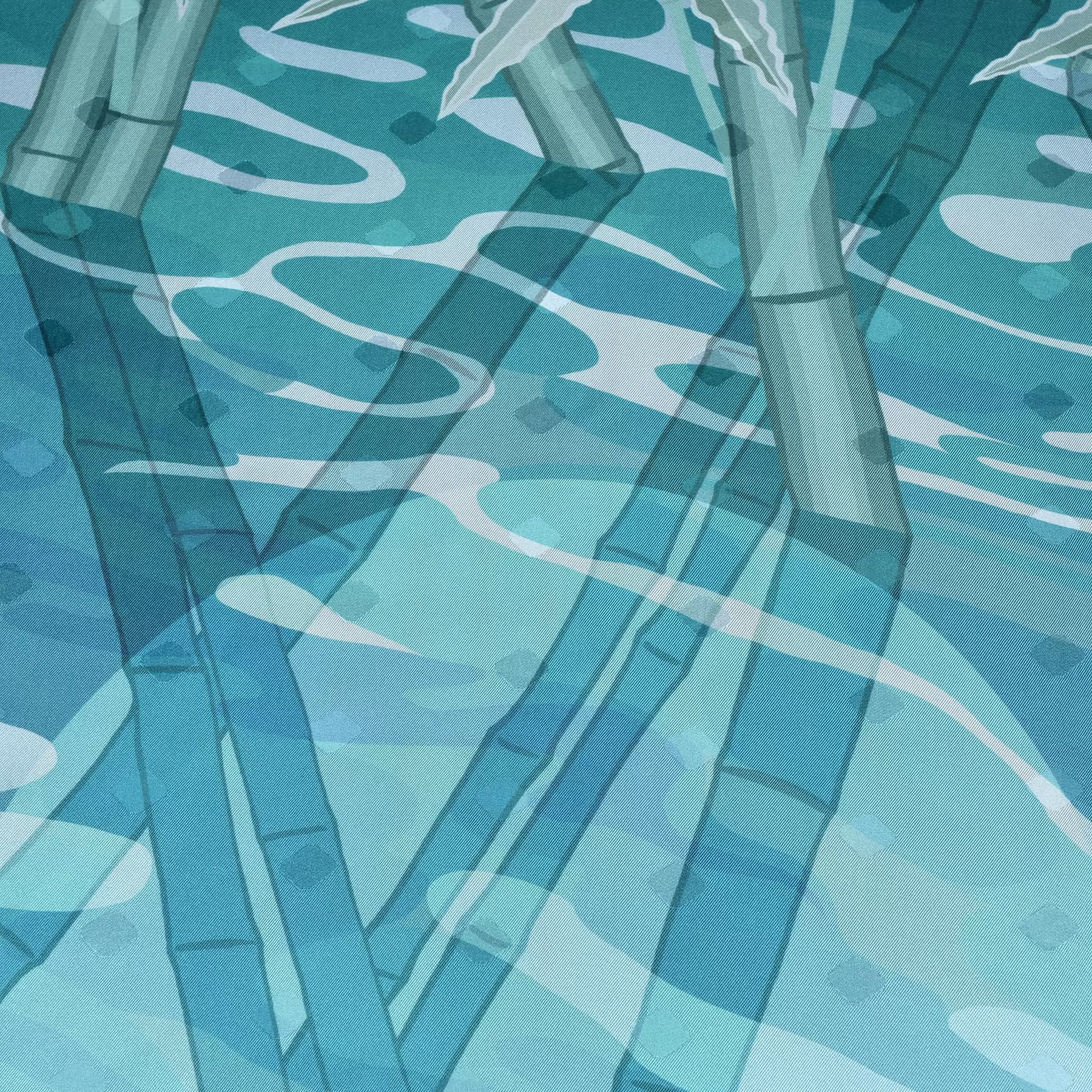 水面から竹が伸びやかに描かれた幻想的な一枚。雅やかに流れる水に映る月が、高い空で美しく輝く月を連想させてくれます。自然の美しさと静かな夜を写し取ったようなデザインは、スタイリングにより表情の変わる飽きのこないスカーフです。