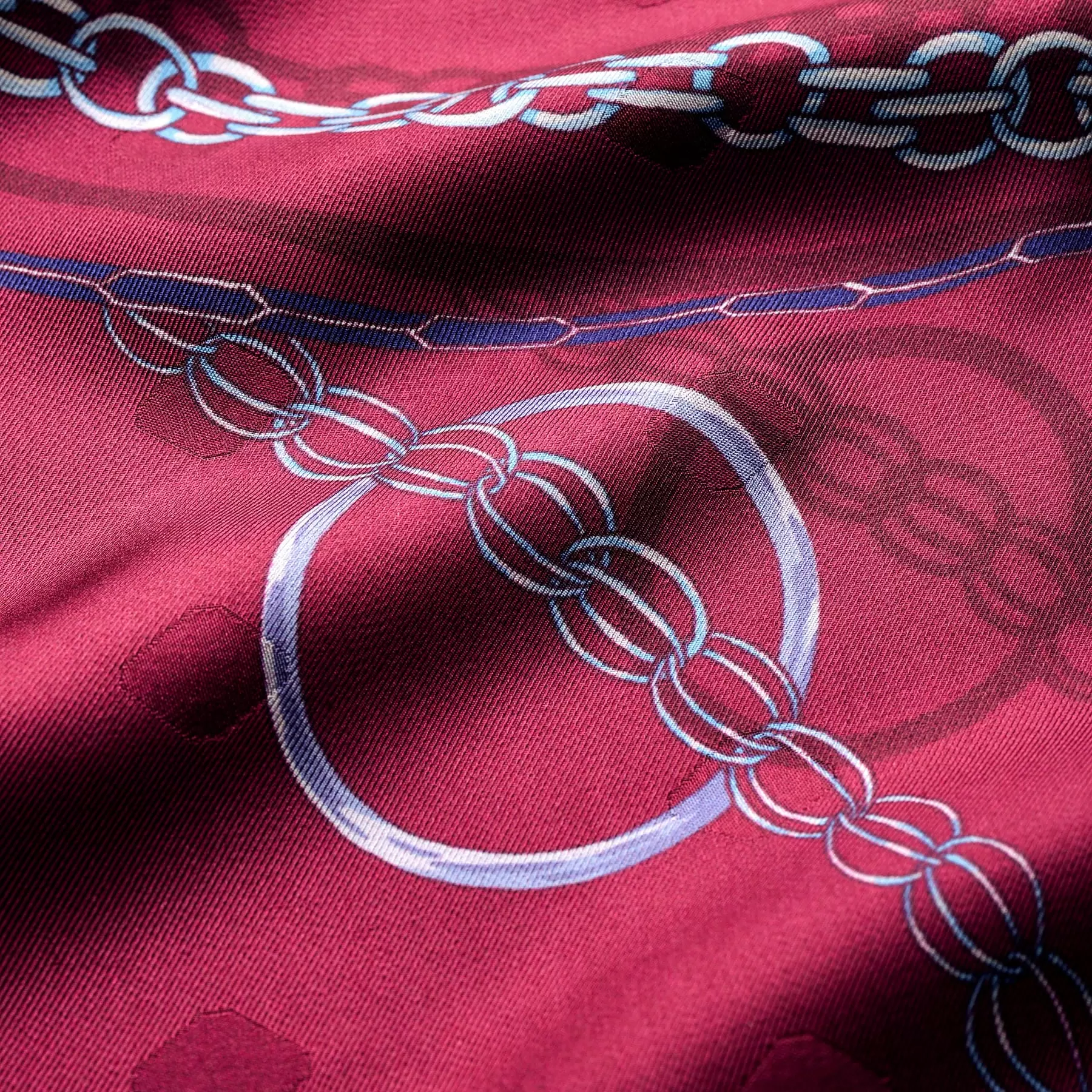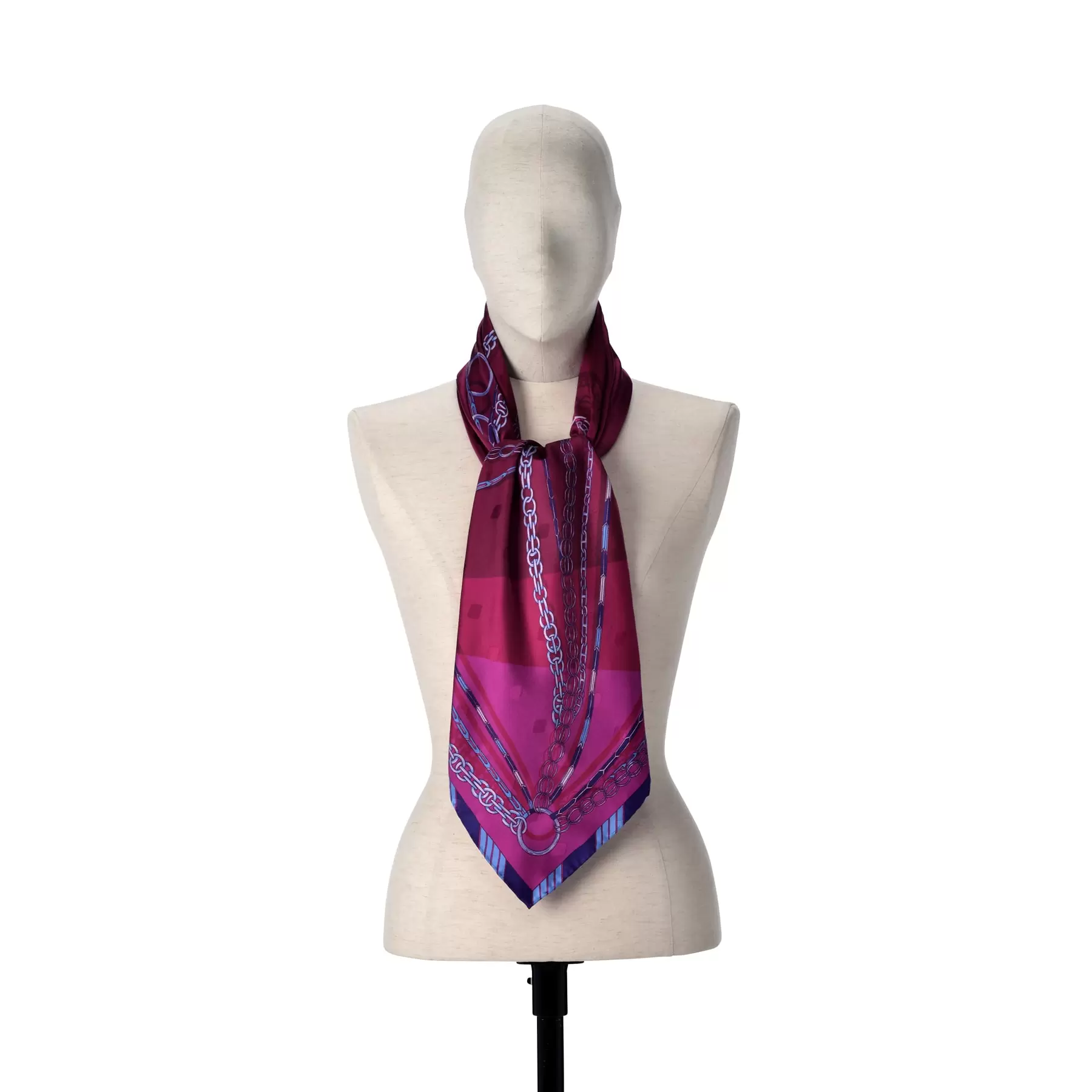 京都の町でよく見かける鎖樋をモチーフにしている一枚。水中に漂っているような優雅なデザインは動きがあり、生地の柔らかさを一層心地よく感じさせてくれます。スカーフ全体には千總の八角形を影のように重ね奥行きを演出。様々なシーンでお使いいただける一枚です。