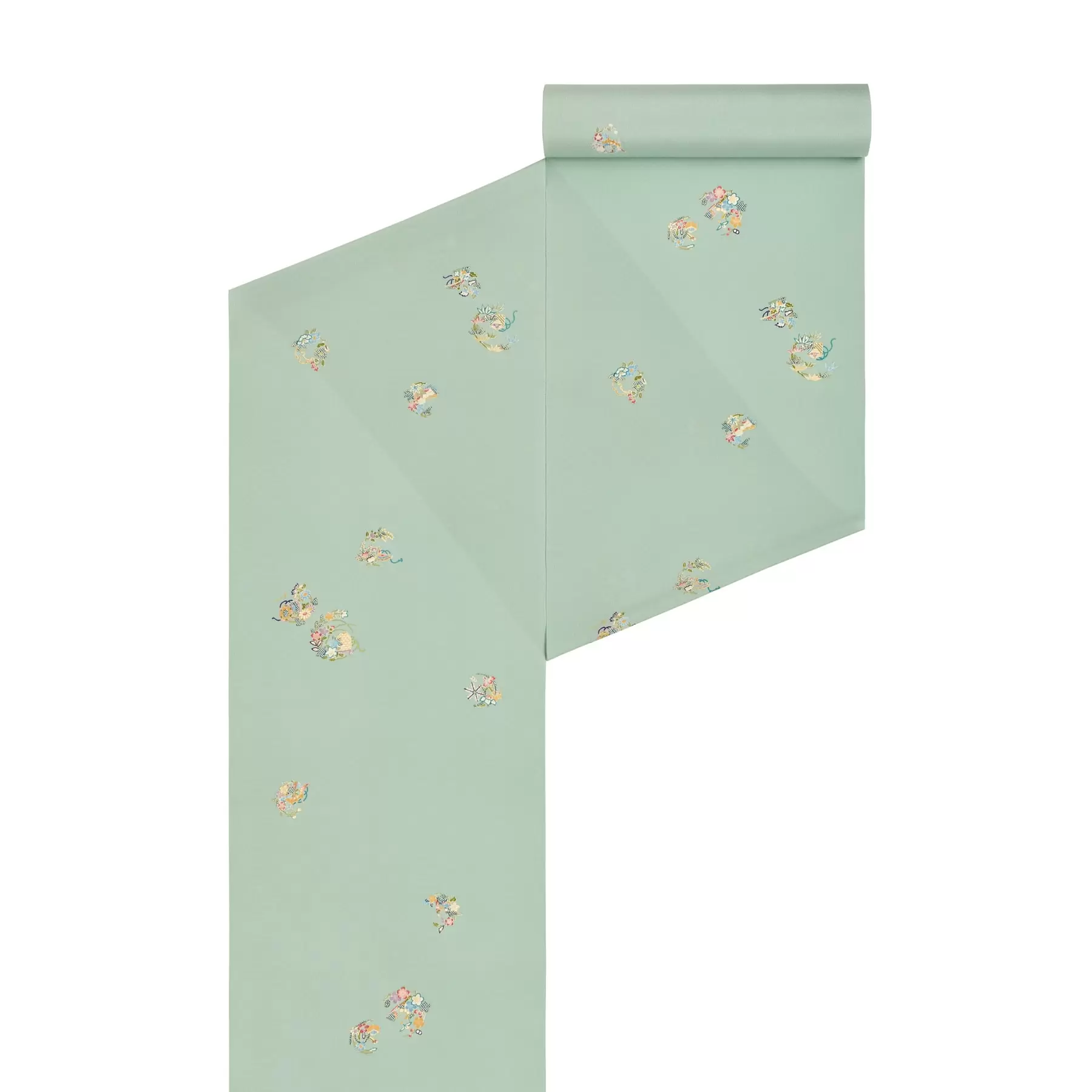 季節を感じる12ヶ月の花々を束ねてデザインされた花の丸が可憐な小紋です。草花を永遠に続く幸せを意味する「円」で表した花の丸の文様。「円」は「縁」にも繋がることから花嫁衣装にも好まれ、お祝いの席で用いられ大切に受け継がれてきました。