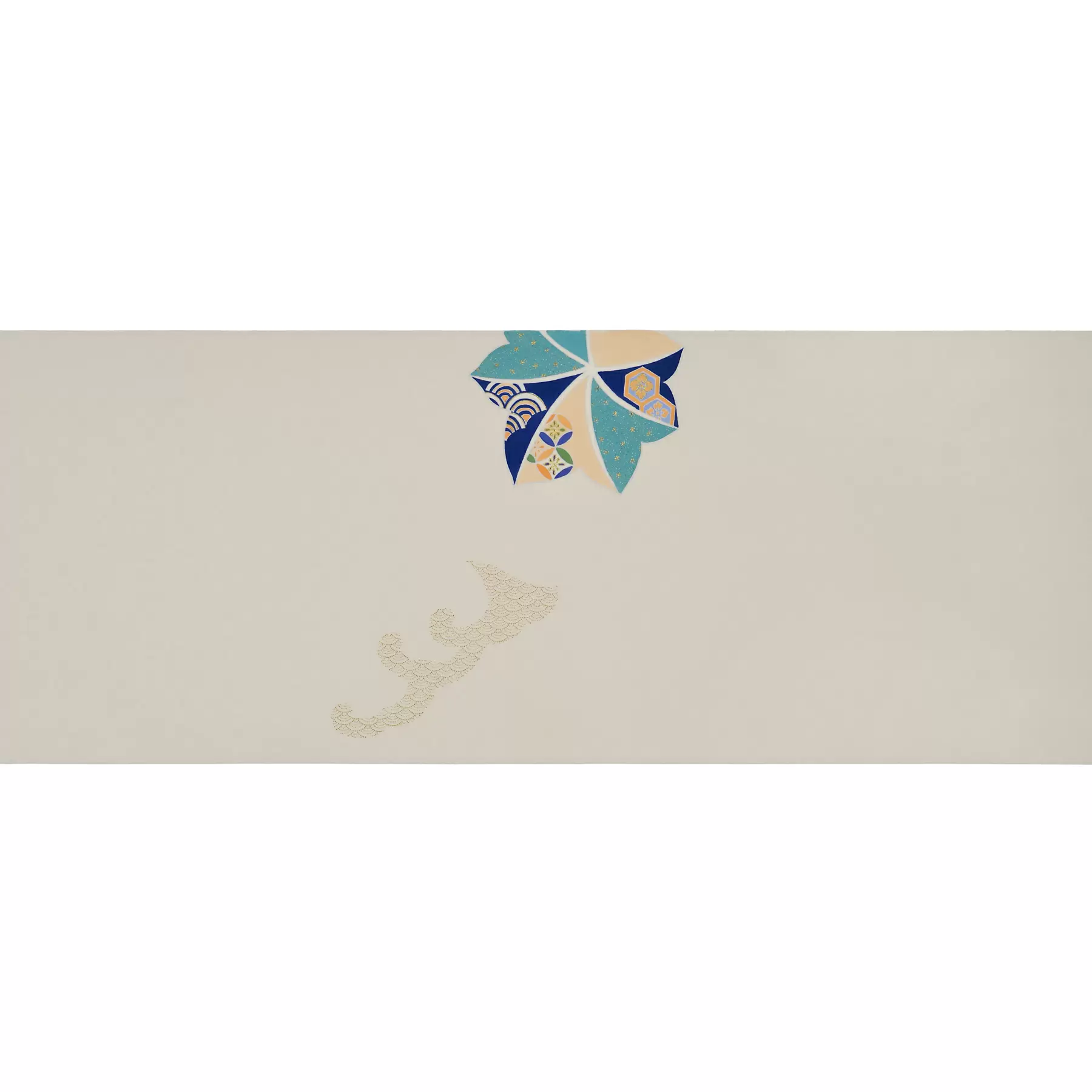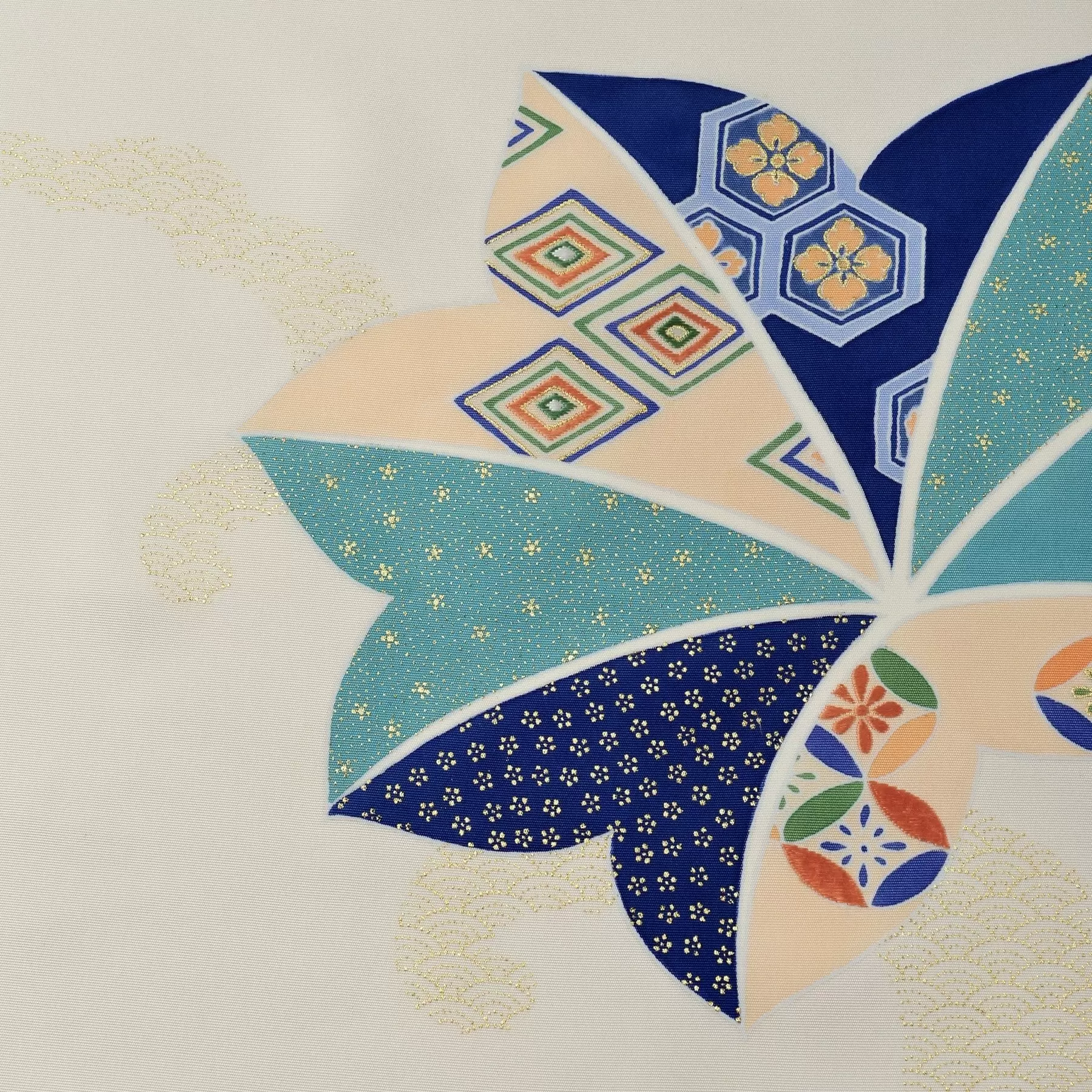 千總が所蔵する裾模様の裂地から、百人一首に詠まれるなど紅葉の名所で知られる竜田川をテーマにしています。大きく描かれた楓を七宝、亀甲、菱の連続文様と小さな小紋箔でカラフルに彩り、箔の青海波で描かれた波を組み合わせました。