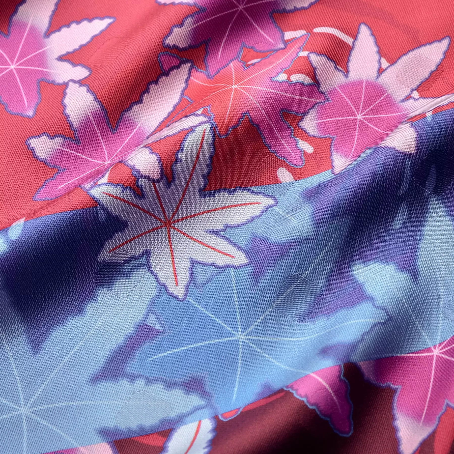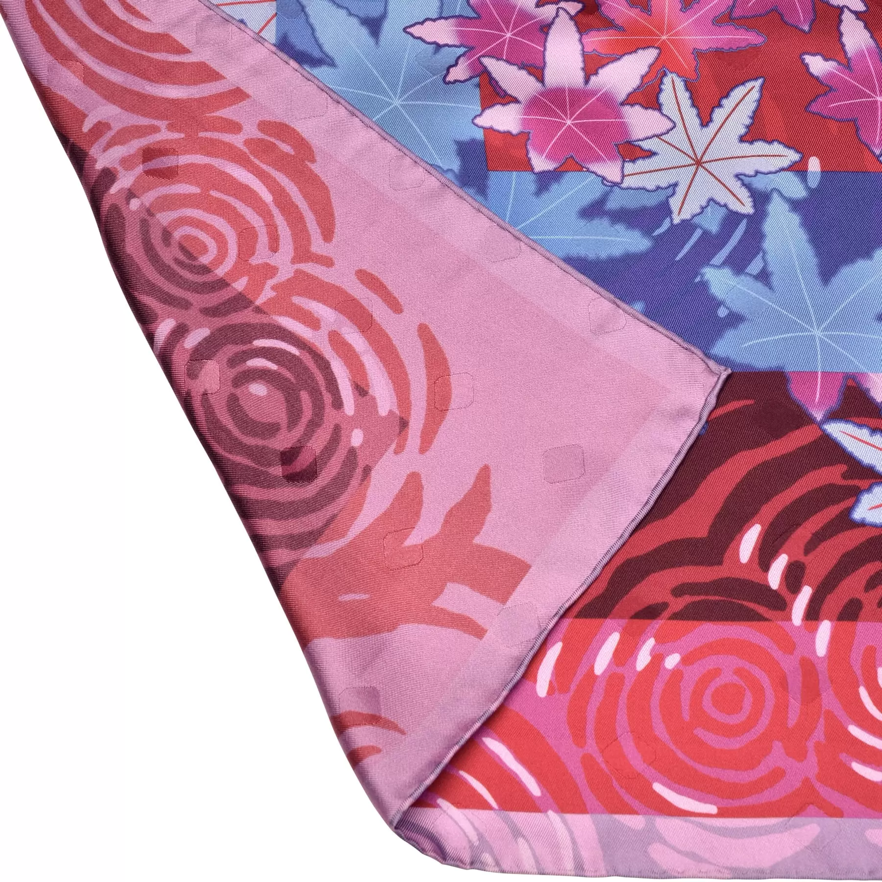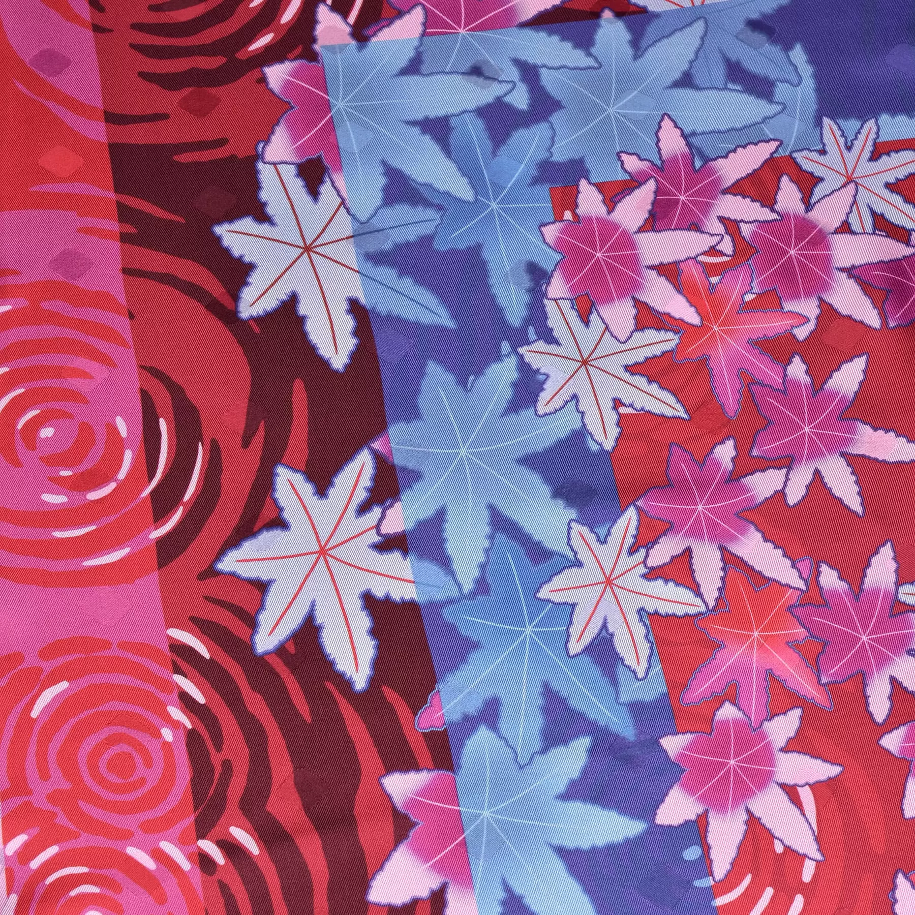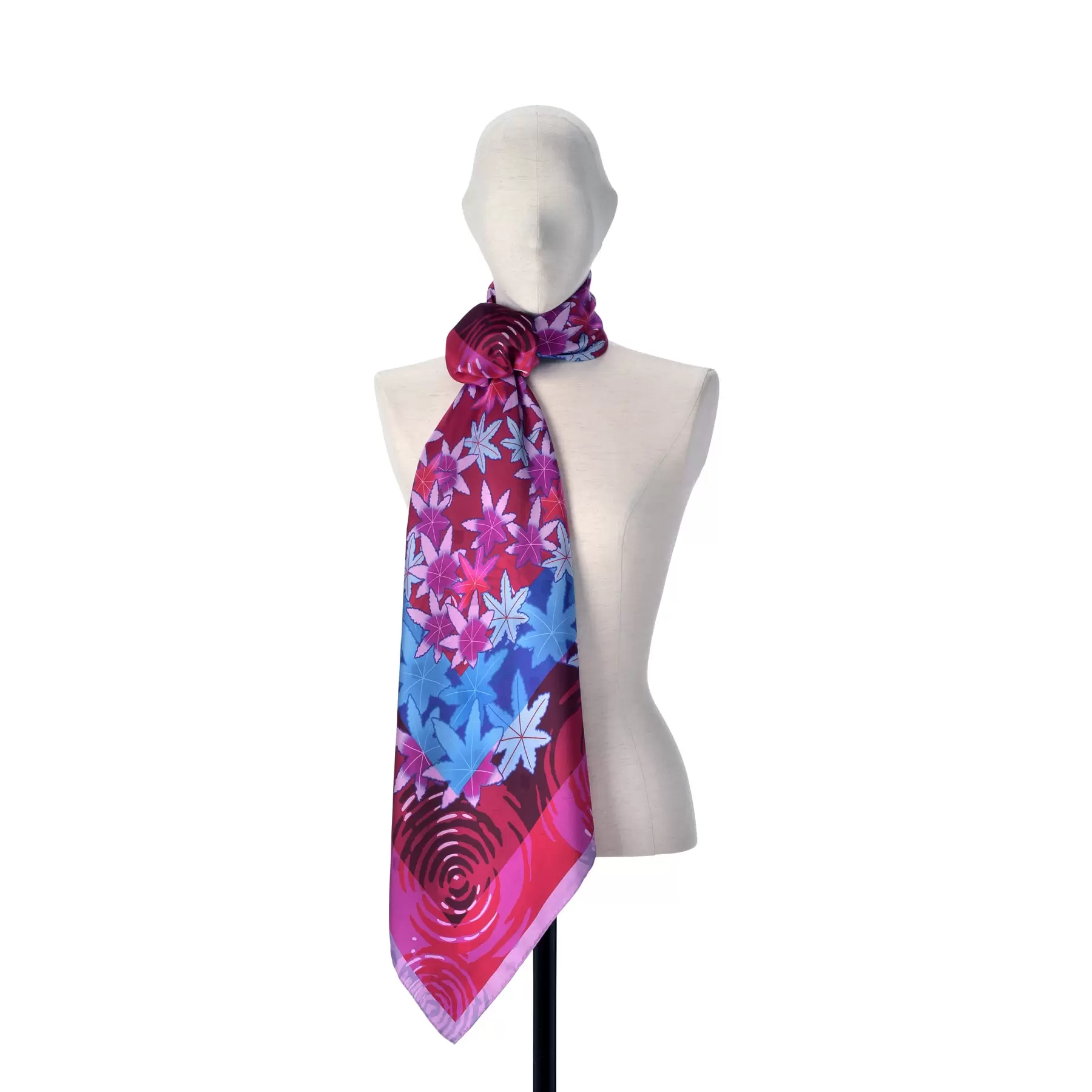 紅葉の時期に京都の町で見られる風情ある景色を表現。水面に落ちたたくさんの楓の葉を、オレンジや赤だけでなくカラフルにカラーリングしました。全体的にフレームのように枠も描かれ、巻いた時にスカーフの上品さを感じさせてくれる一枚です。