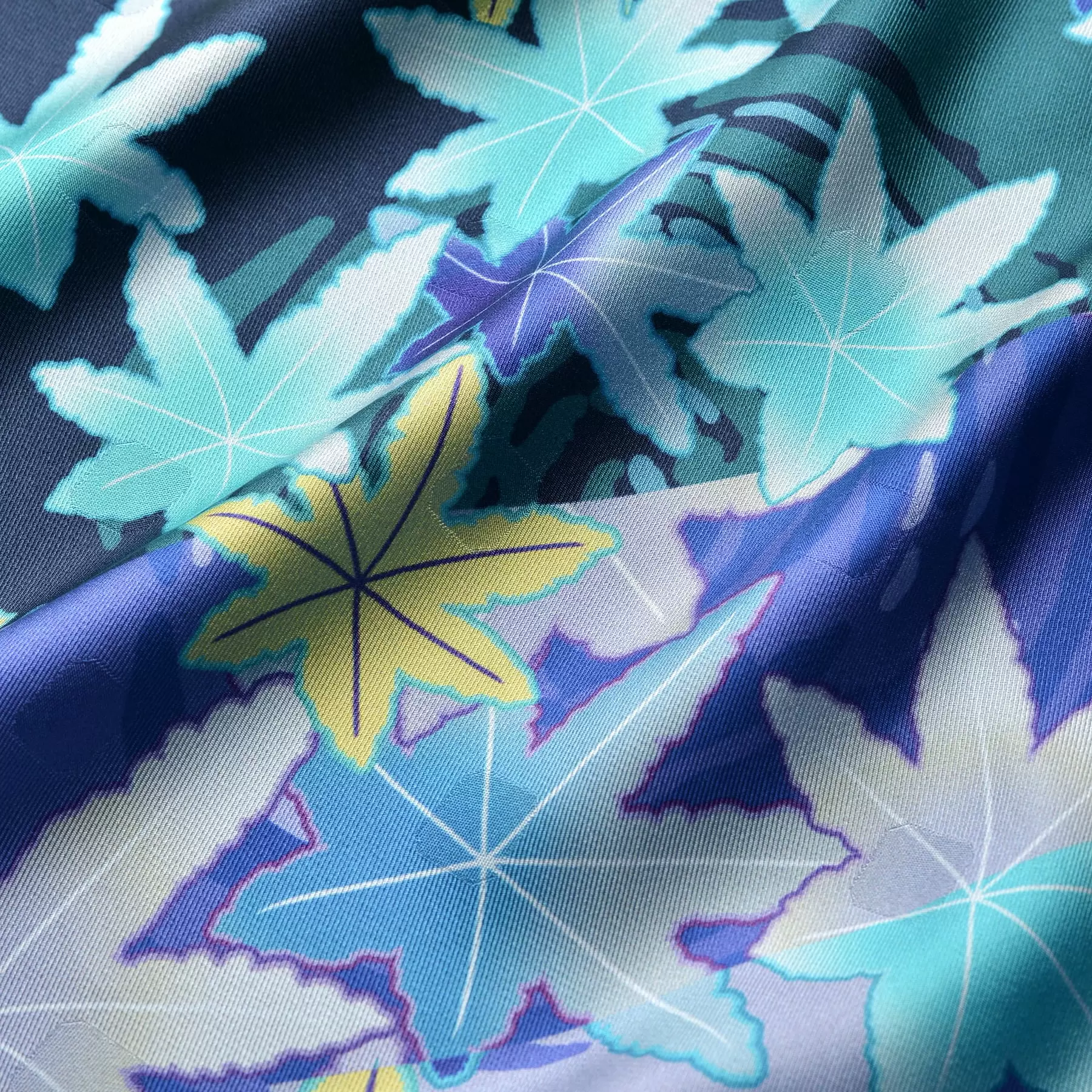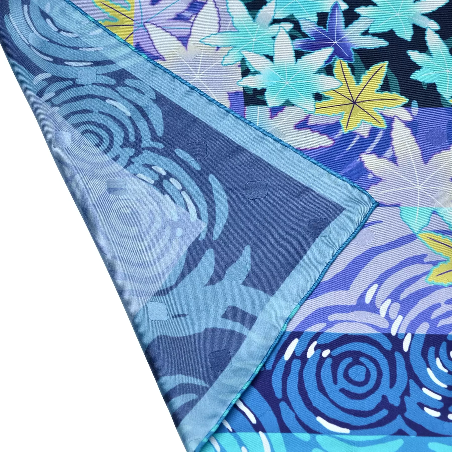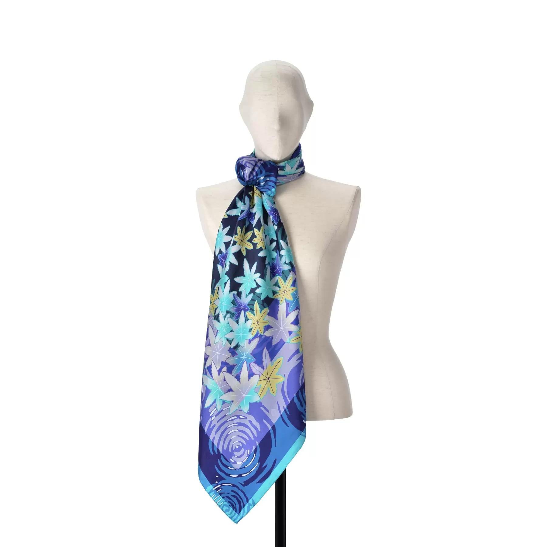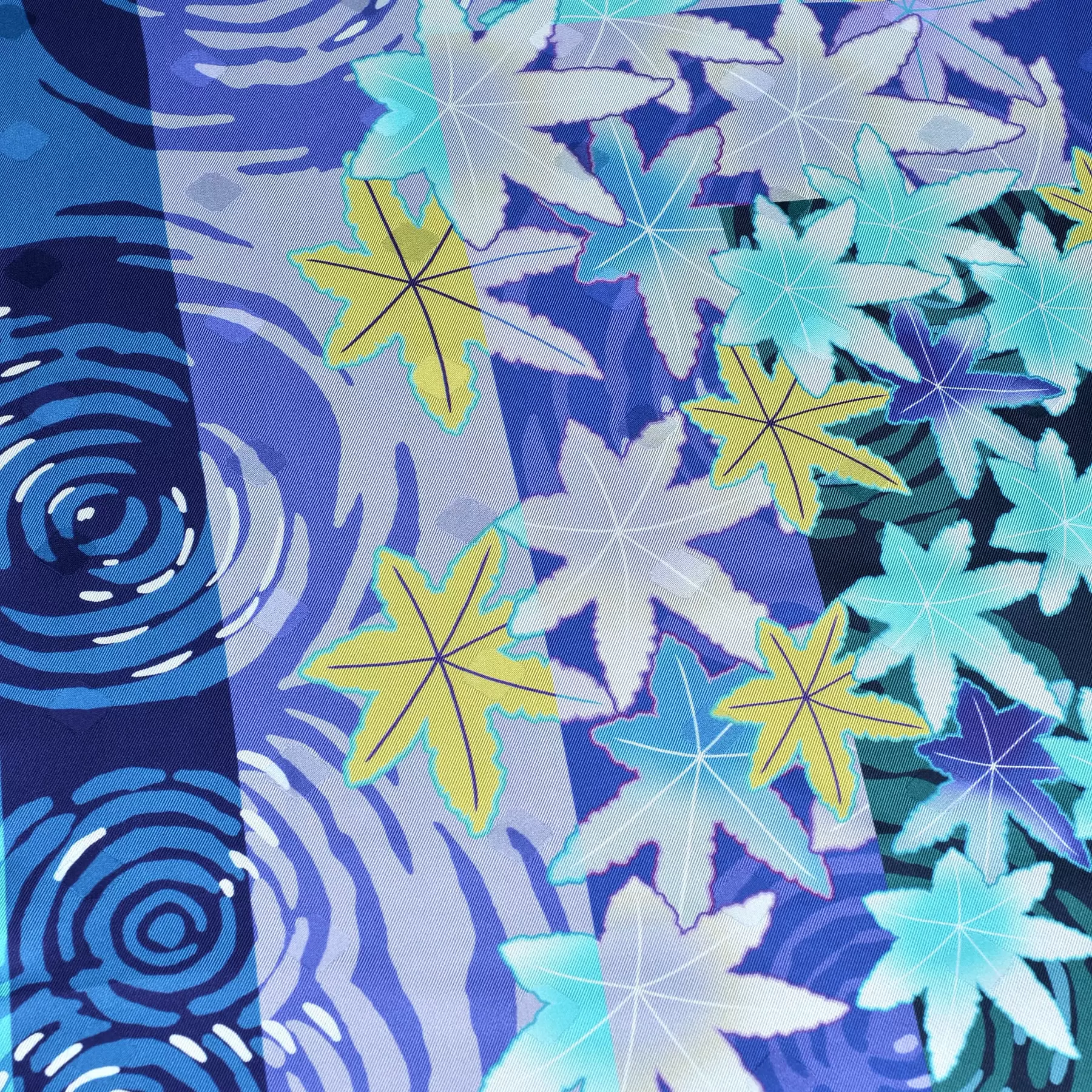 紅葉の時期に京都の町で見られる風情ある景色を表現。水面に落ちたたくさんの楓の葉を、オレンジや赤だけでなくカラフルにカラーリングしました。全体的にフレームのように枠も描かれ、巻いた時にスカーフの上品さを感じさせてくれる一枚です。