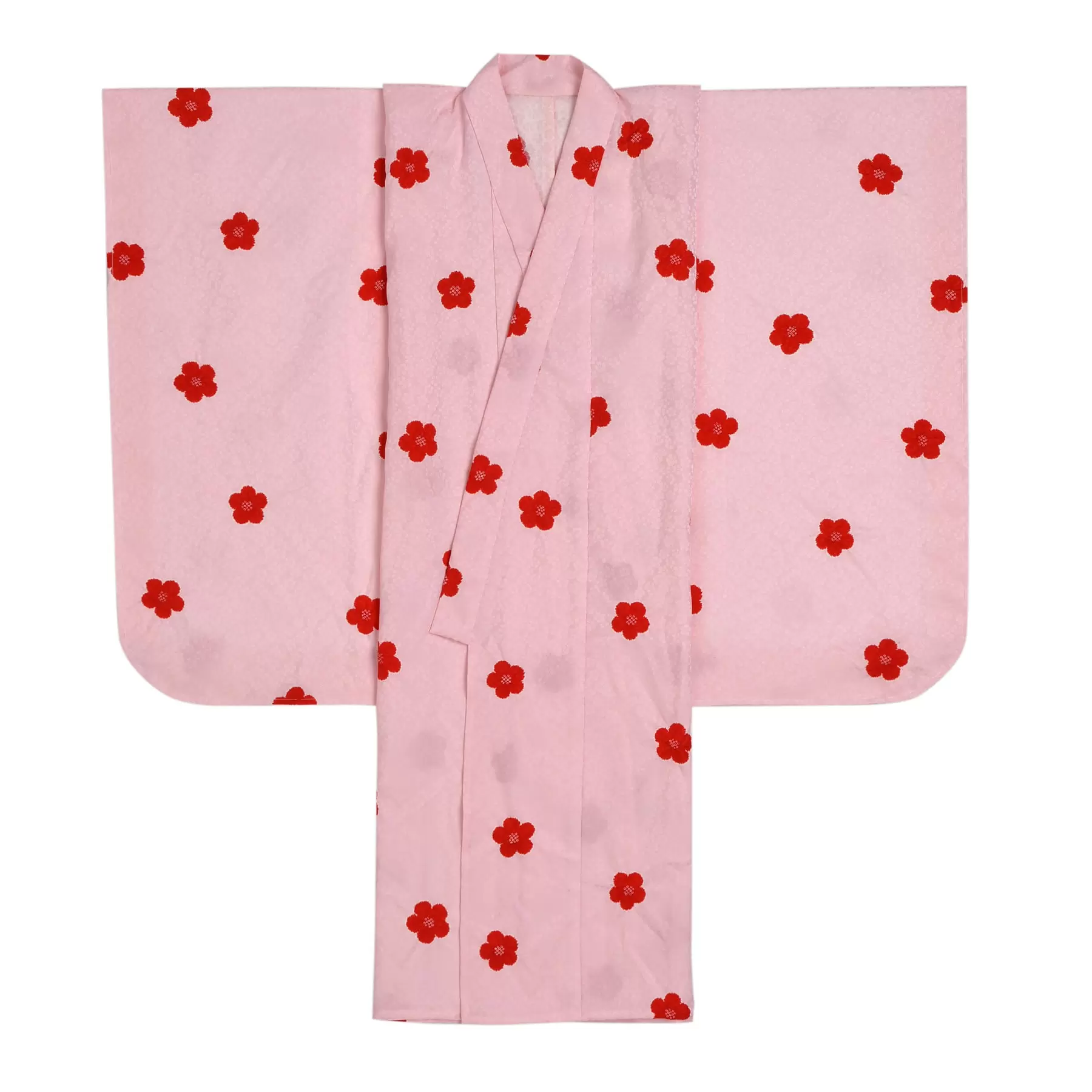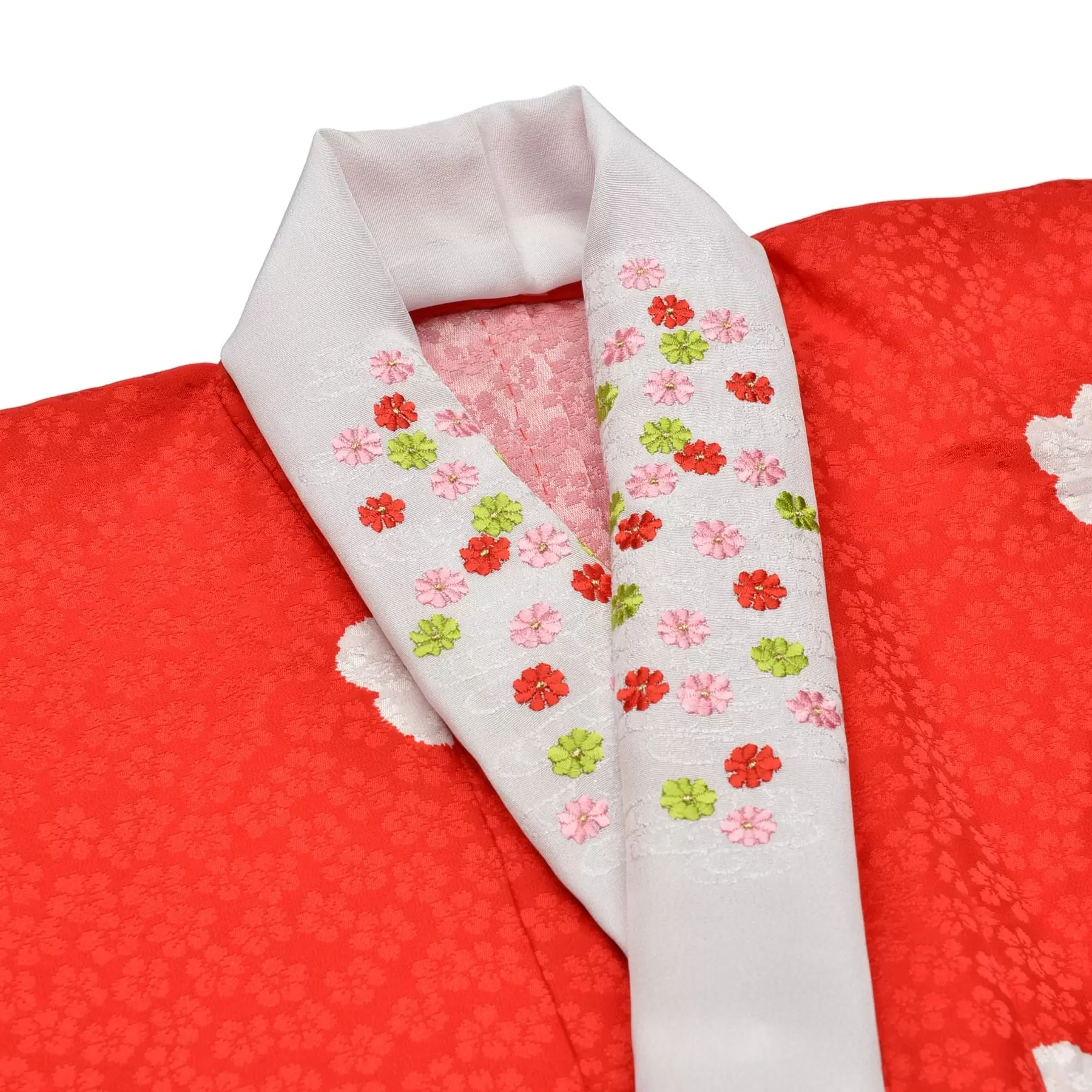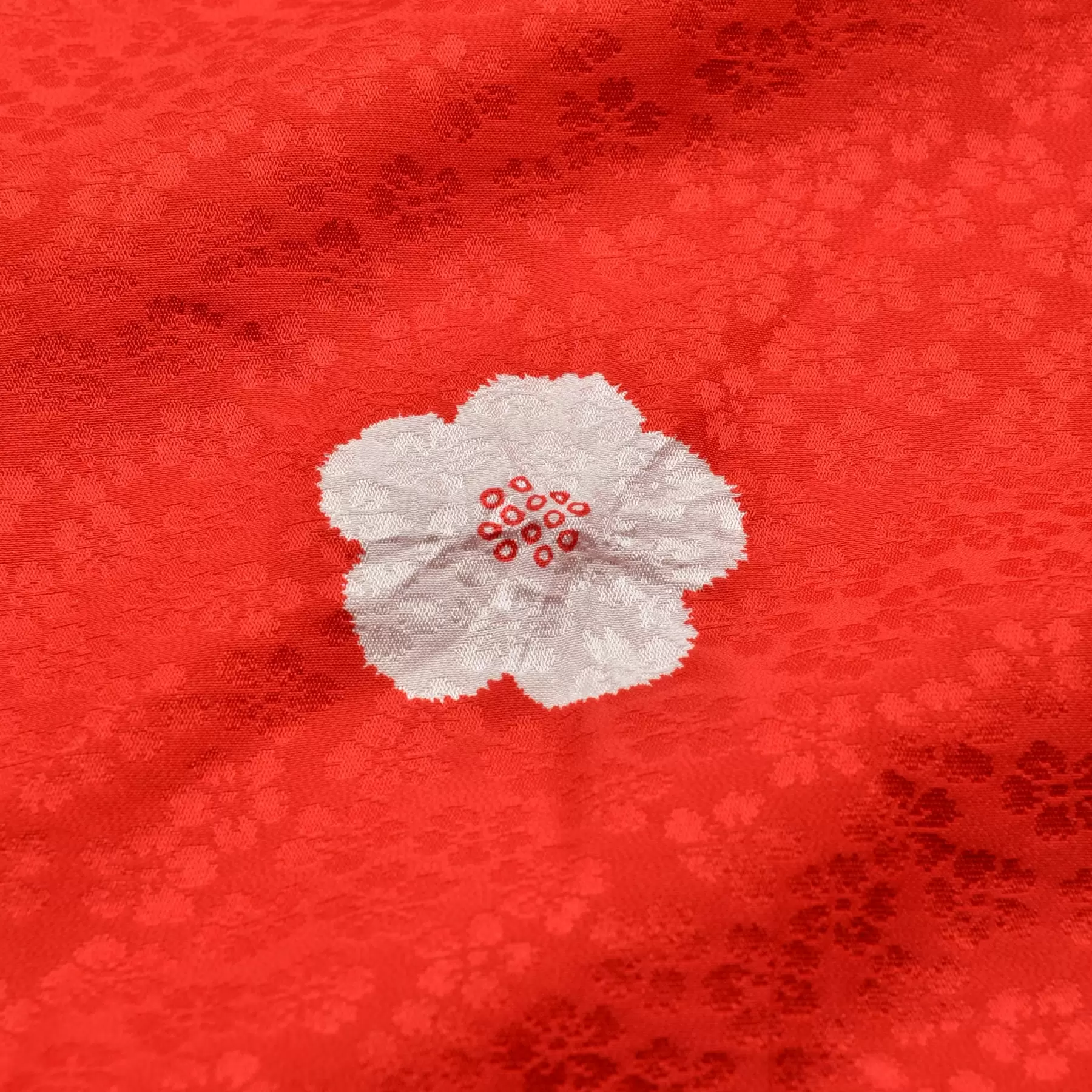 光沢のある生地で地紋は可愛らしく桜の詰めを織り上げました。愛らしい赤の地色に絞りの白の梅が映え、梅の中央の疋田が可愛らしさをプラスしてくれています。