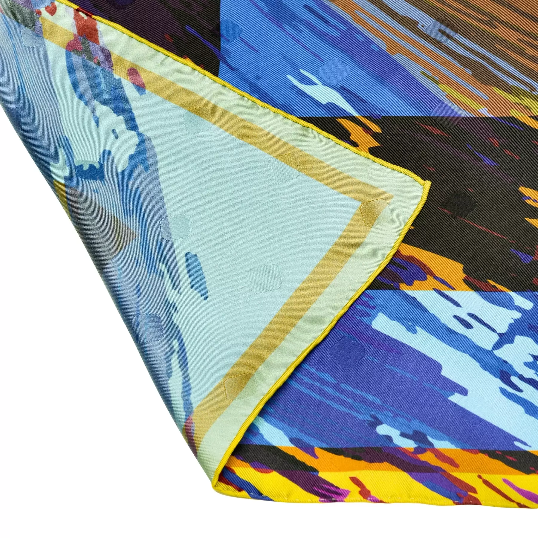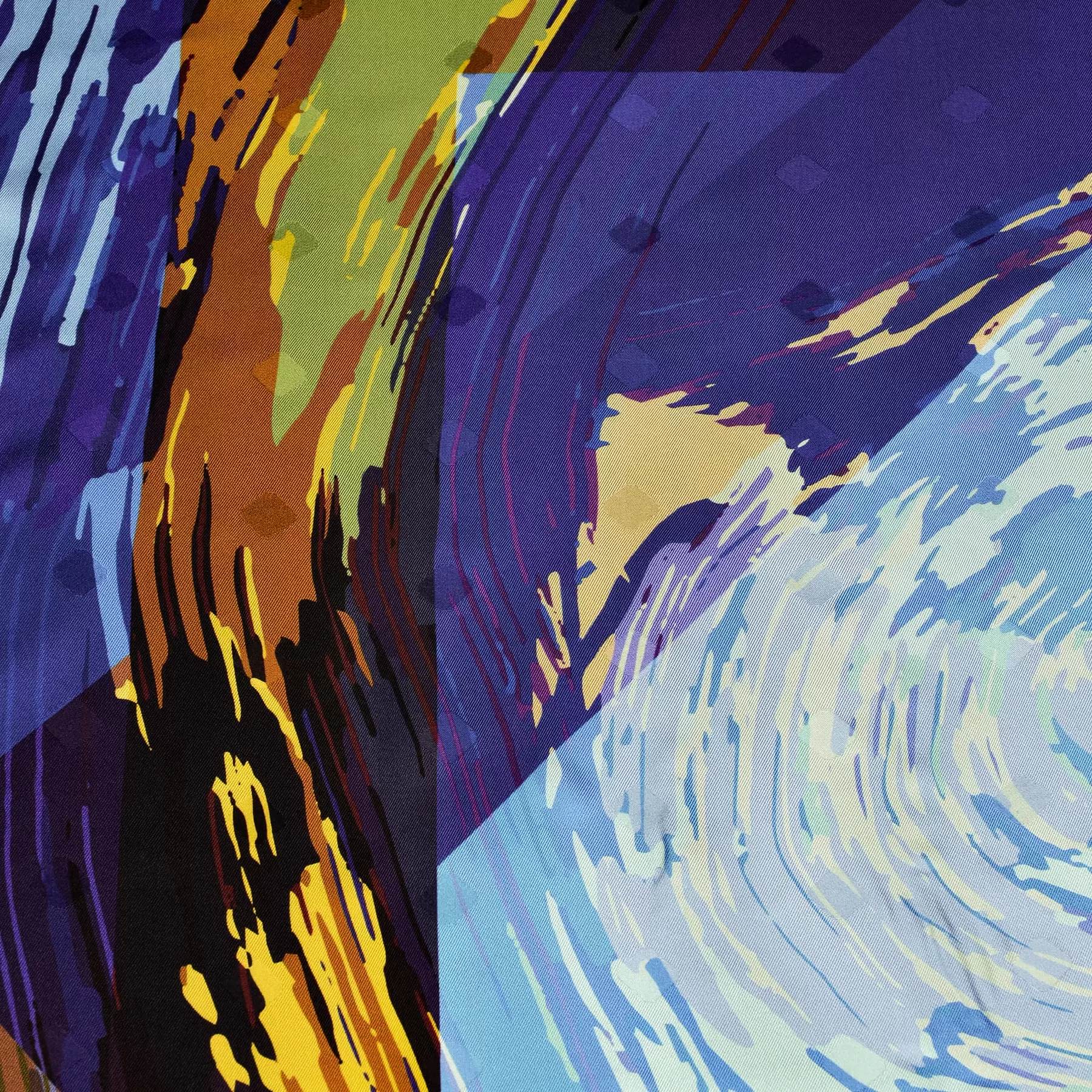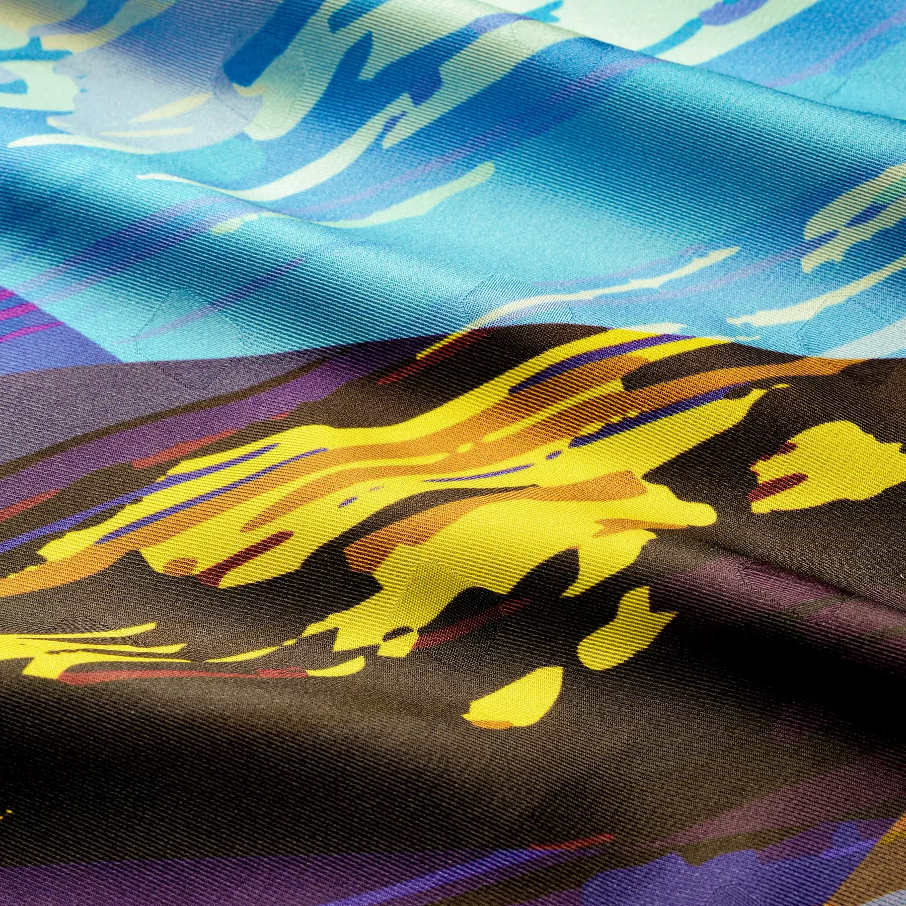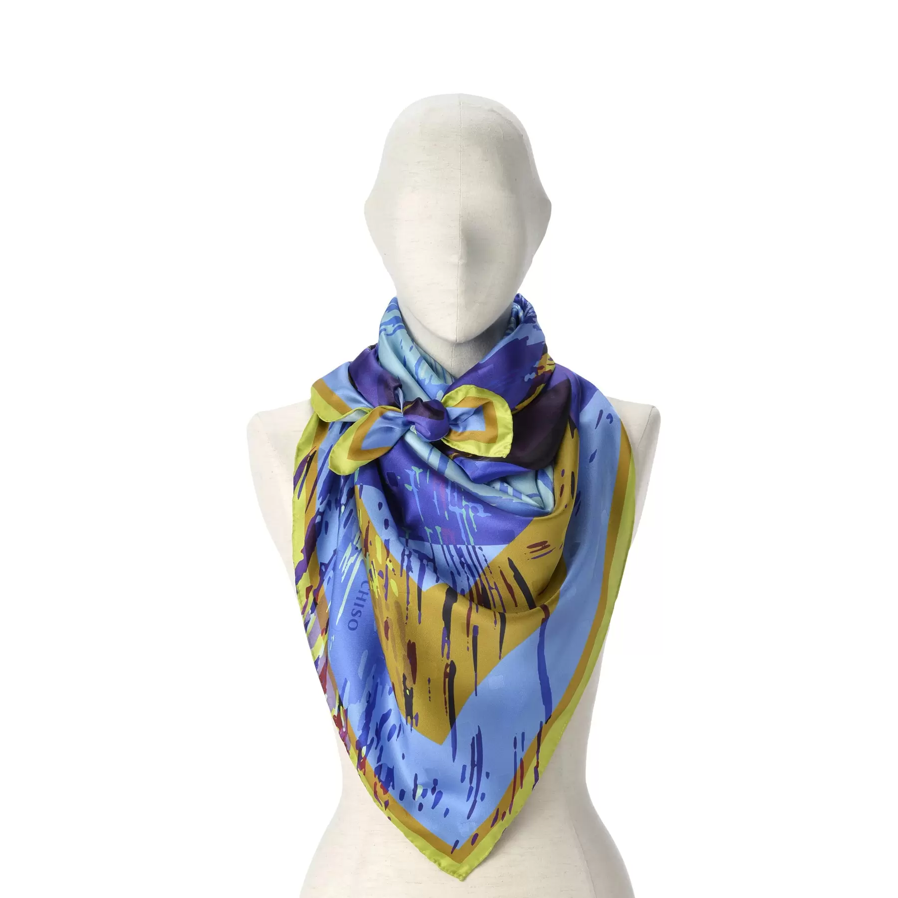 ダイナミックな筆の動きで水を表現した一枚。色の重なりが透き通った水の中にいるようなデザイン。大胆な柄でありながら、スカーフとして身に纏うと幾何学模様のようにも見える、TPOに合わせてスタイリングしやすい一枚です。