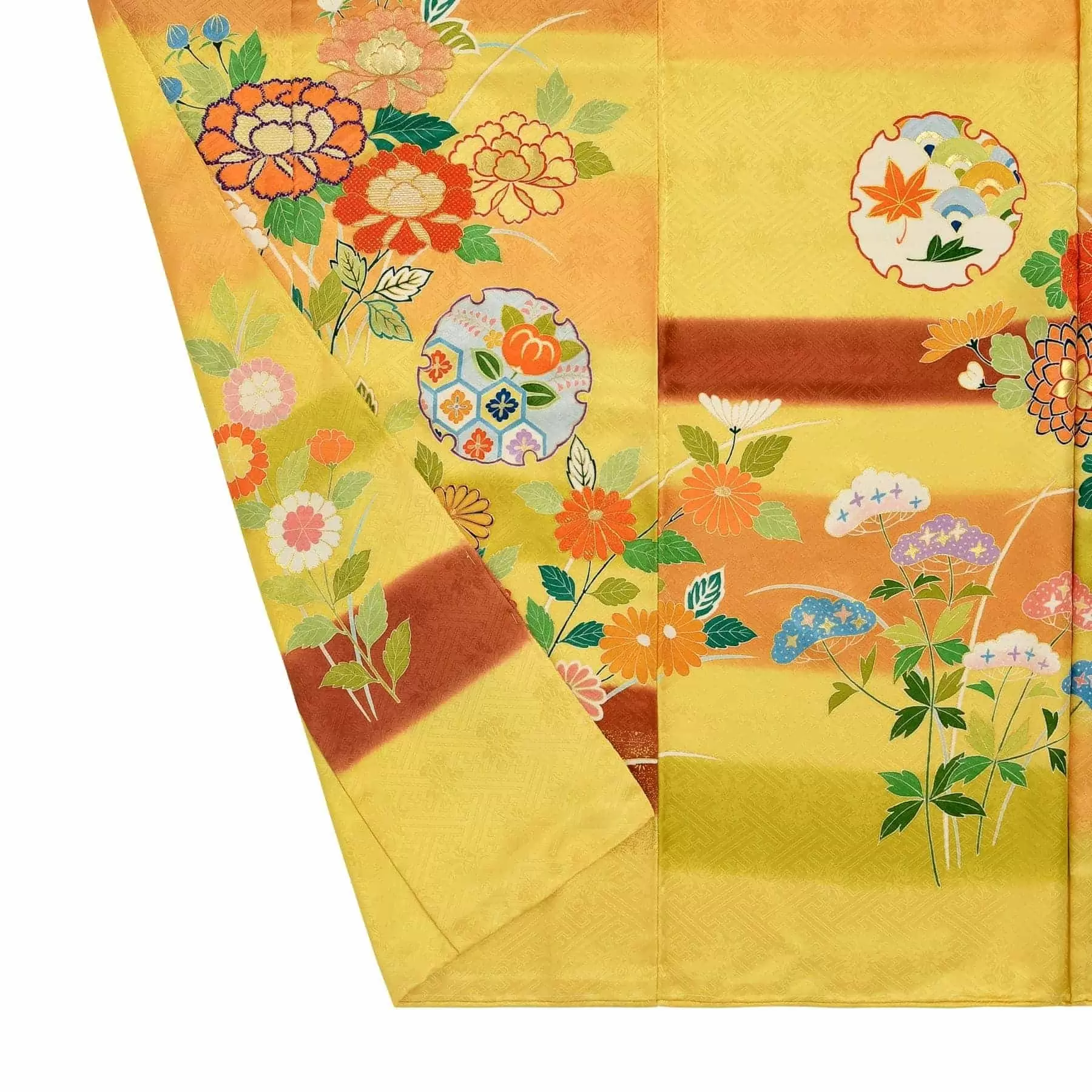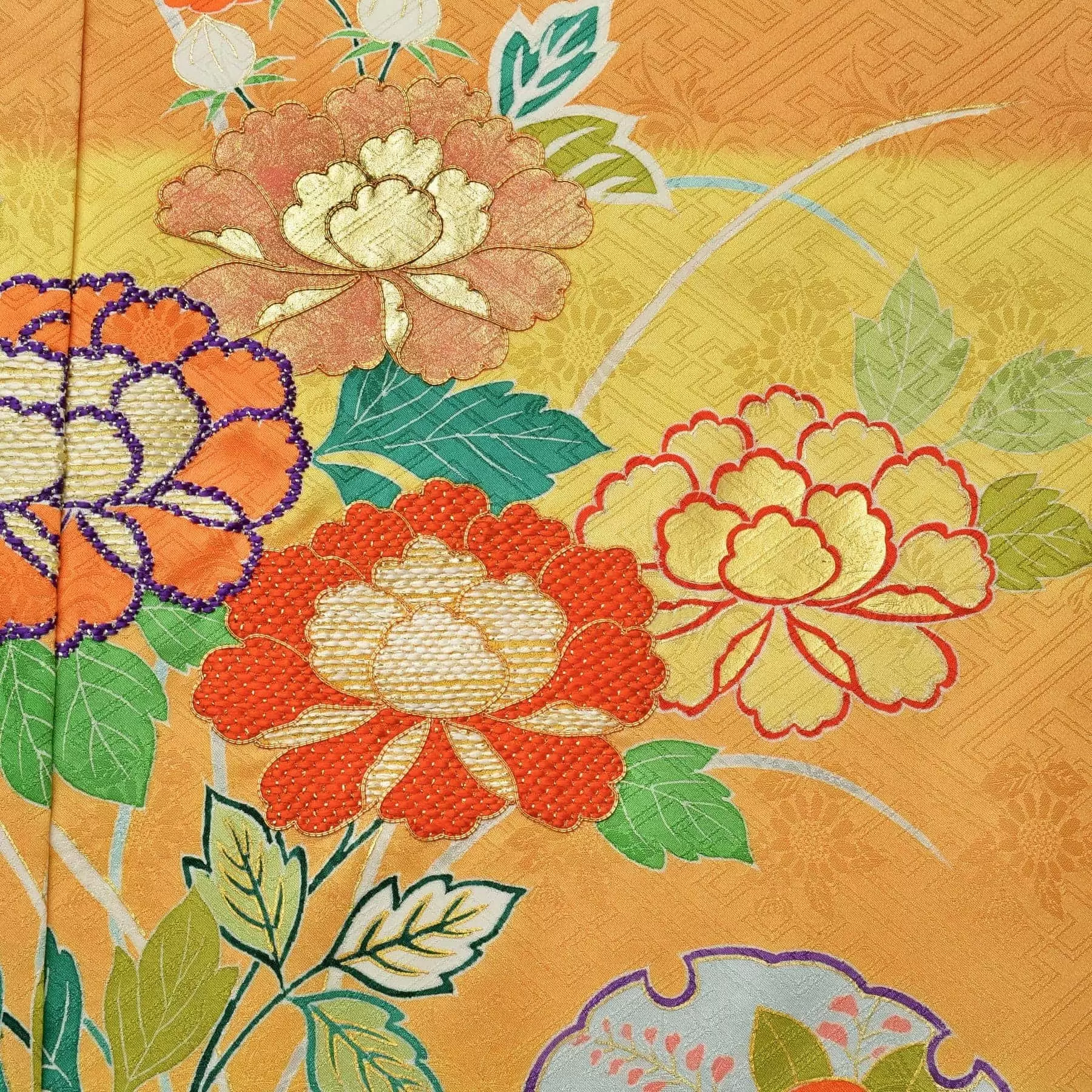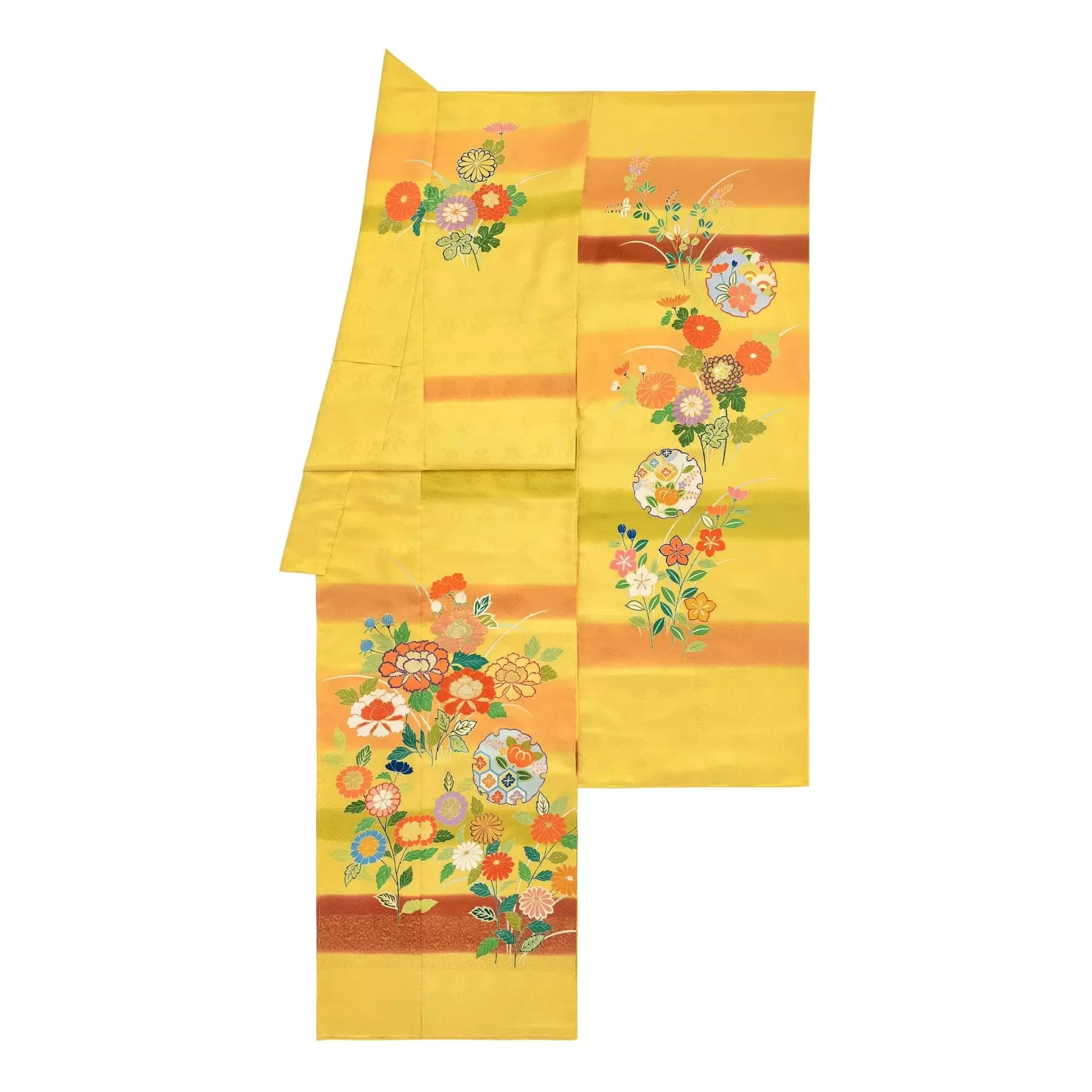 能で使われる衣装である能装束の中でも、豪華で装飾性の高い美術織物である唐織(からおり)の装束を染めで表現した1点ものの振袖です。自然と共に生きてきた日本人の美意識の結晶である、四季の草花を色鮮やかに描き出した柄には、時を経ても変わることのない美が宿っています。