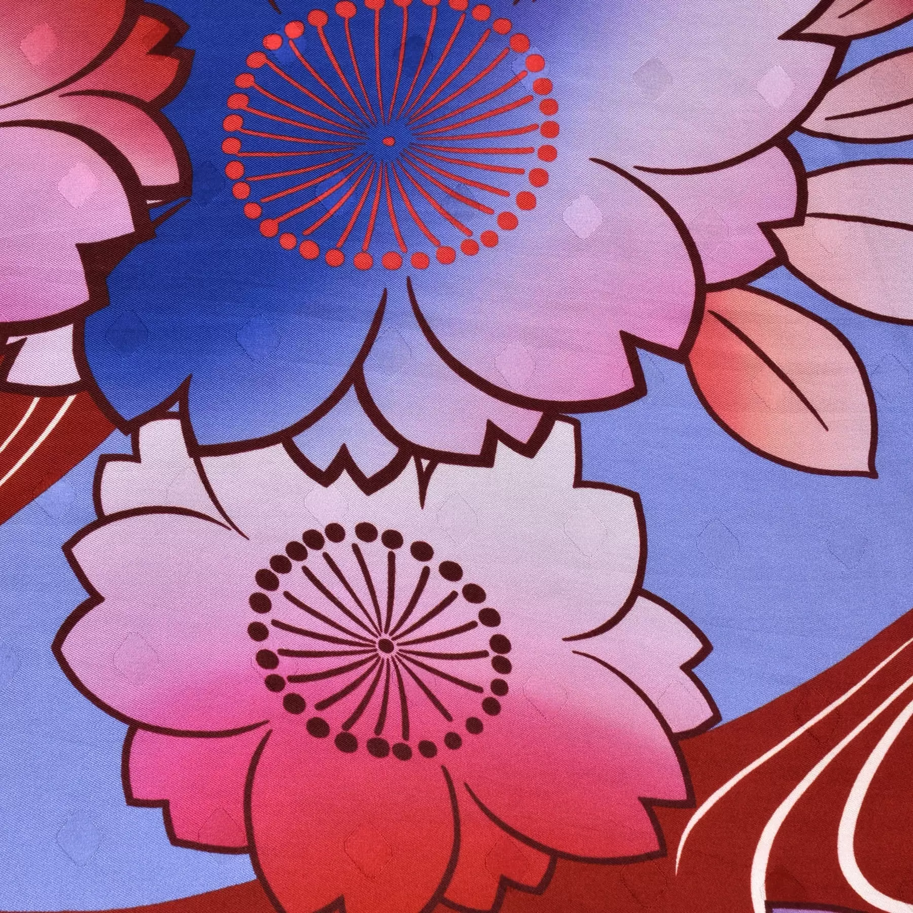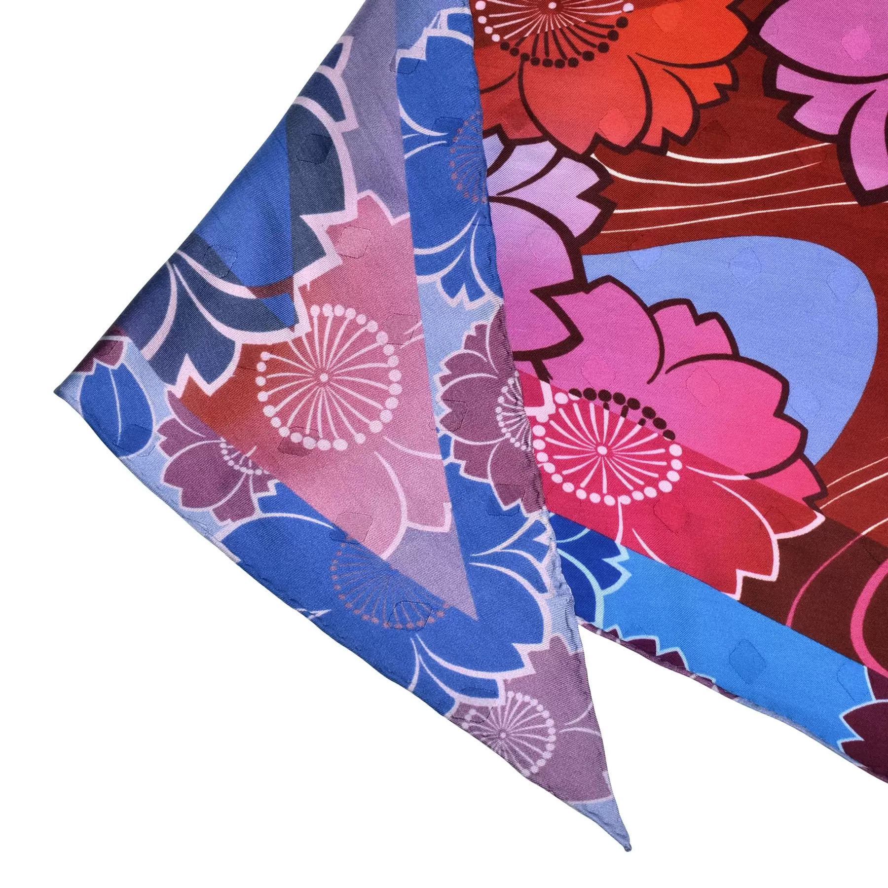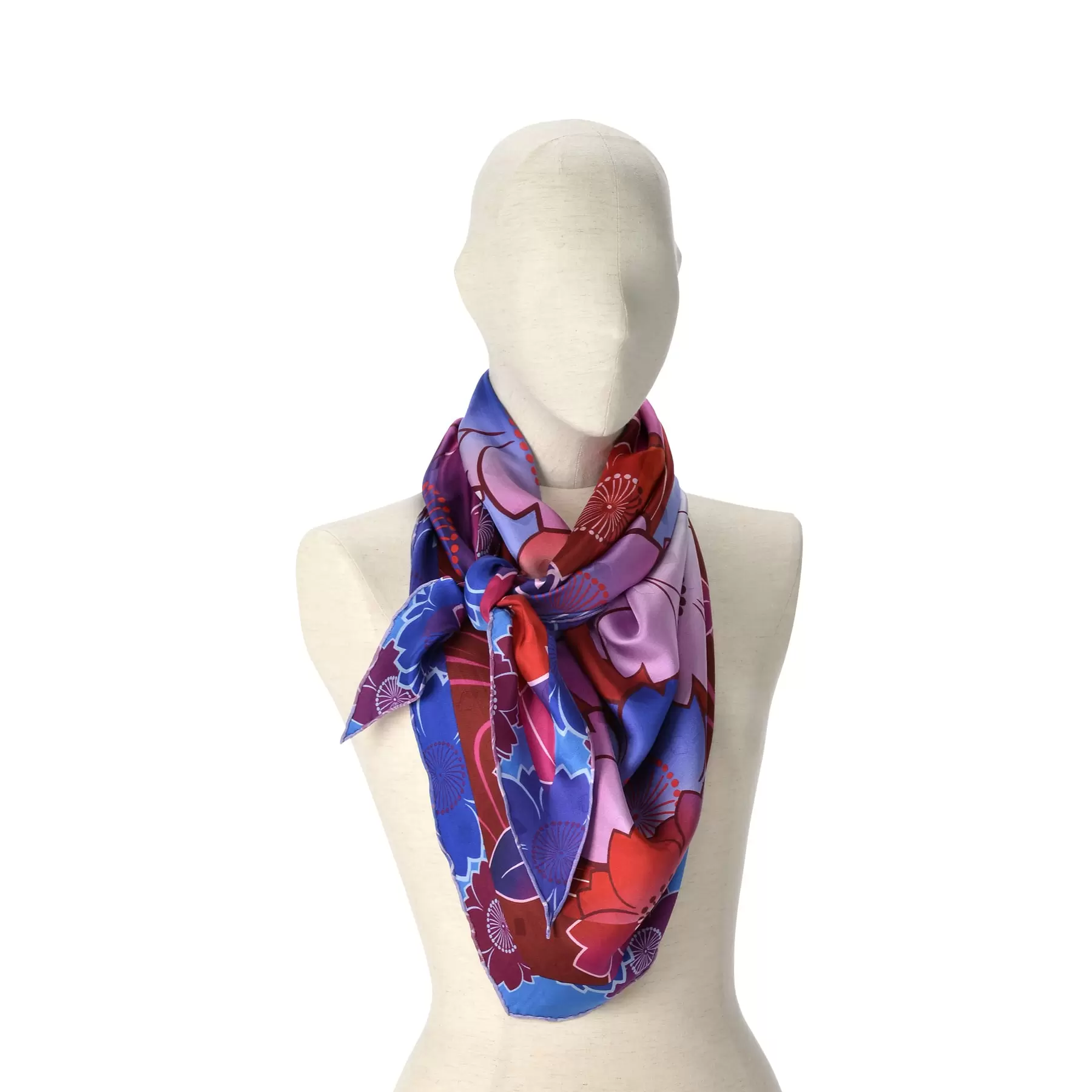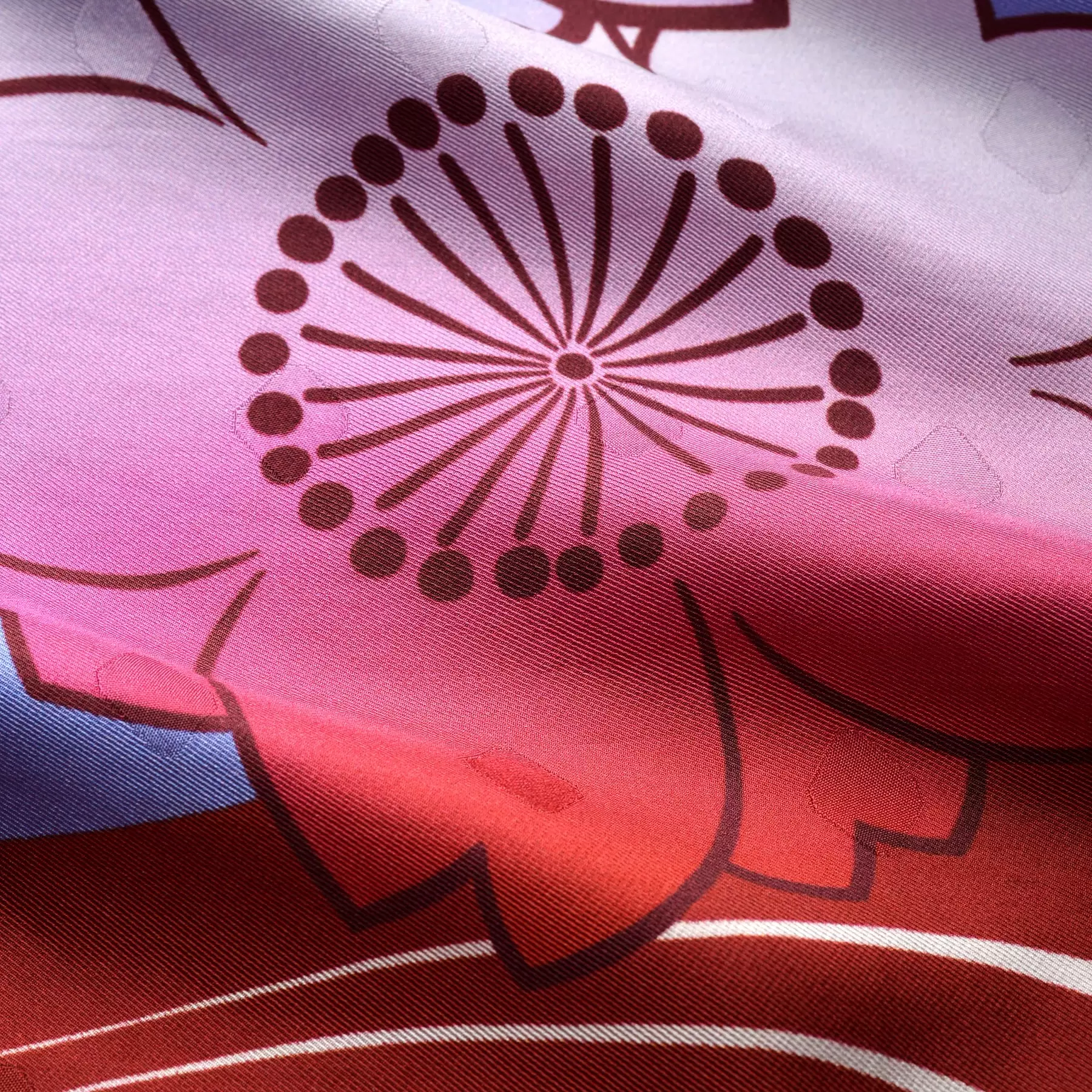 水面に漂う桜を表現。桜の花びらは暈しで表現され、動きと色彩に奥行きを感じさせてくれます。ひし形は巻きやすいだけでなく、美しいラインが自然と現れるおすすめの形です。スカーフの端はすべて職人が一枚一枚手で縫製して仕上げた逸品。どんな装いも華やかにしてくれるスカーフです。