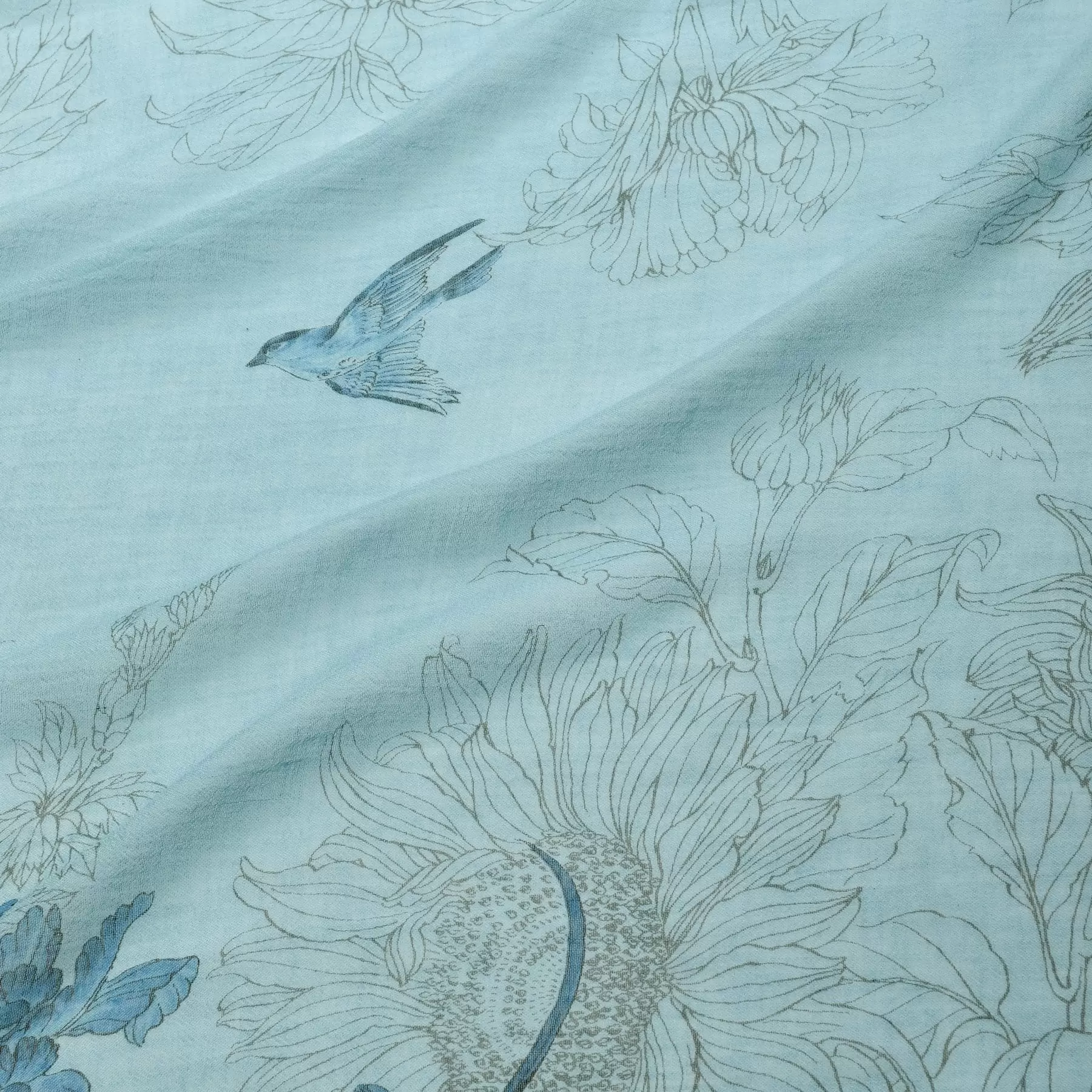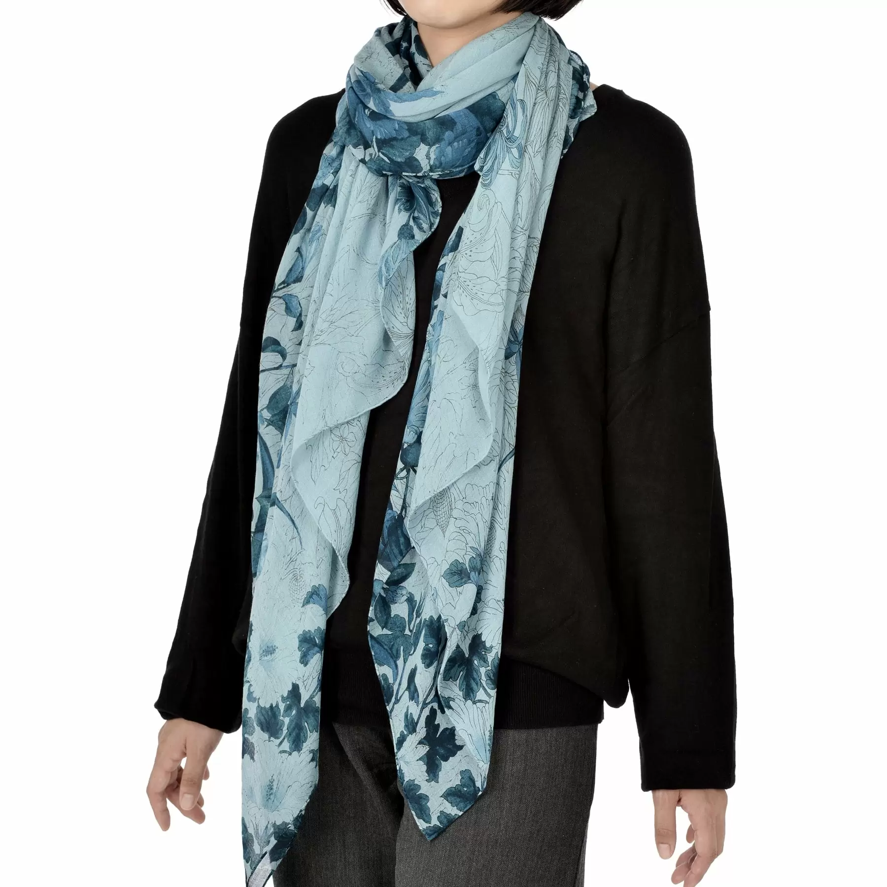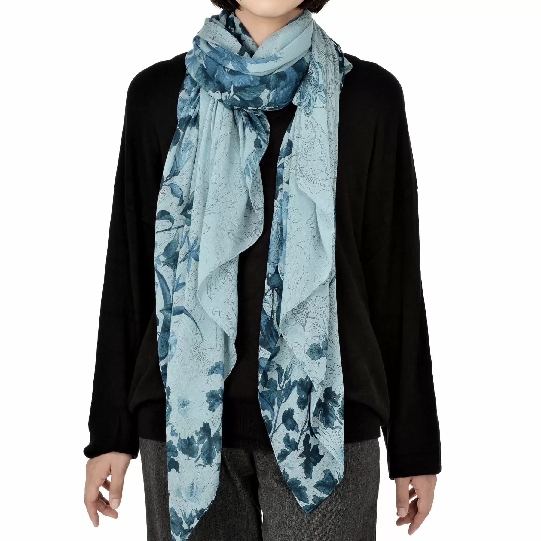 千總スカーフの中で人気の高かった「景年花鳥」の柄をリデザインした一枚。森の中で寝転んで空を見上げたようなほっと一息つける優しいデザインです。