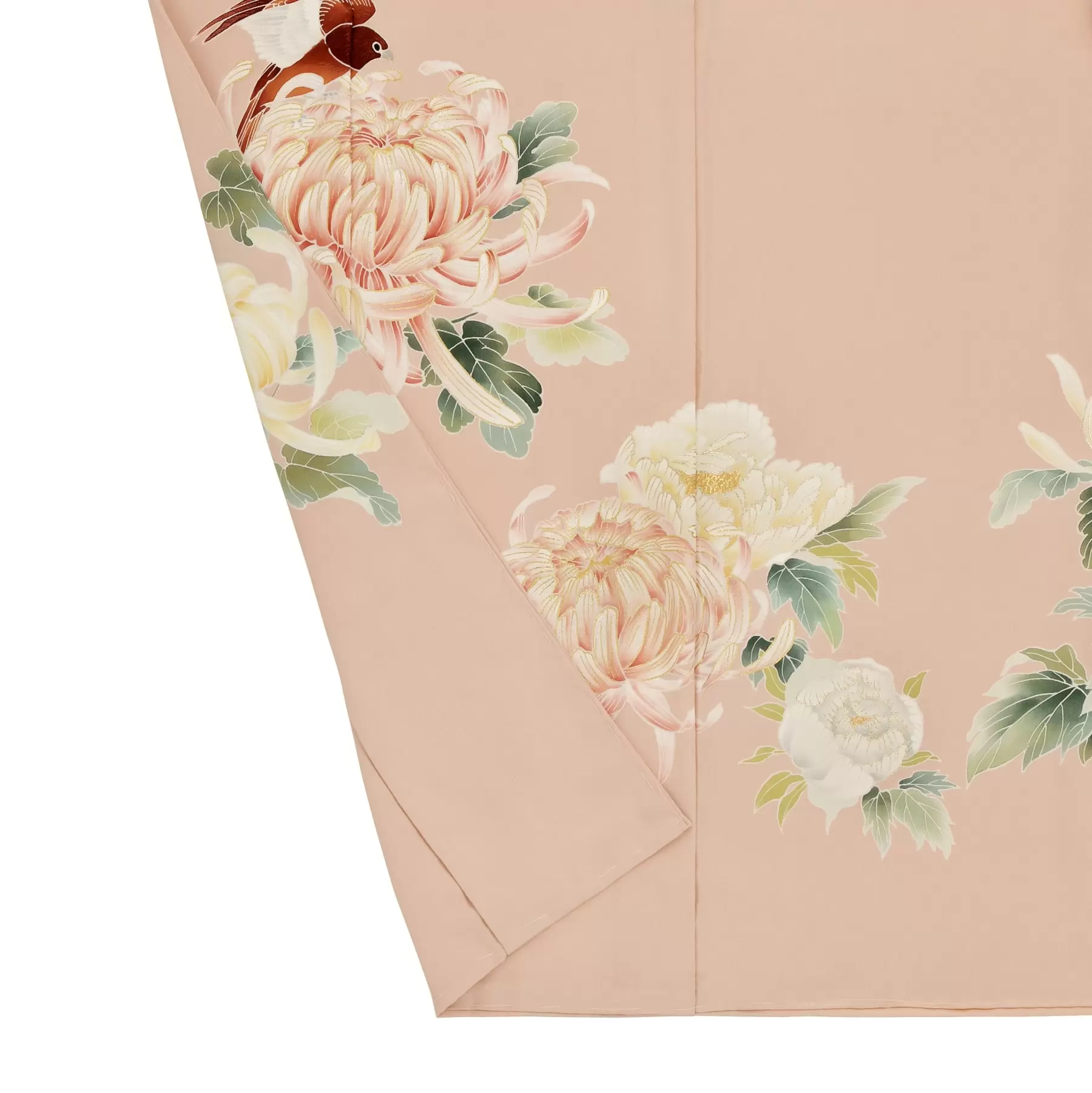 今を盛りと咲き誇る牡丹と菊、春と秋を代表する2種類の花だけを大胆にデザインしました。余白を持たせた構図の中に浮かび上がるように配置された牡丹と菊の大輪の花々が、壮麗な美しさを演出しています。花の生命力と芳醇な香りに誘われそっと寄り添う鳥たち。
