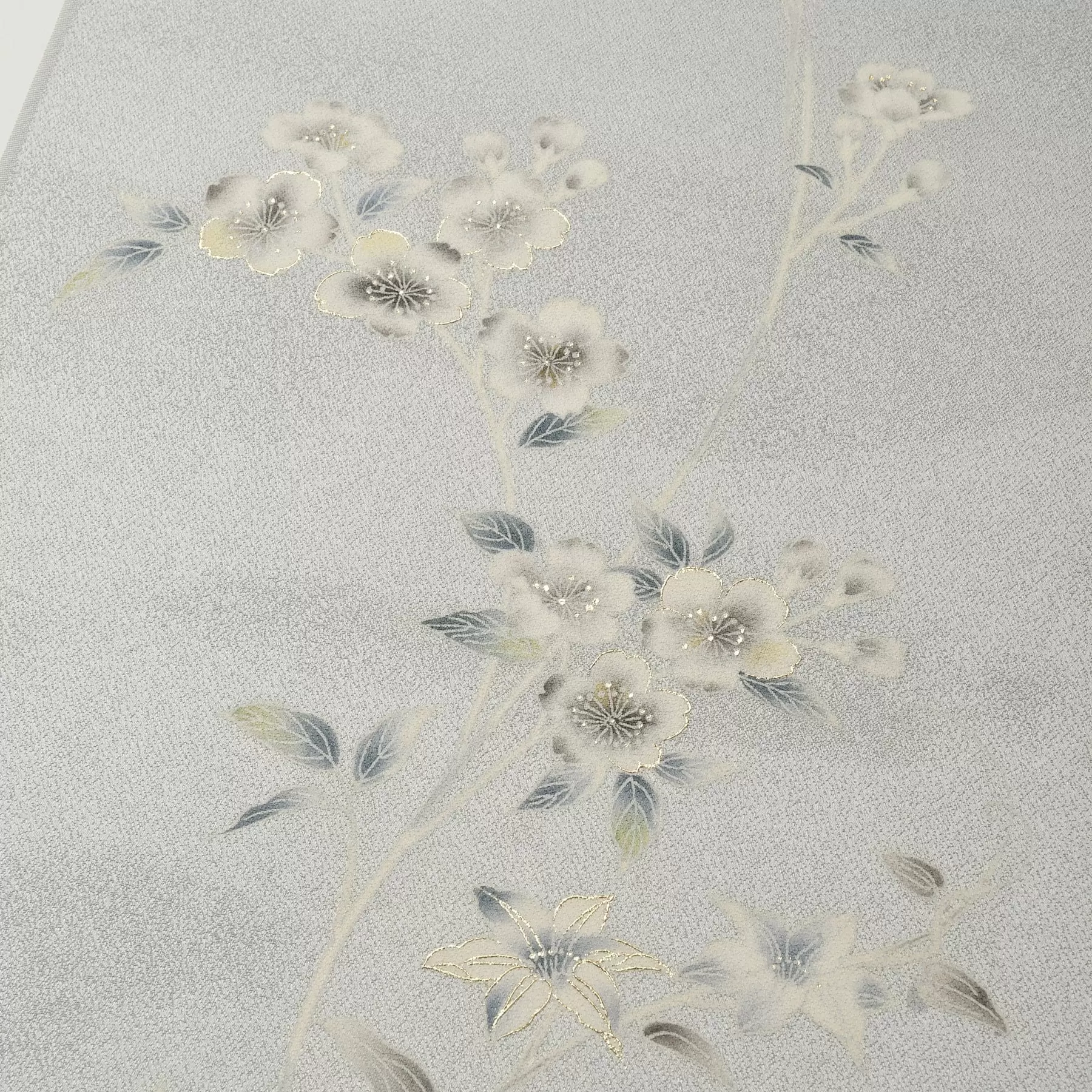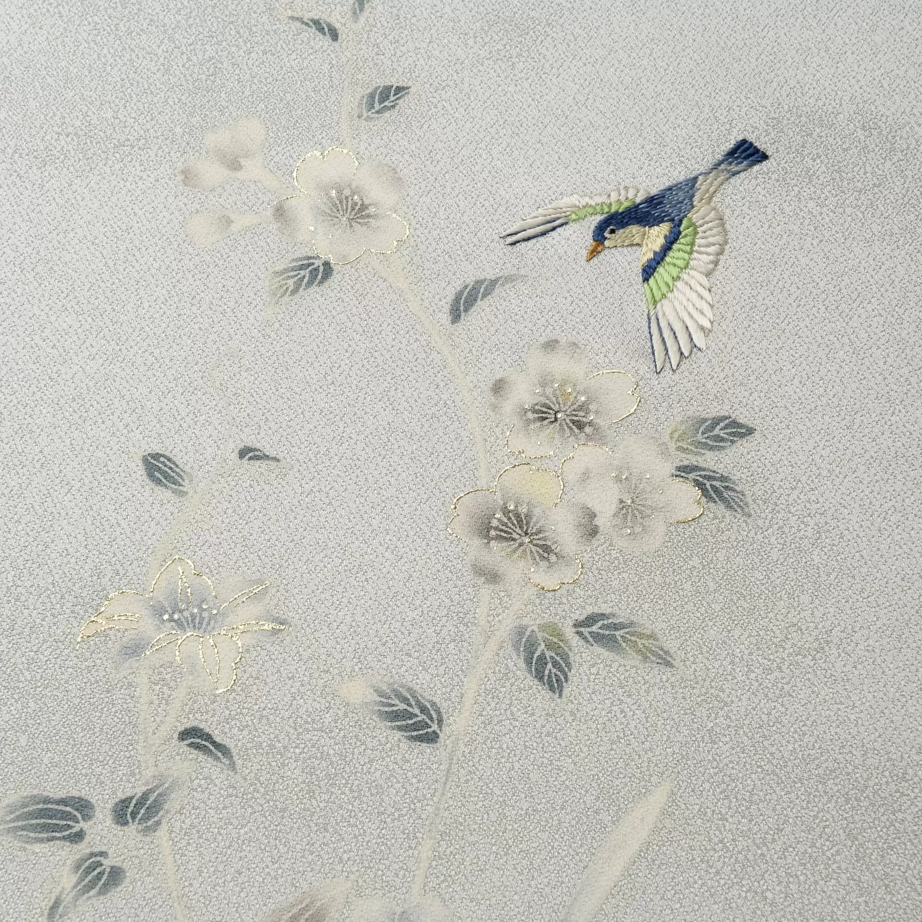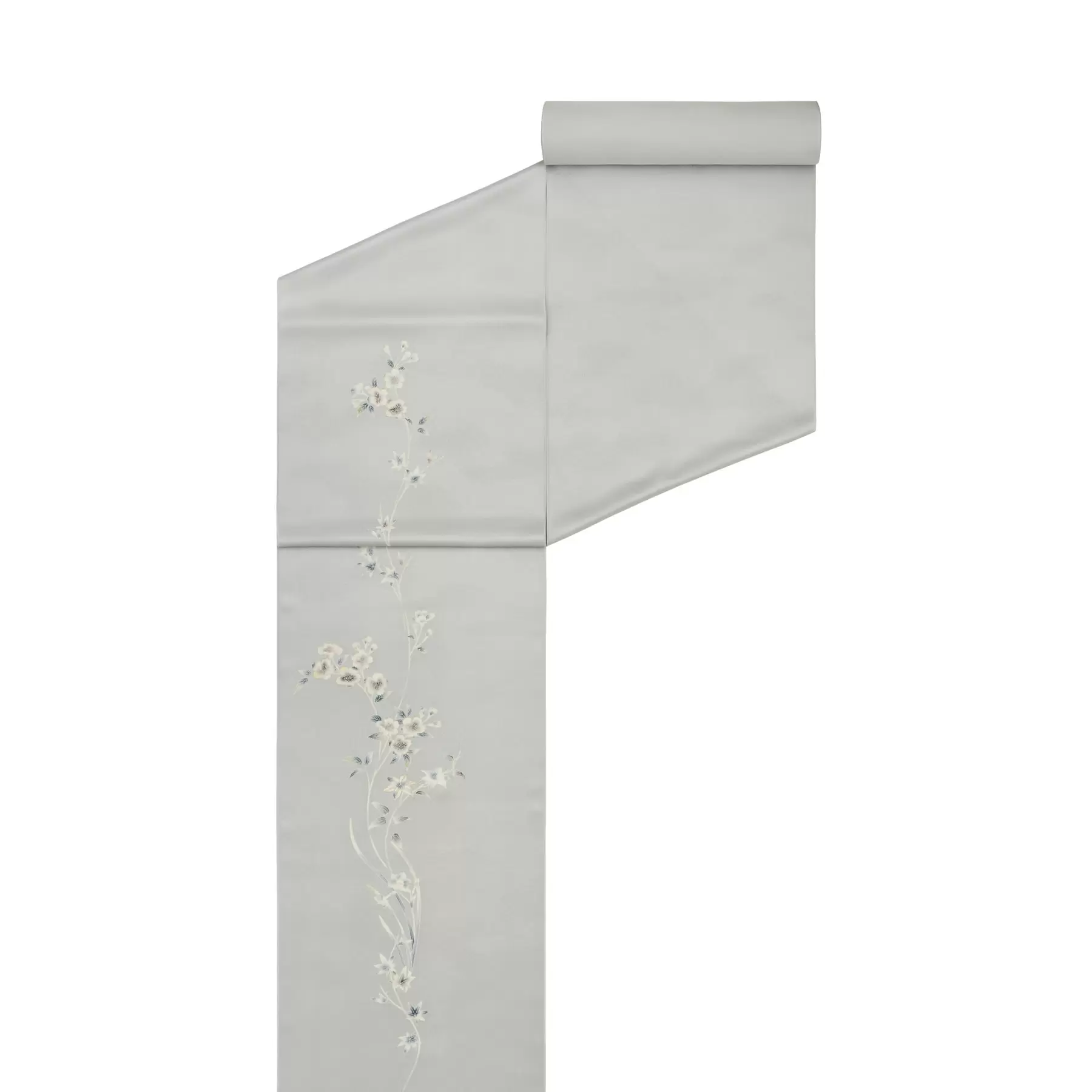 湧きたつように伸びやかに咲く花々に幸せを呼ぶ一羽の青い鳥が舞い降りる、そんな物語をデザインに描き上げました。淡い色調で染め上げた光沢のある生地の上に、白を生かして描かれた花々が浮かび上がり、まるで深い森の中でそこにだけ光が差し込んだような幻想的で美しい雰囲気を醸し出しています。