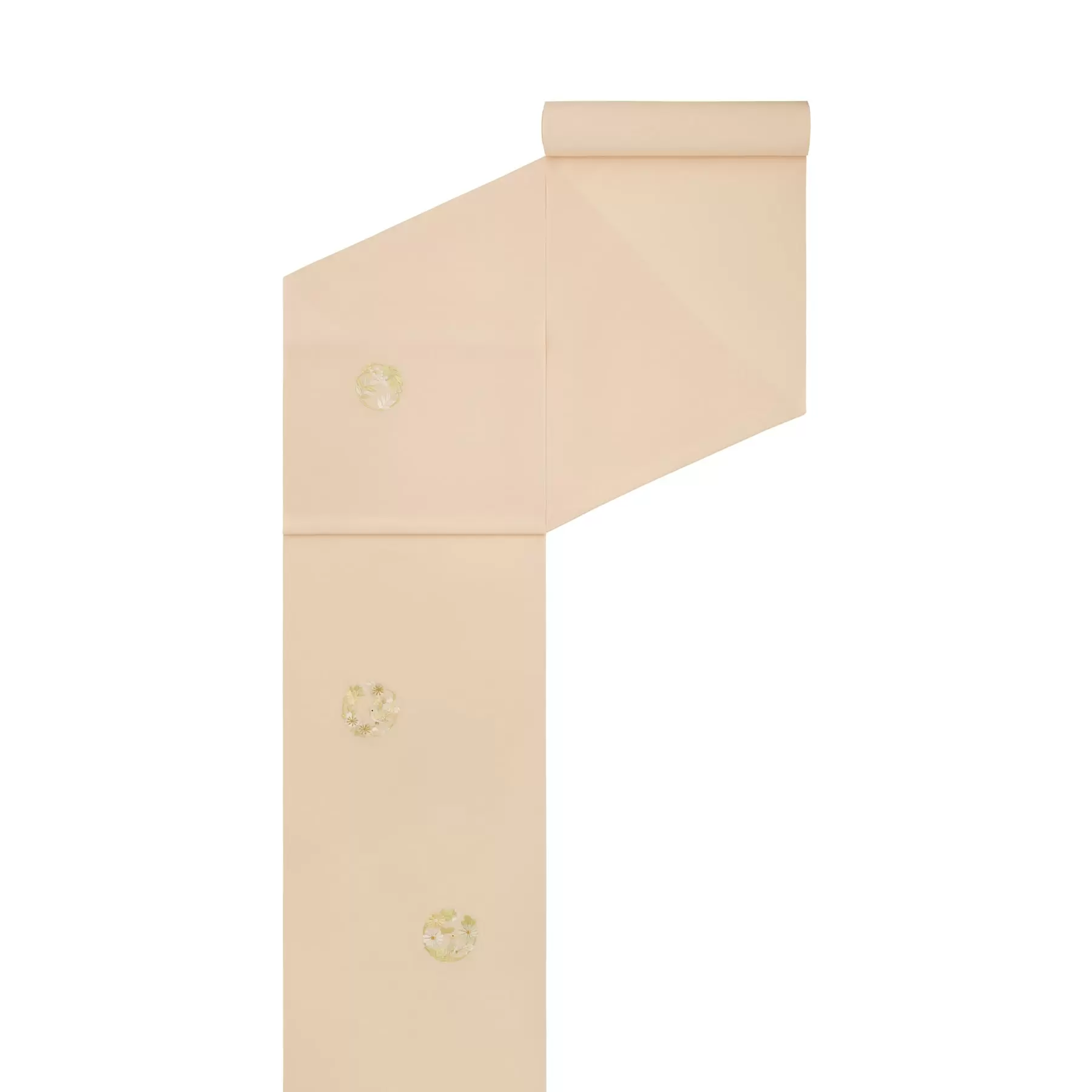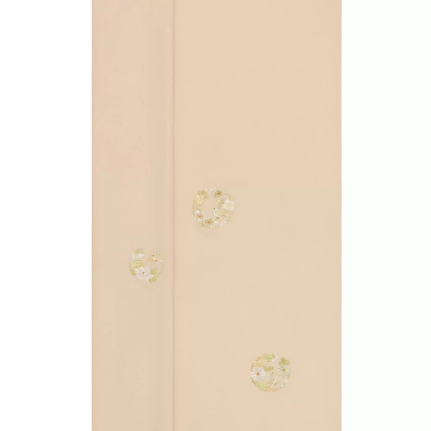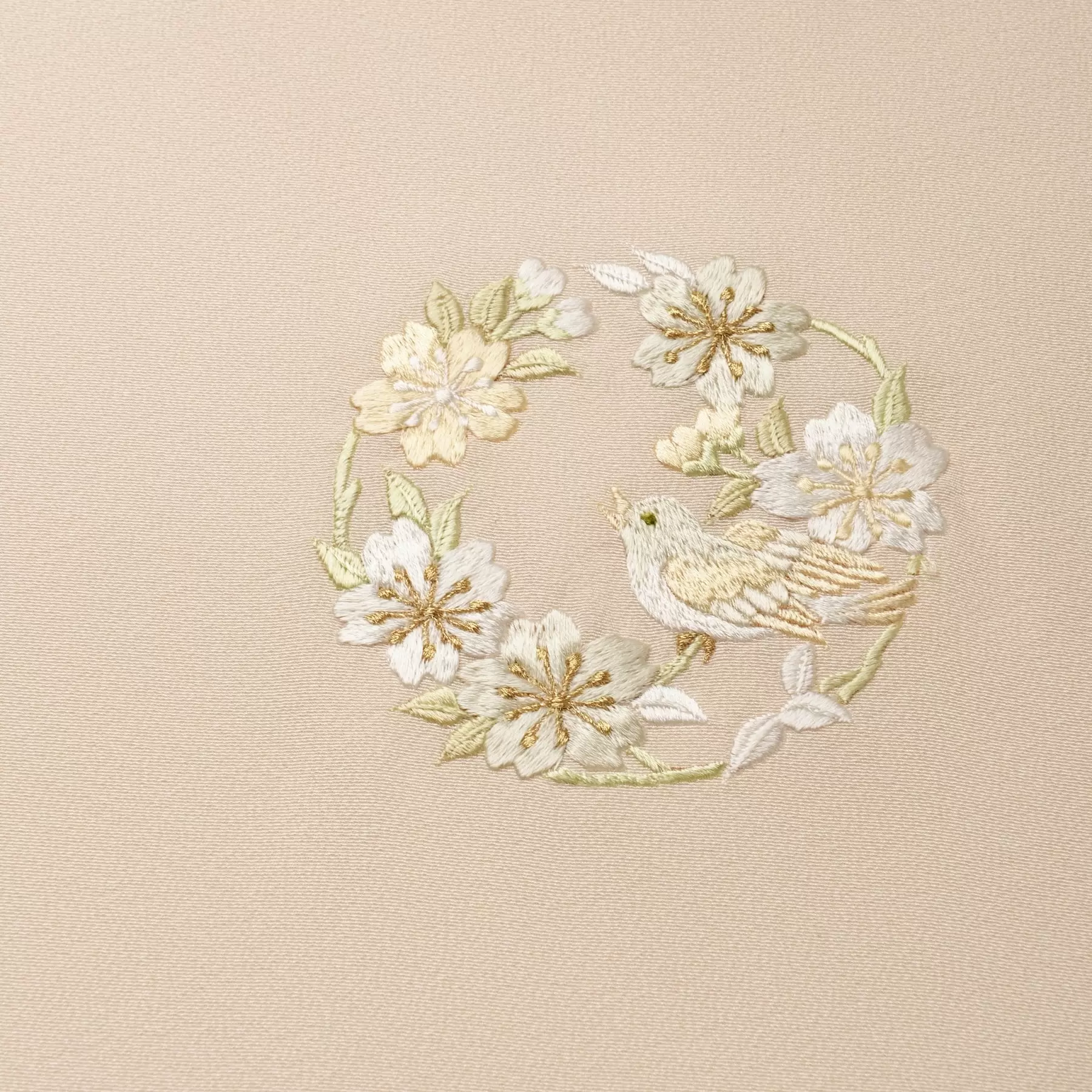 四季の花で作られた美しいリースの窓辺で遊ぶ鳥の姿。今にも鳥のさえずりが聞こえてきそうな愛らしいデザインの付下です。地色の持つやわらかな雰囲気に合わせて、刺繍を白や同系色の淡いトーンの糸色でまとめ、上品に仕上げました。