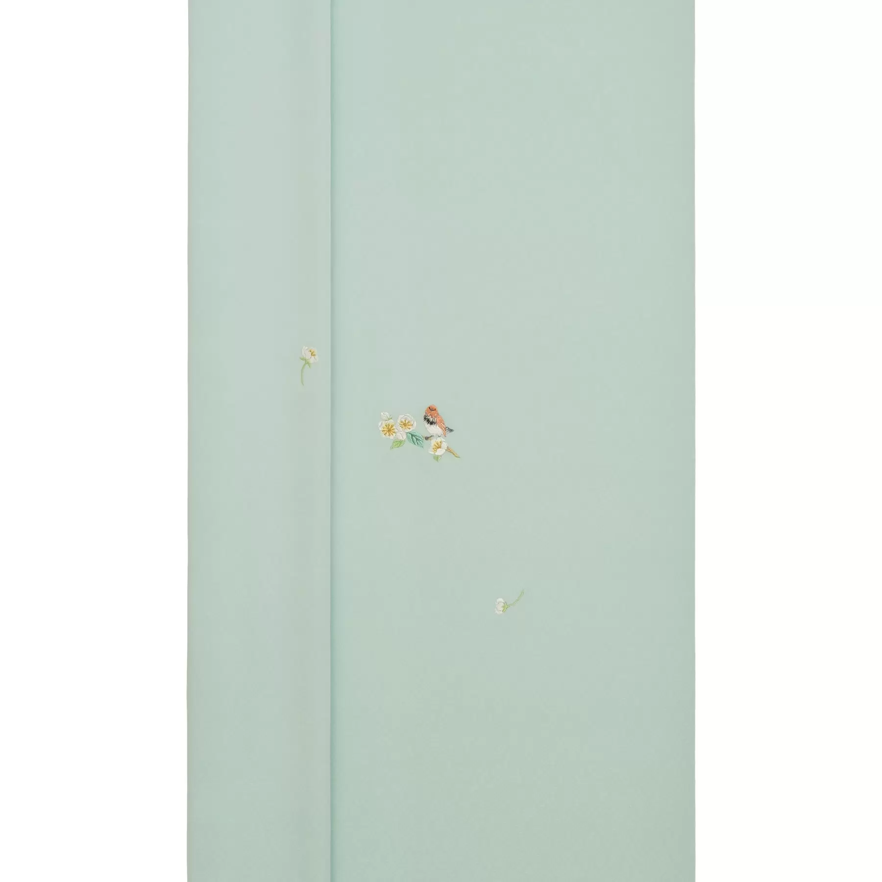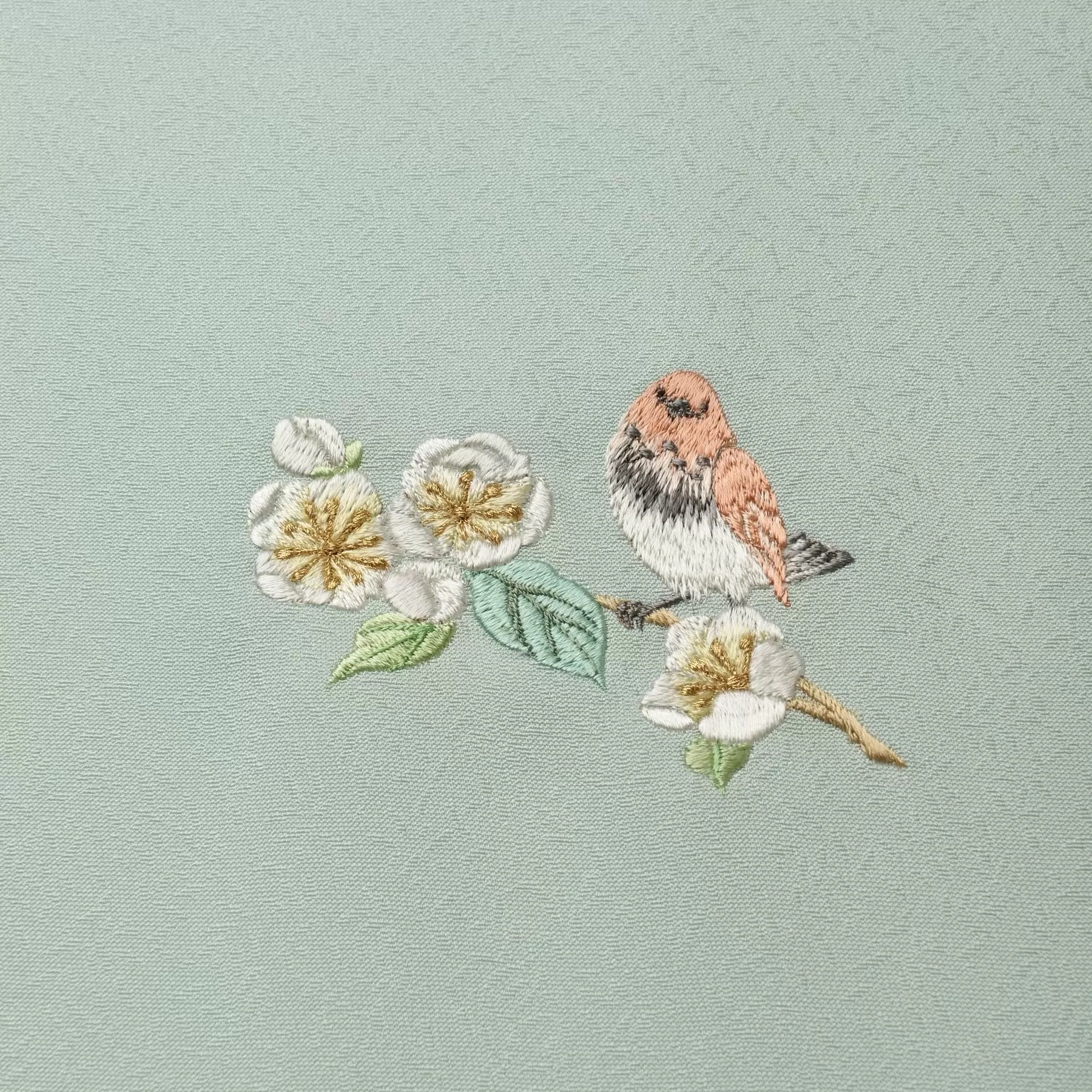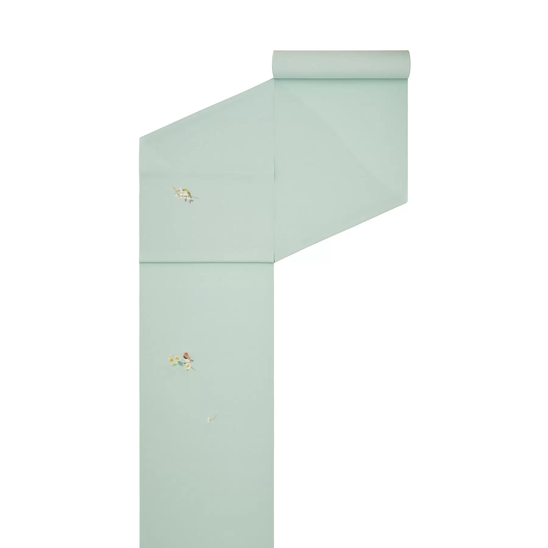 今尾景年が、精細な描写力で自然の生命力と鳥の愛らしさを描いた「景年花鳥画譜」に出てくる、実をつける植物に遊びに来る鳥たちを四季の描写で描きました。枝に止まる鳥と花が一体となったような可愛らしい姿を繊細な刺繍で表現しています。全面に敷き詰められた小さな葉が優しく浮き上がる地紋と共に、鳥たちの愛らしい表情や軽やかな羽の雰囲気をお楽しみください。
