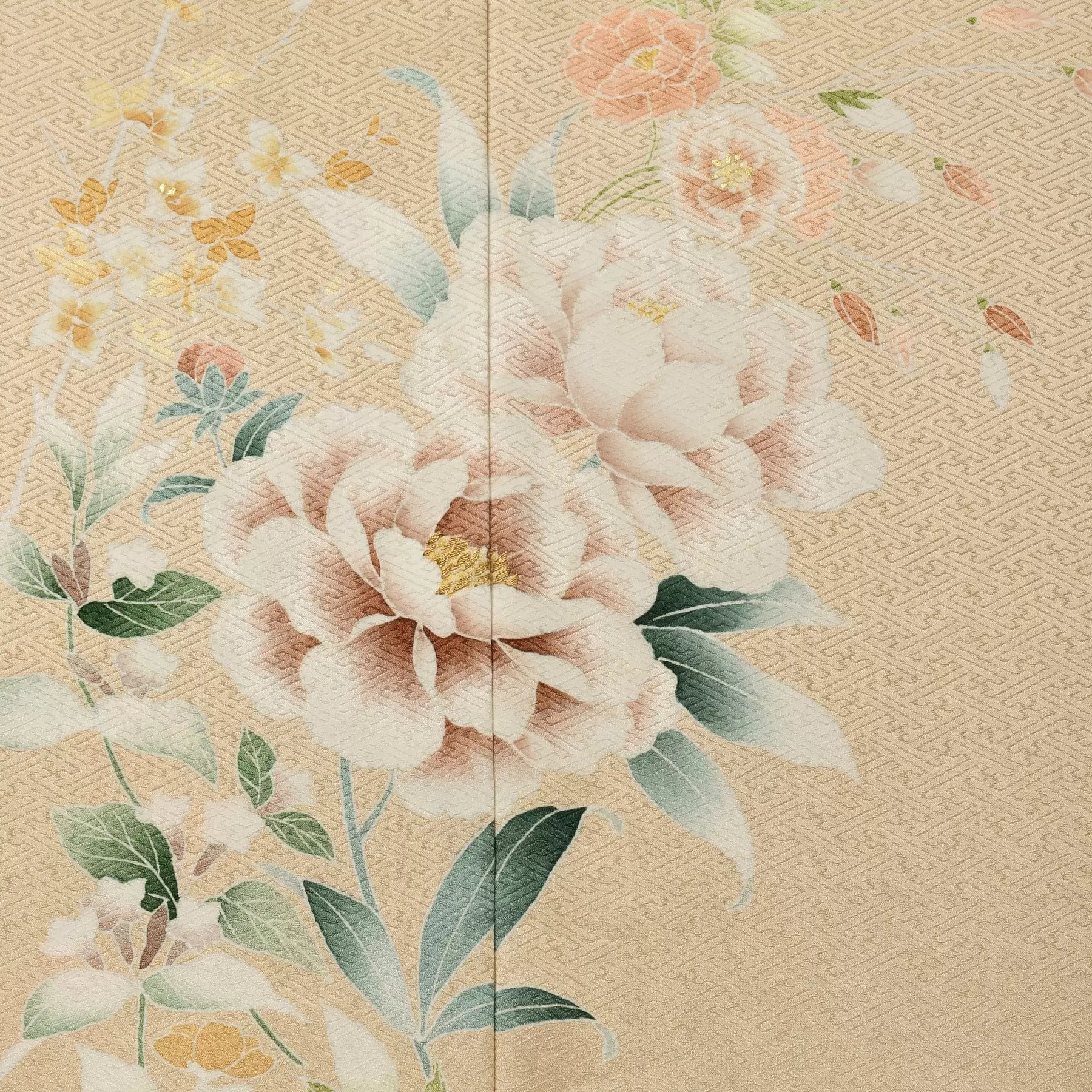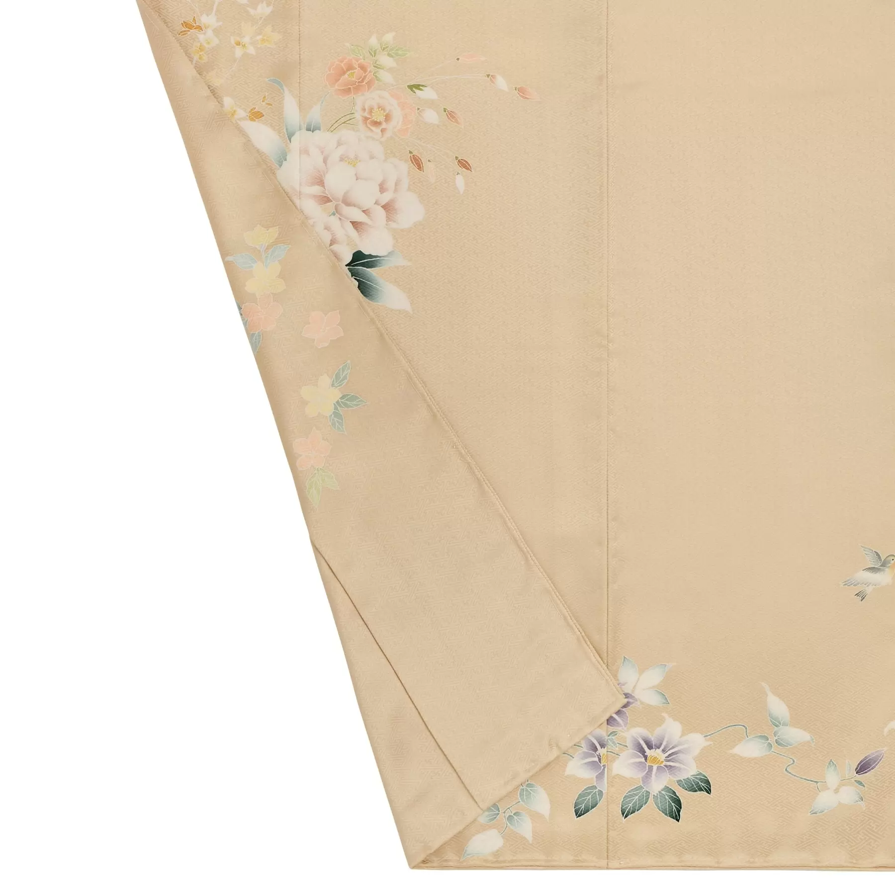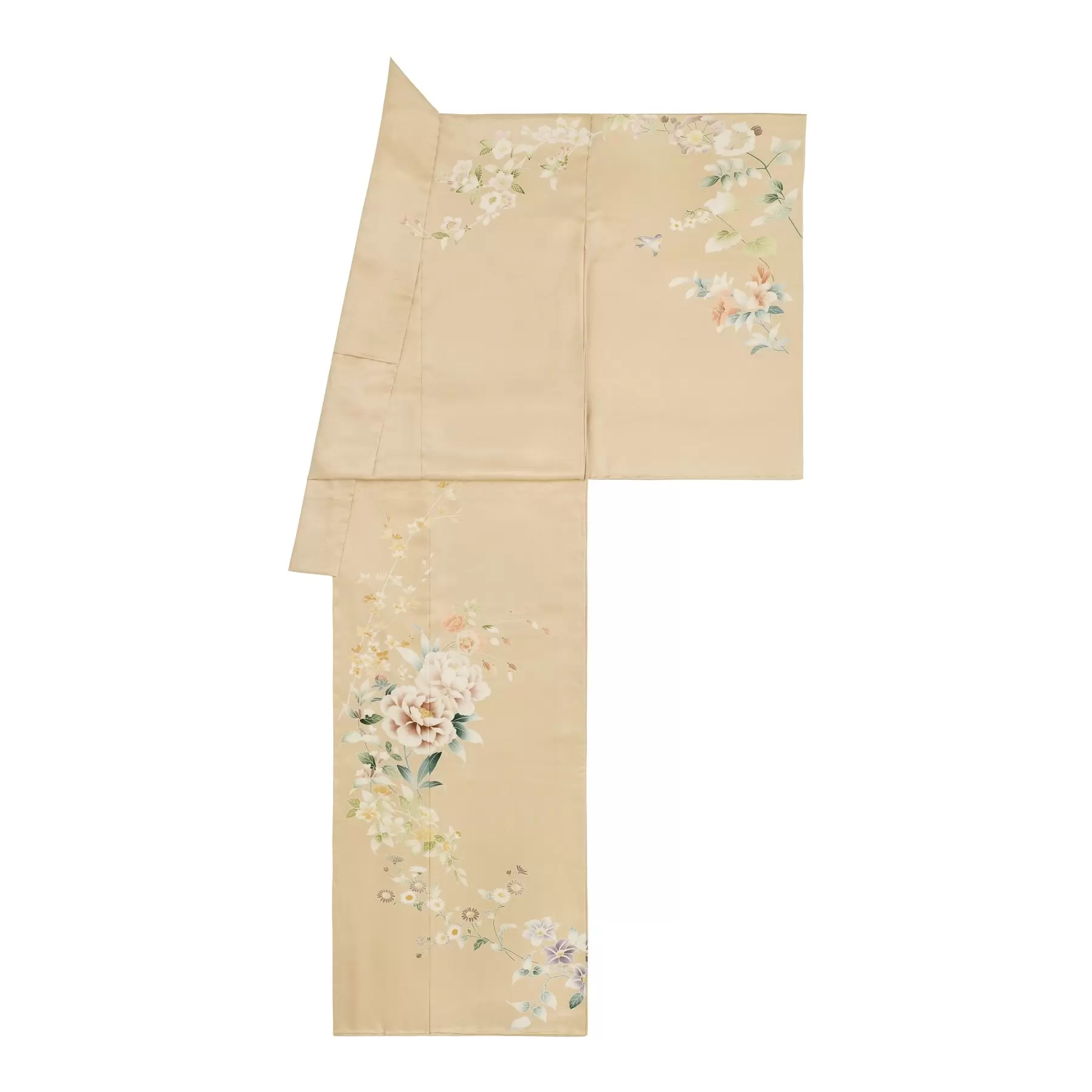 きものを縁取るように全体に花々を描き、その中をつがいの鳥が楽しげに飛び交う和やかな風景を描きました。やわらかに降り注ぐ陽の光のような光沢のある綸子の生地と、暈しを幾重にも重ね繊細で写実的に表現された美しい花々に遊ぶ鳥たちの愛らしさ。そのコントラストをお楽しみいただけます。