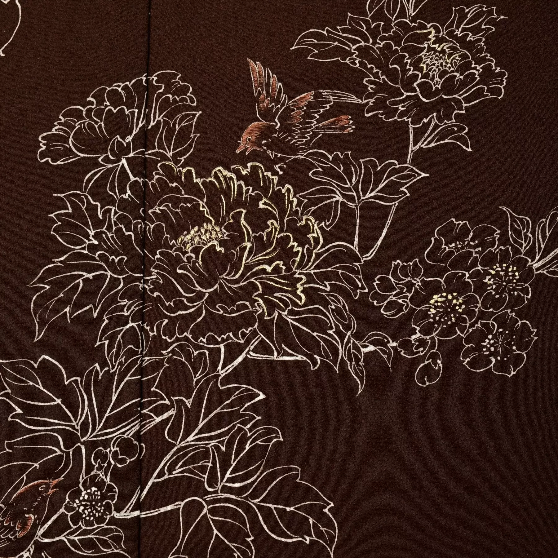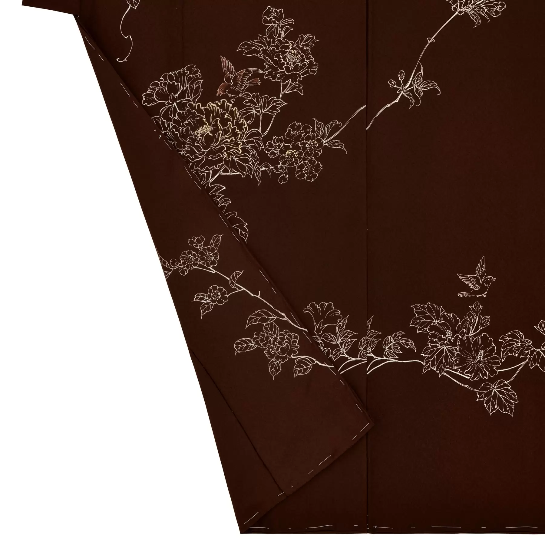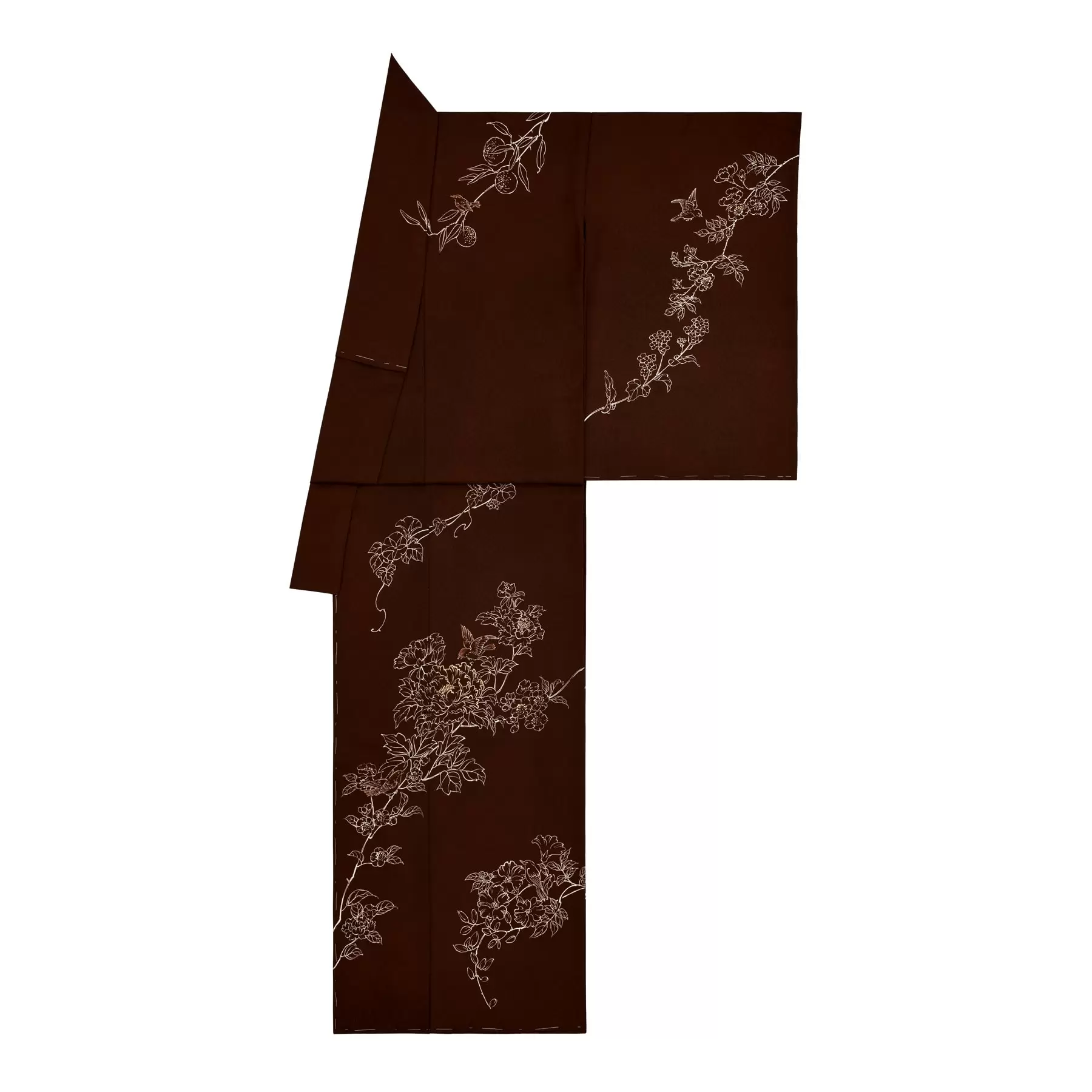 シロツメクサを編んで作る花の冠のように、花々を絡めて大きな一つの輪を作るイメージでデザインしました。この訪問着を身に纏うと、シャープな線描きで螺旋状に描かれた花々が身体を優しく包み込み、たくさんの花によって装飾をされいるようです。白の表現が映えるように計算された地色の上に、水墨画のようなリズミカルな筆遣いで描き出される花々と鳥たちの生き生きとした輝きをお楽しみください。