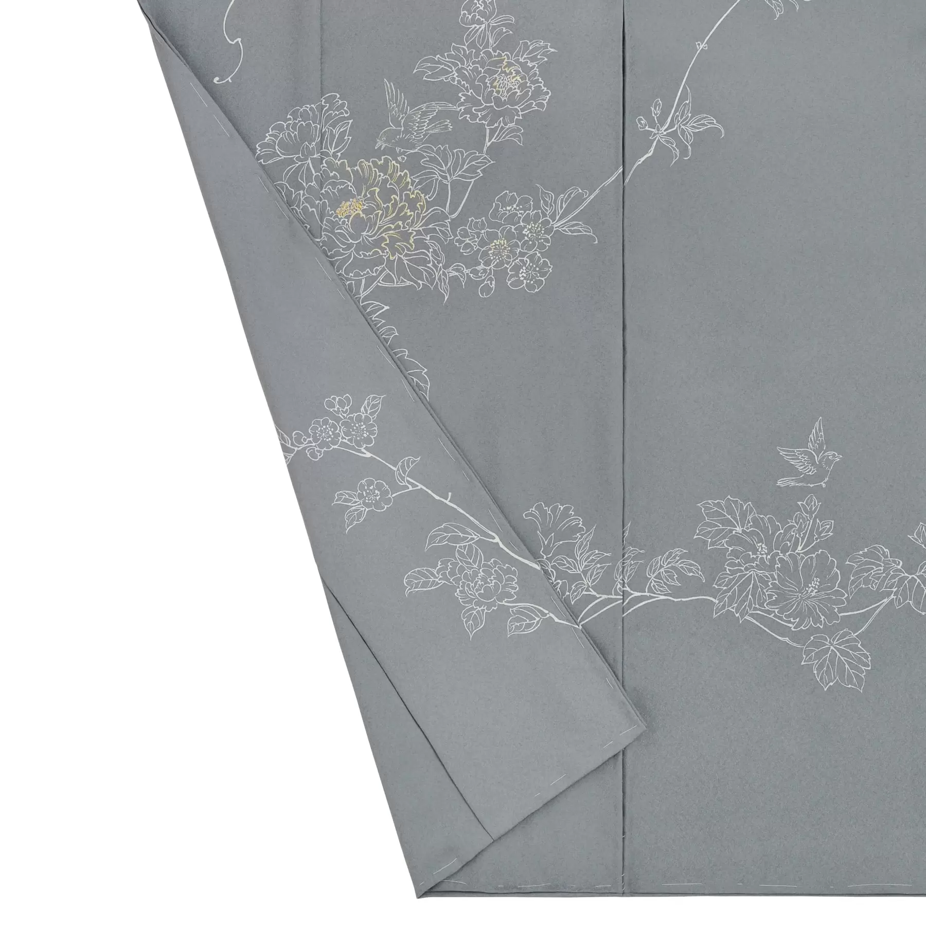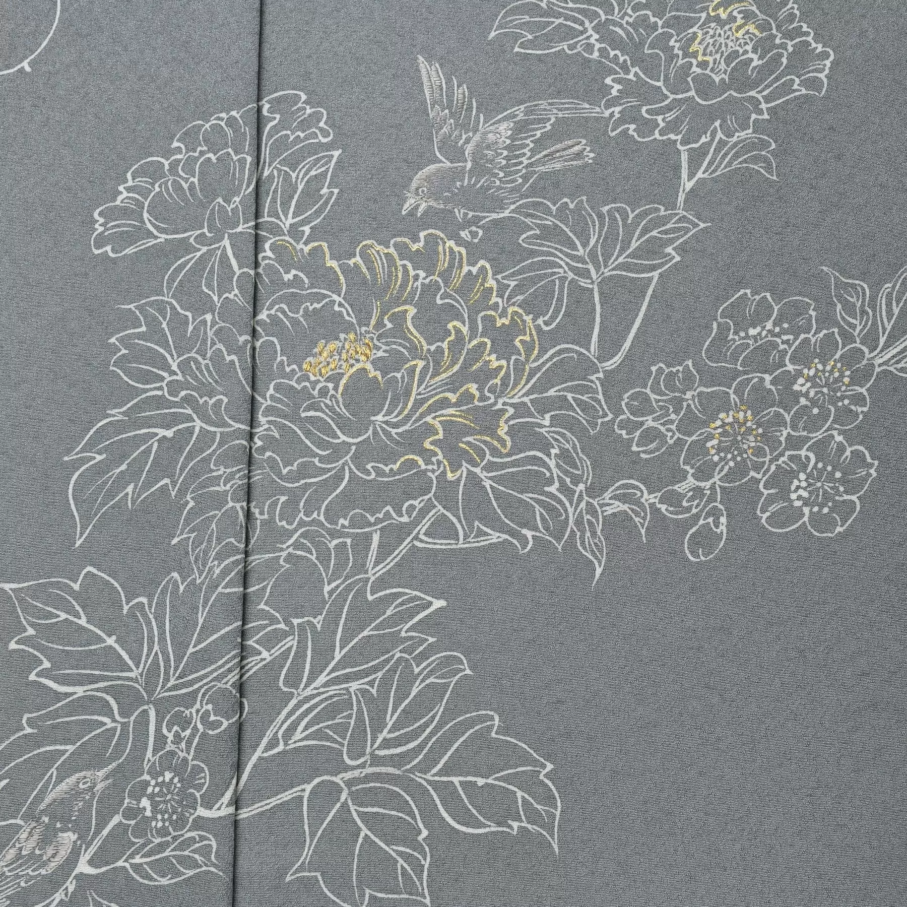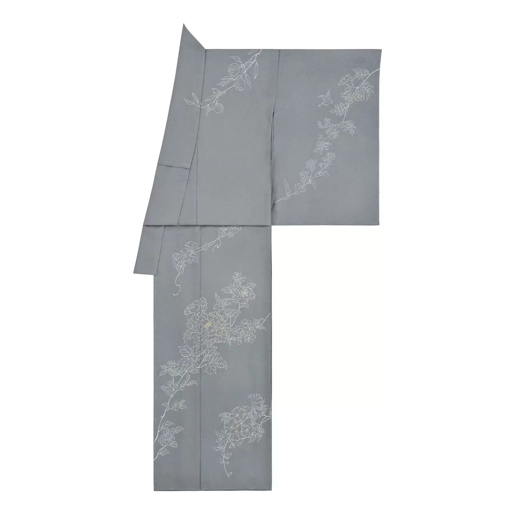 シロツメクサを編んで作る花の冠のように、花々を絡めて大きな一つの輪を作るイメージでデザインしました。この訪問着を身に纏うと、シャープな線描きで螺旋状に描かれた花々が身体を優しく包み込み、たくさんの花によって装飾をされいるようです。白の表現が映えるように計算された地色の上に、水墨画のようなリズミカルな筆遣いで描き出される花々と鳥たちの生き生きとした輝きをお楽しみください。