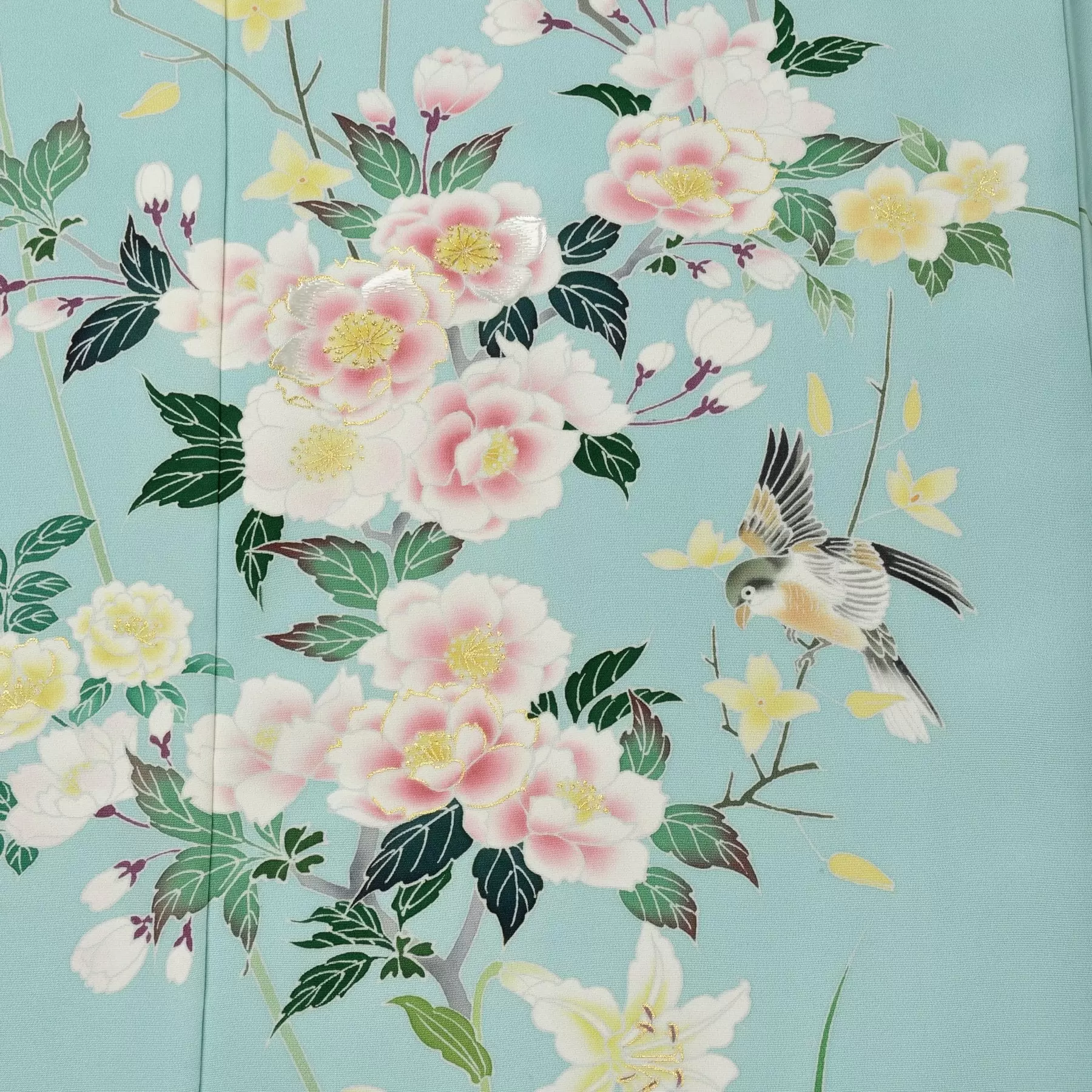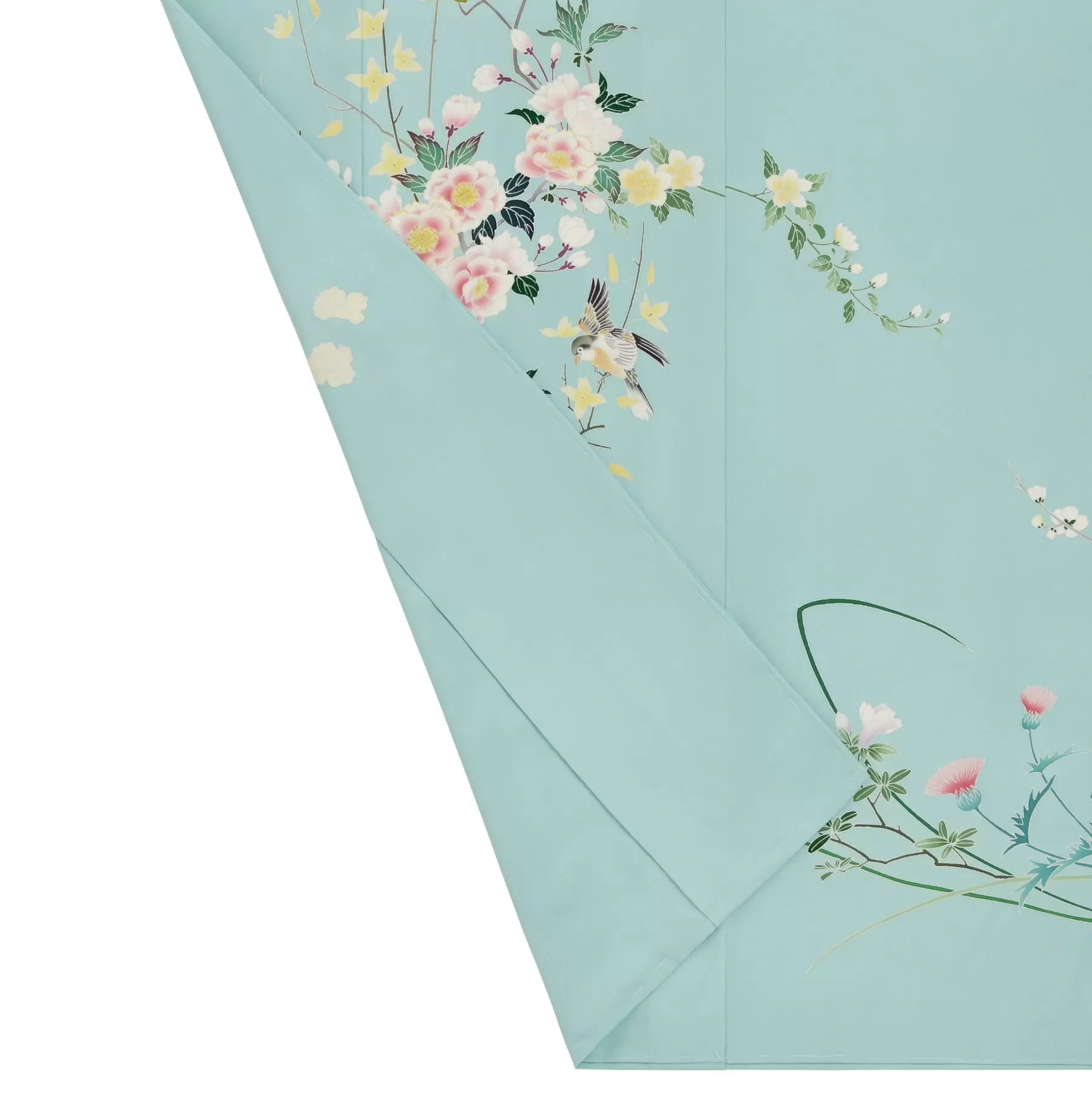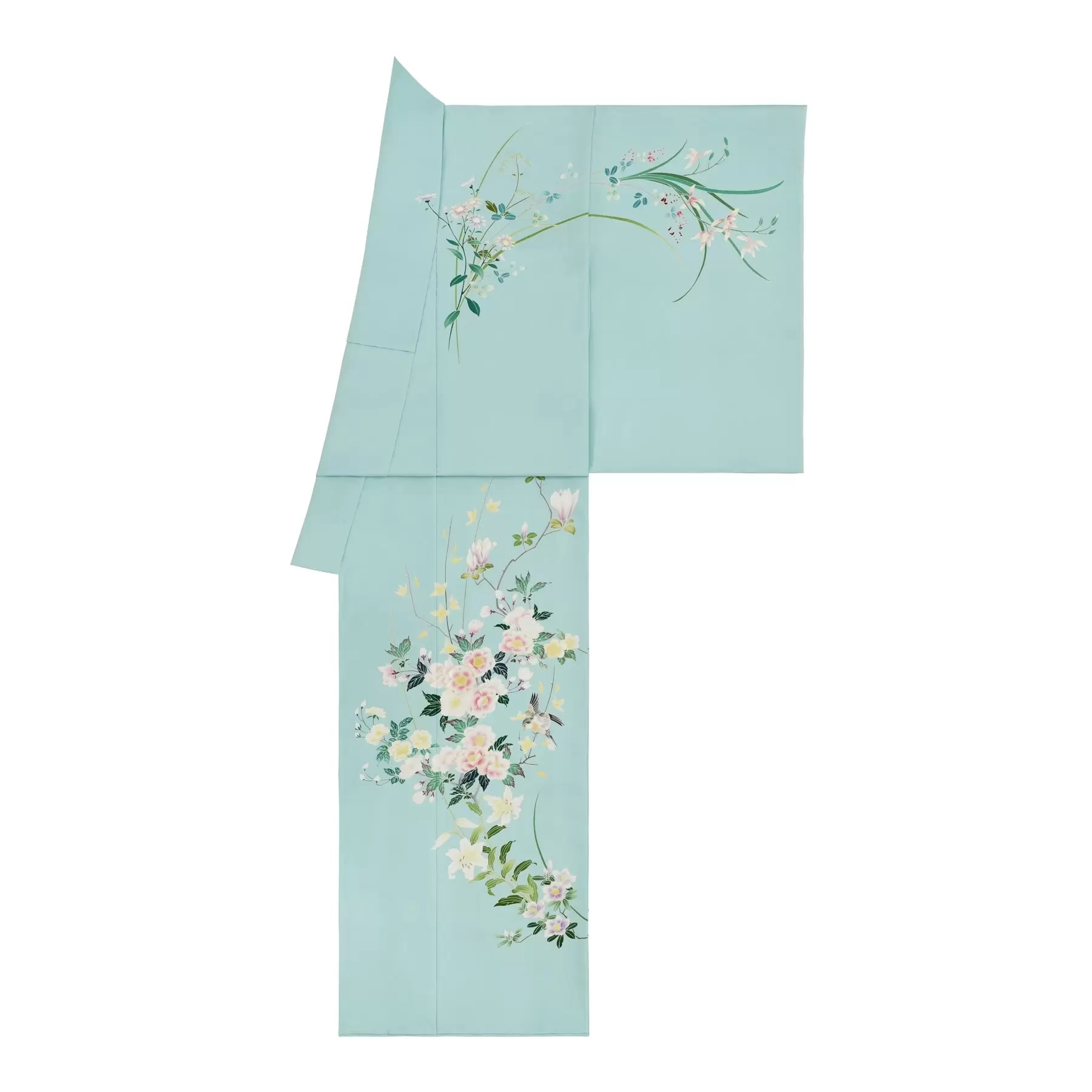 気持ちの良い晴れ渡った空を思わせる爽やかな地色に、清楚な四季の小花が咲き揃うエレガントな訪問着は、ドレスアップしたい特別な日の装いにおすすめです。