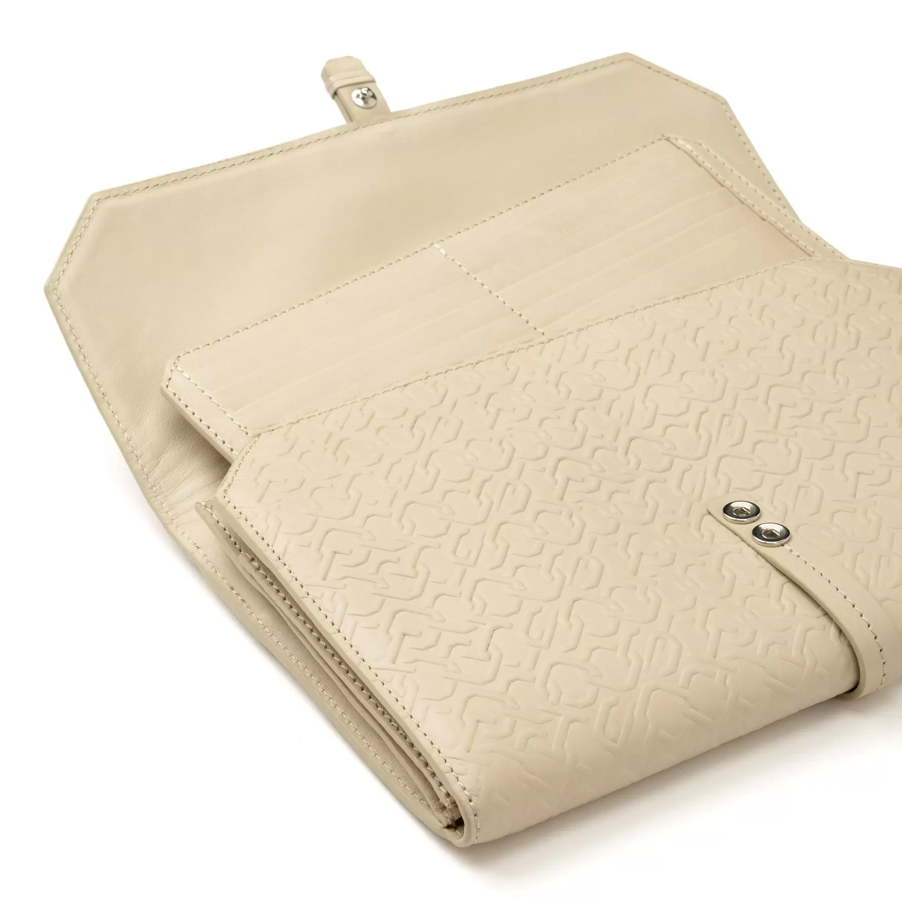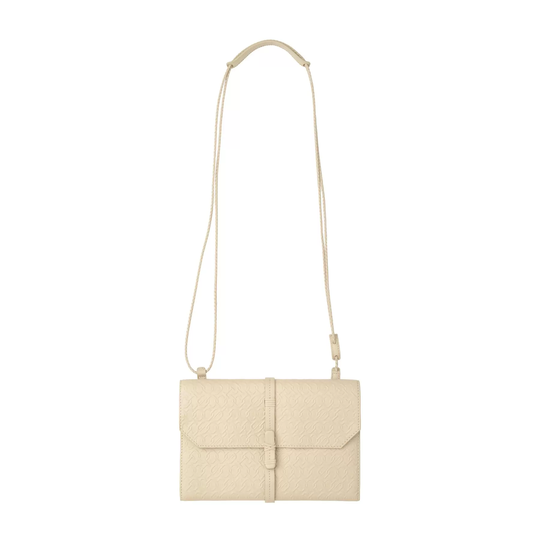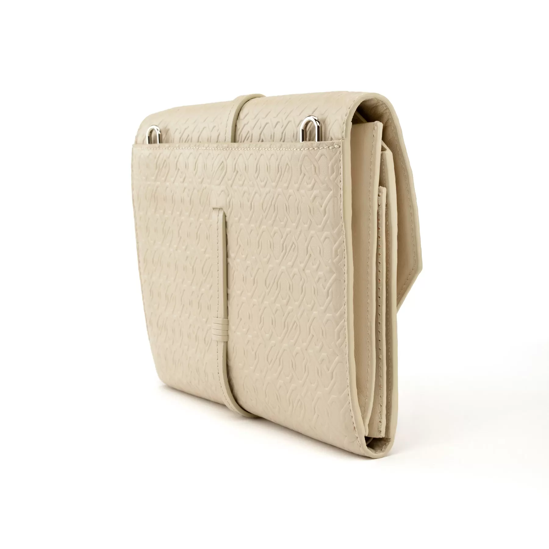 千總の紋にも使われている隅切り四角形のモノグラムデザインの型押しや、竹籠バッグを思わせるハンドルの編み方、幾重にも重ねられたコバ塗りなど、日本の職人の美しい手仕事が随所に生かされた、バッグと同じデザインのクラッチです。