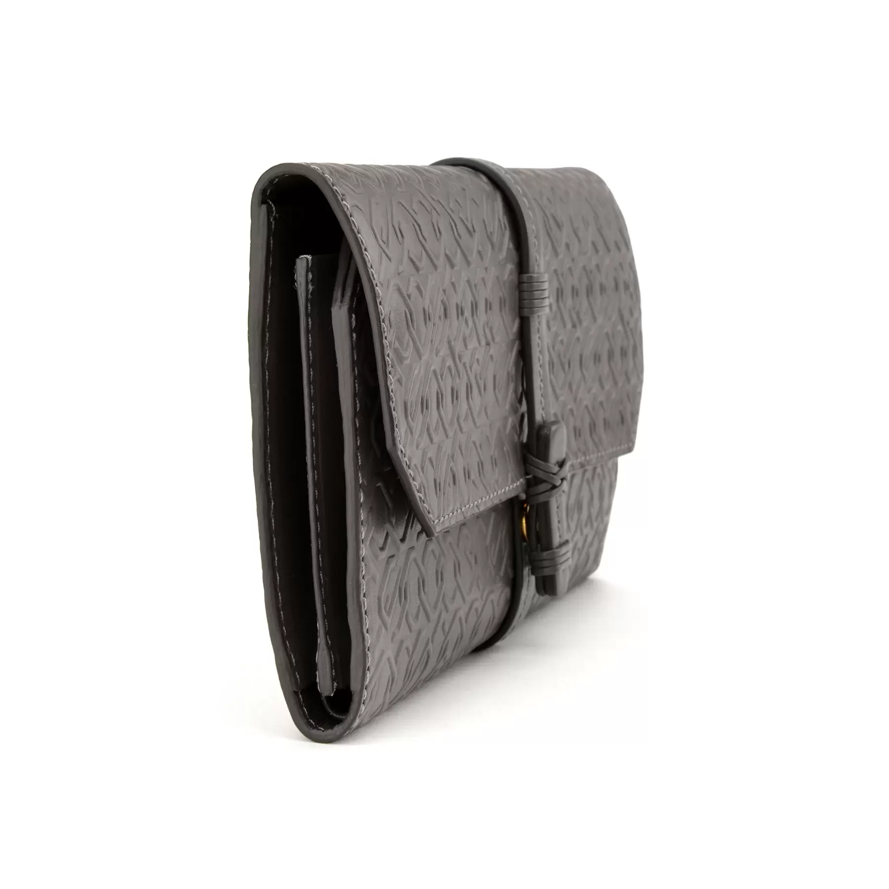 千總の紋にも使われている隅切り四角形のモノグラムデザインの型押しや、竹籠バッグを思わせるハンドルの編み方、幾重にも重ねられたコバ塗りなど、日本の職人の美しい手仕事が随所に生かされた、バッグと同じデザインのウォレットです。