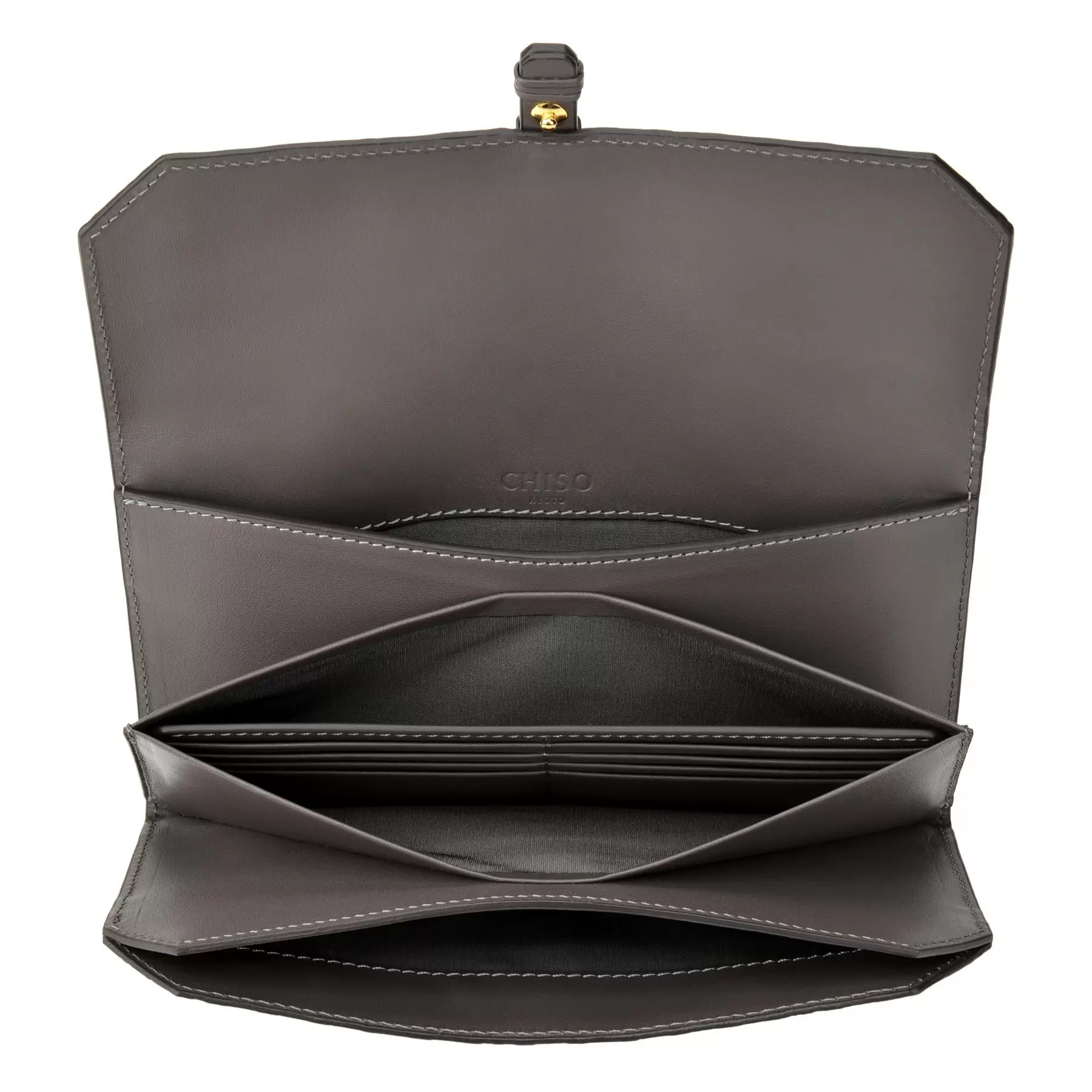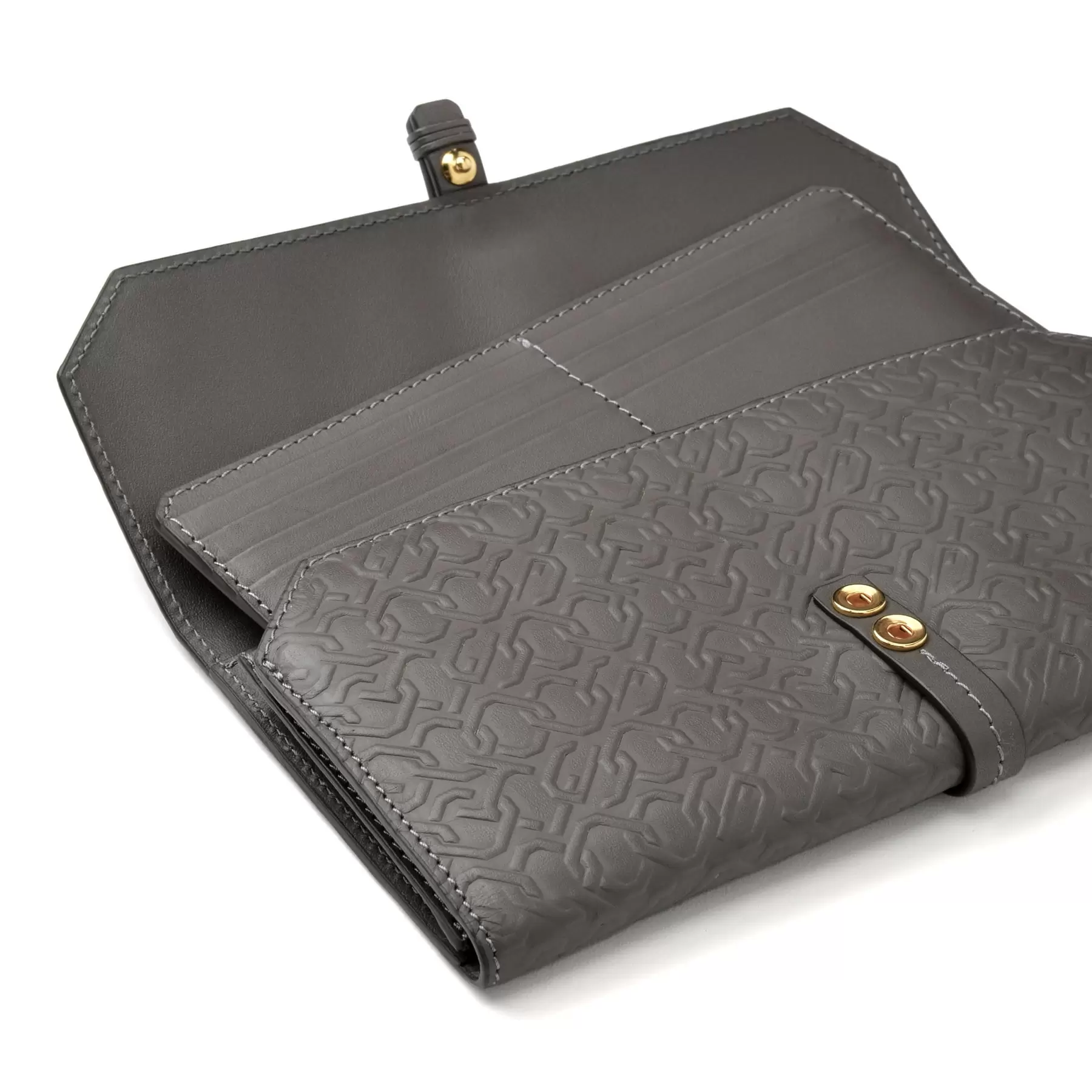 パスポートが入る大きめのサイズと、3つの内ポケットに取り外し可能なカードホルダーが付いた機能的な長財布です。所々に現れる八角形が遊び心を添えてくれます。