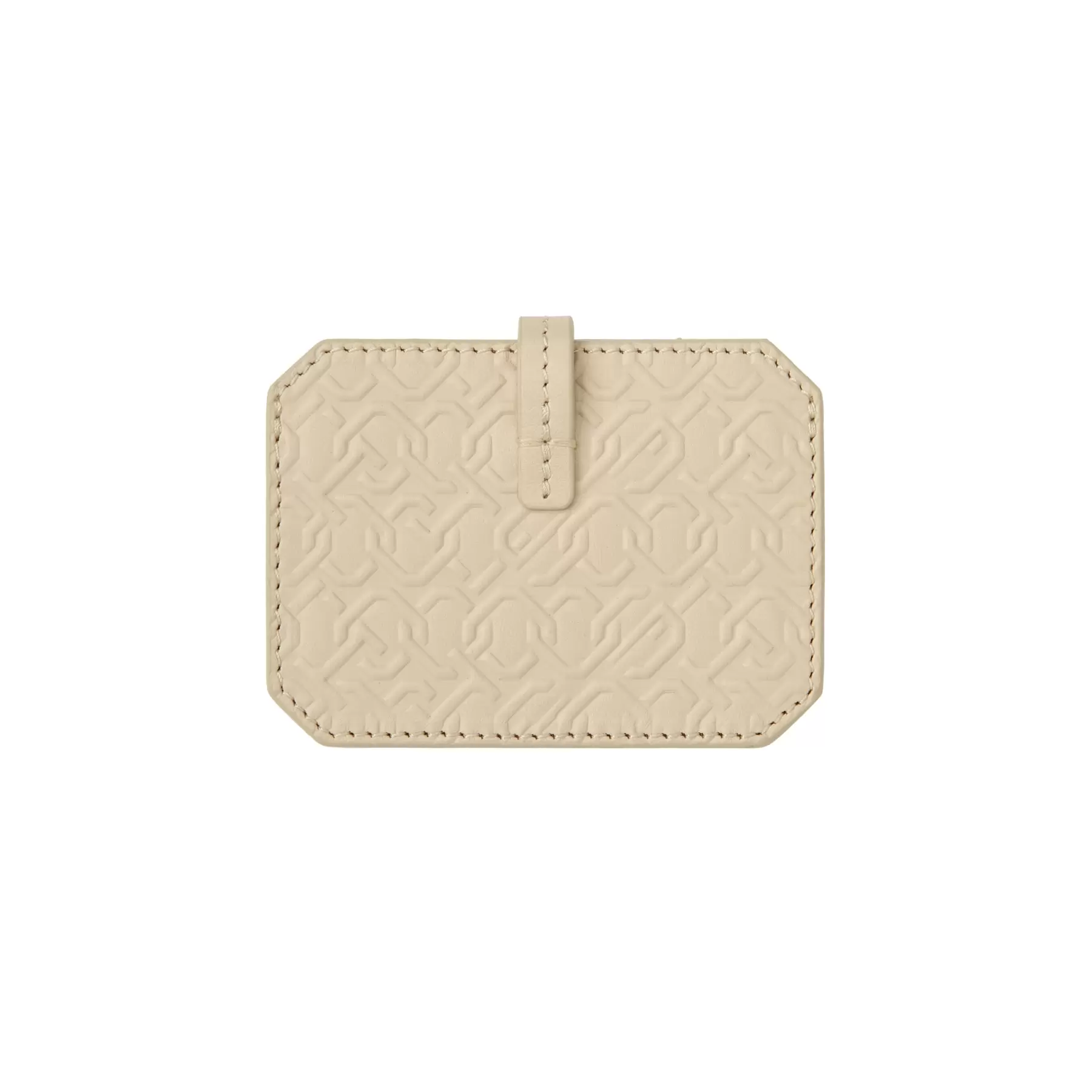 千總の紋にも使われている隅切り四角形のモノグラムデザインの型押しや、竹籠バッグを思わせるハンドルの編み方、幾重にも重ねられたコバ塗りなど、日本の職人の美しい手仕事が随所に生かされた、バッグと同じデザインのカードケースです。