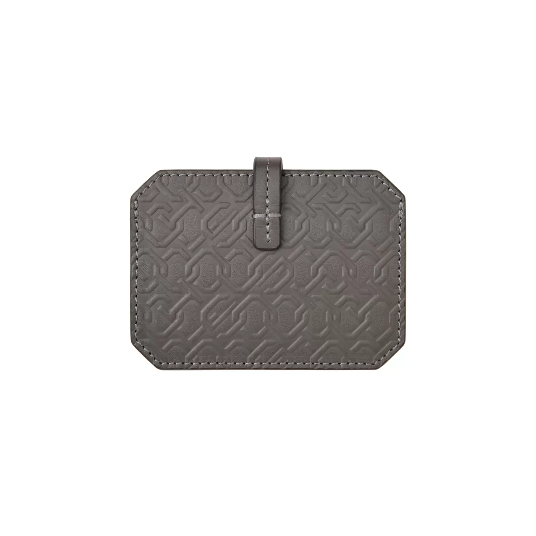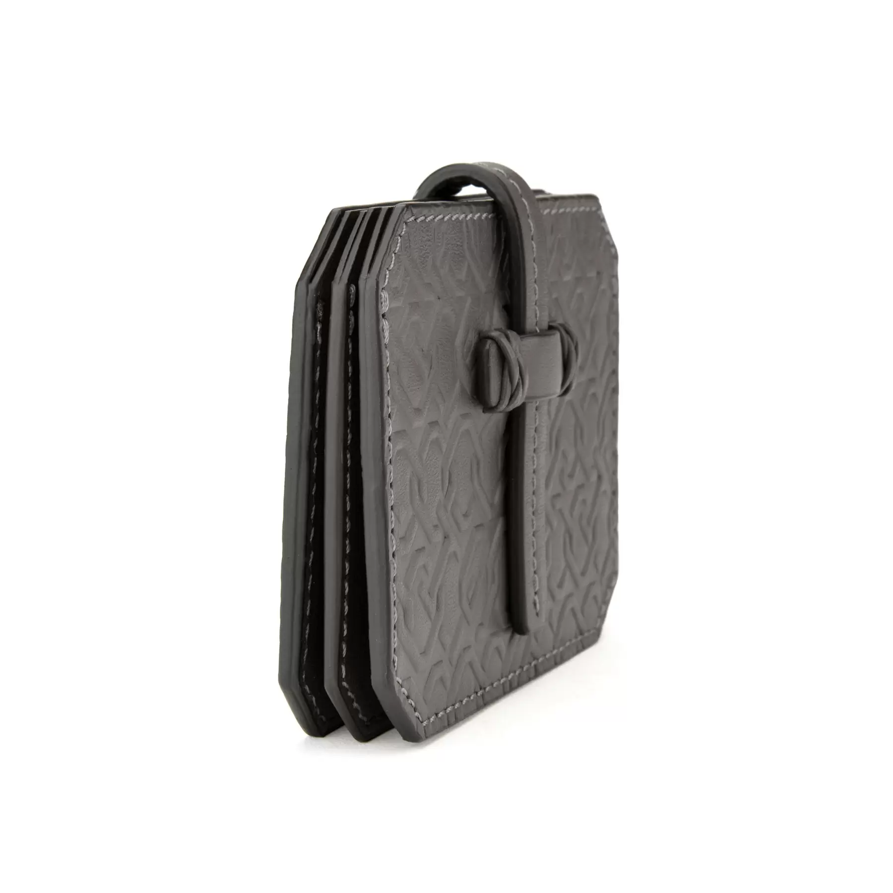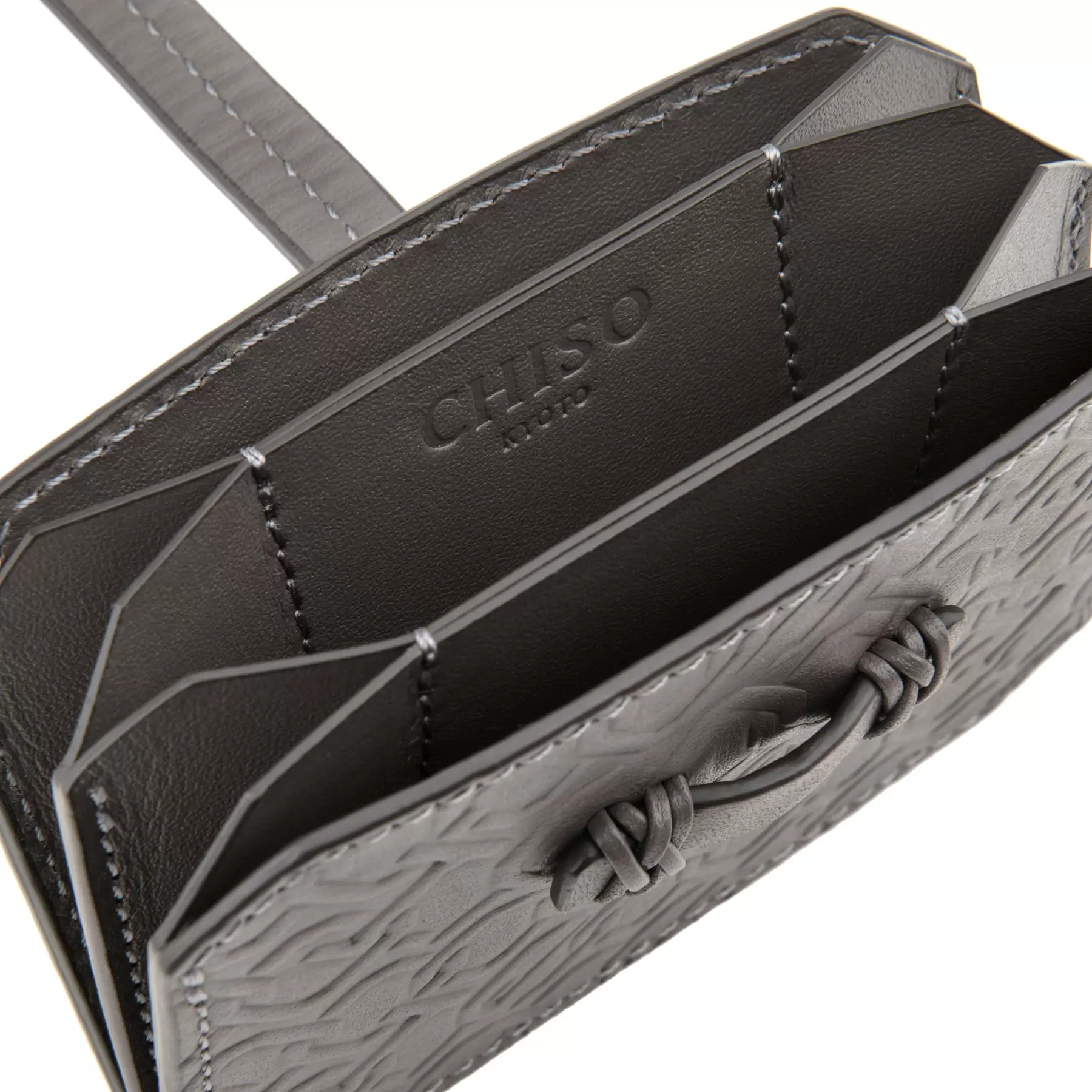 千總の紋にも使われている隅切り四角形のモノグラムデザインの型押しや、竹籠バッグを思わせるハンドルの編み方、幾重にも重ねられたコバ塗りなど、日本の職人の美しい手仕事が随所に生かされた、バッグと同じデザインのカードケースです。