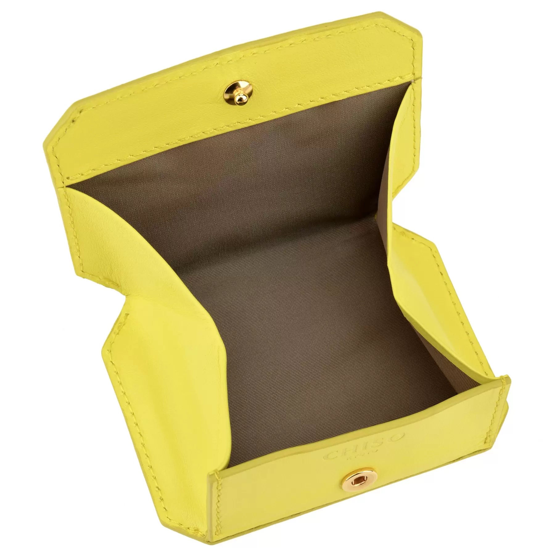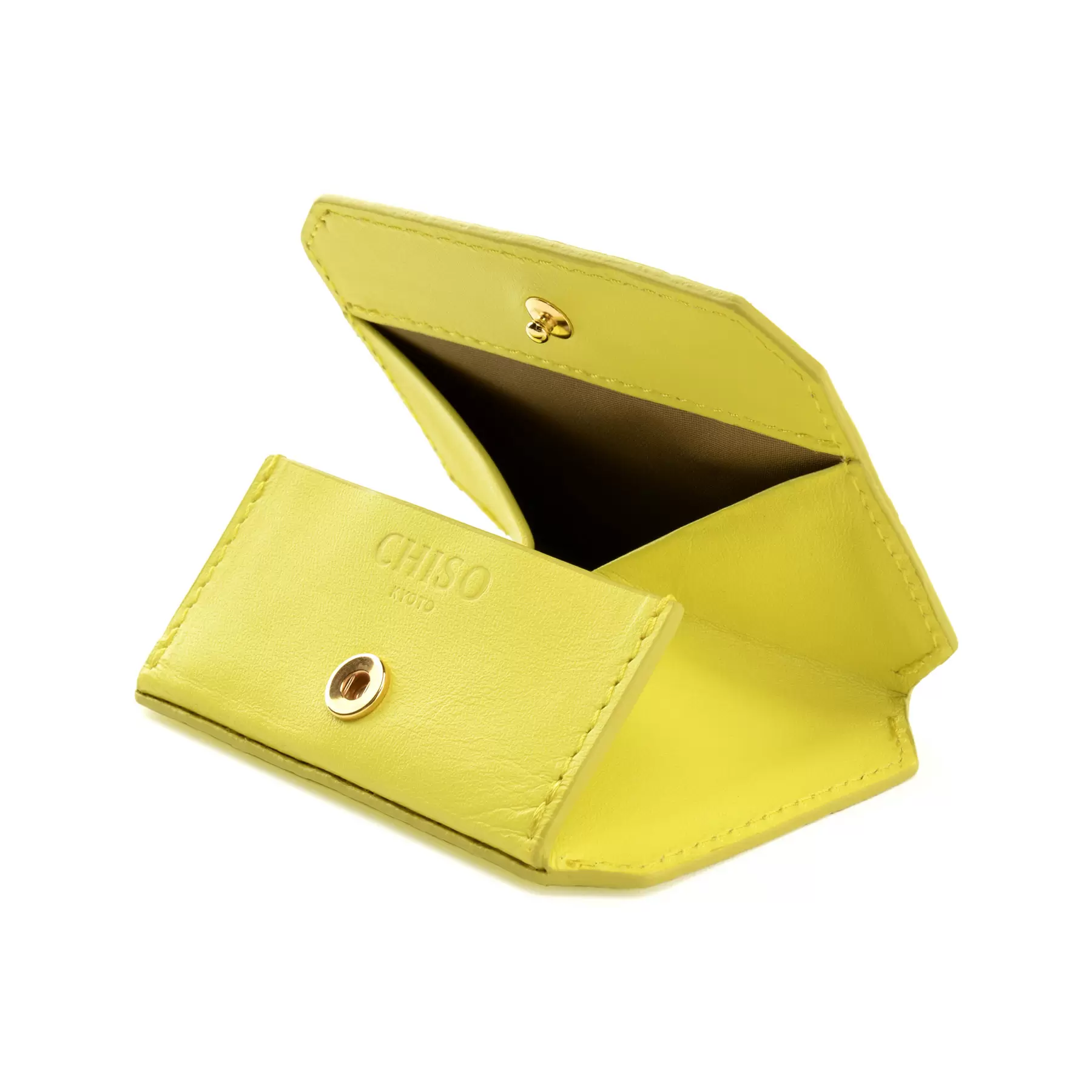 千總の紋にも使われている隅切り四角形のモノグラムデザインの型押しや、竹籠バッグを思わせるハンドルの編み方、幾重にも重ねられたコバ塗りなど、日本の職人の美しい手仕事が随所に生かされた、バッグと同じデザインのコインケースです。