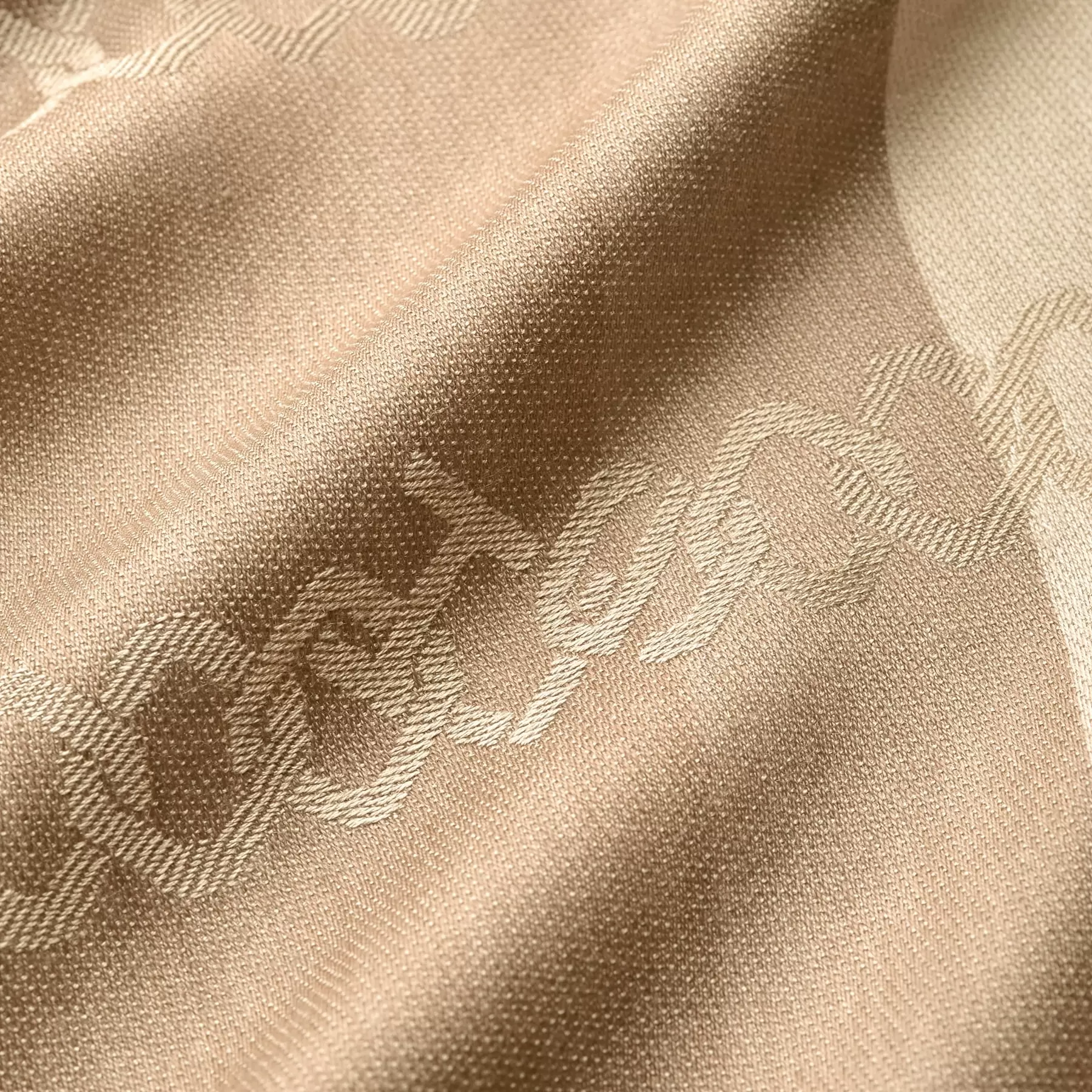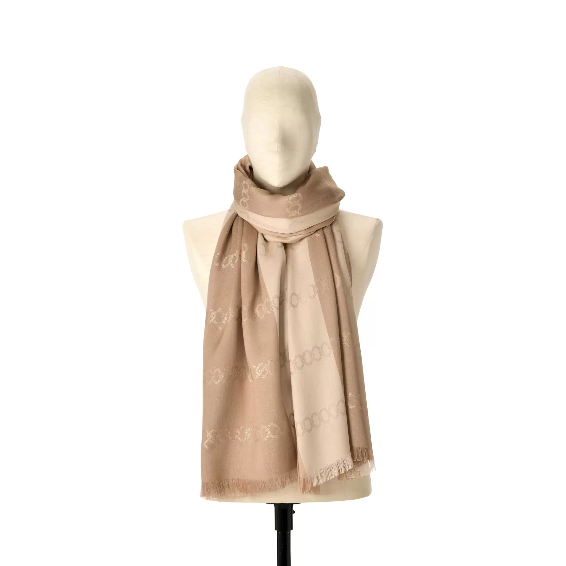 CHISOのモノグラムが織り込まれたジャガードのシルクウールストール。光沢感と柔らかさの上質素材は男女問わずお使いいただける一枚です。美しくスタイリングできるよう裏面にも染めをほどこしました。シンプルなカラーリングでありながら濃淡をつけることで、巻いた時に単調にならない工夫がされています。