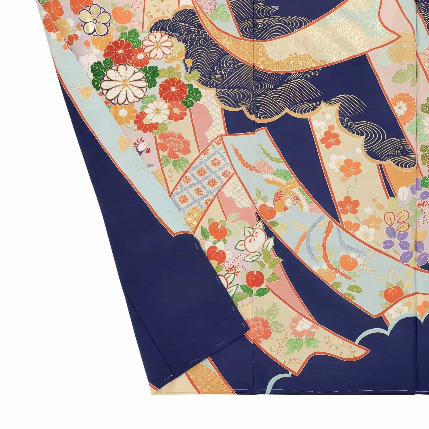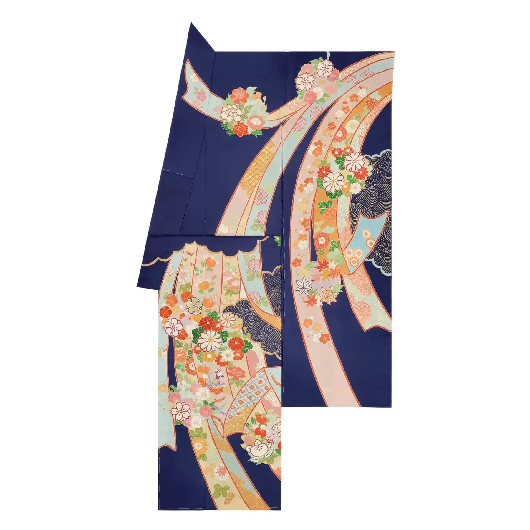 大胆に配された大きな柄ひとつひとつには、草花やおめでたい紋様が繊細に緻密に描かれ、藍の地色に彩りと美しさを添えてくれています。