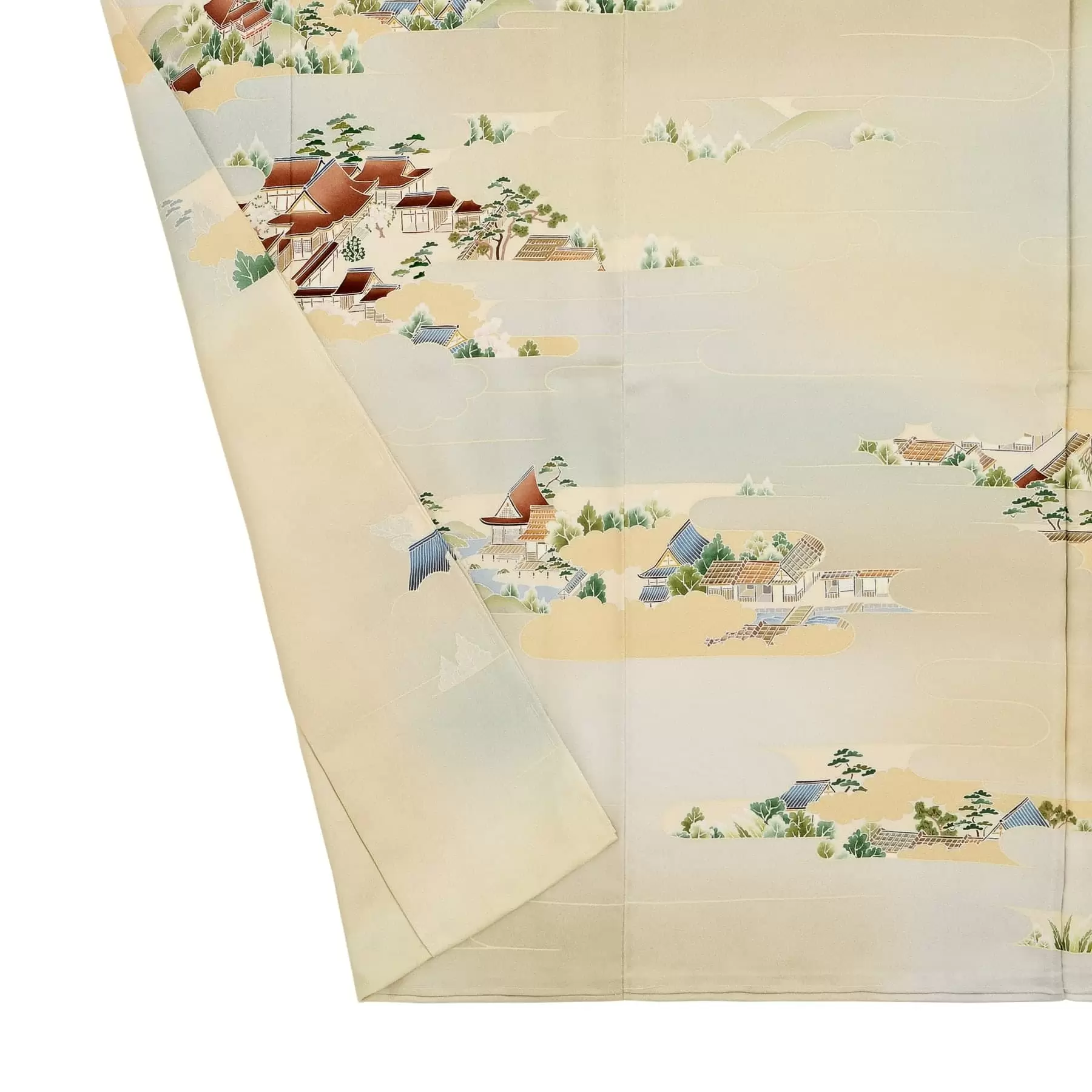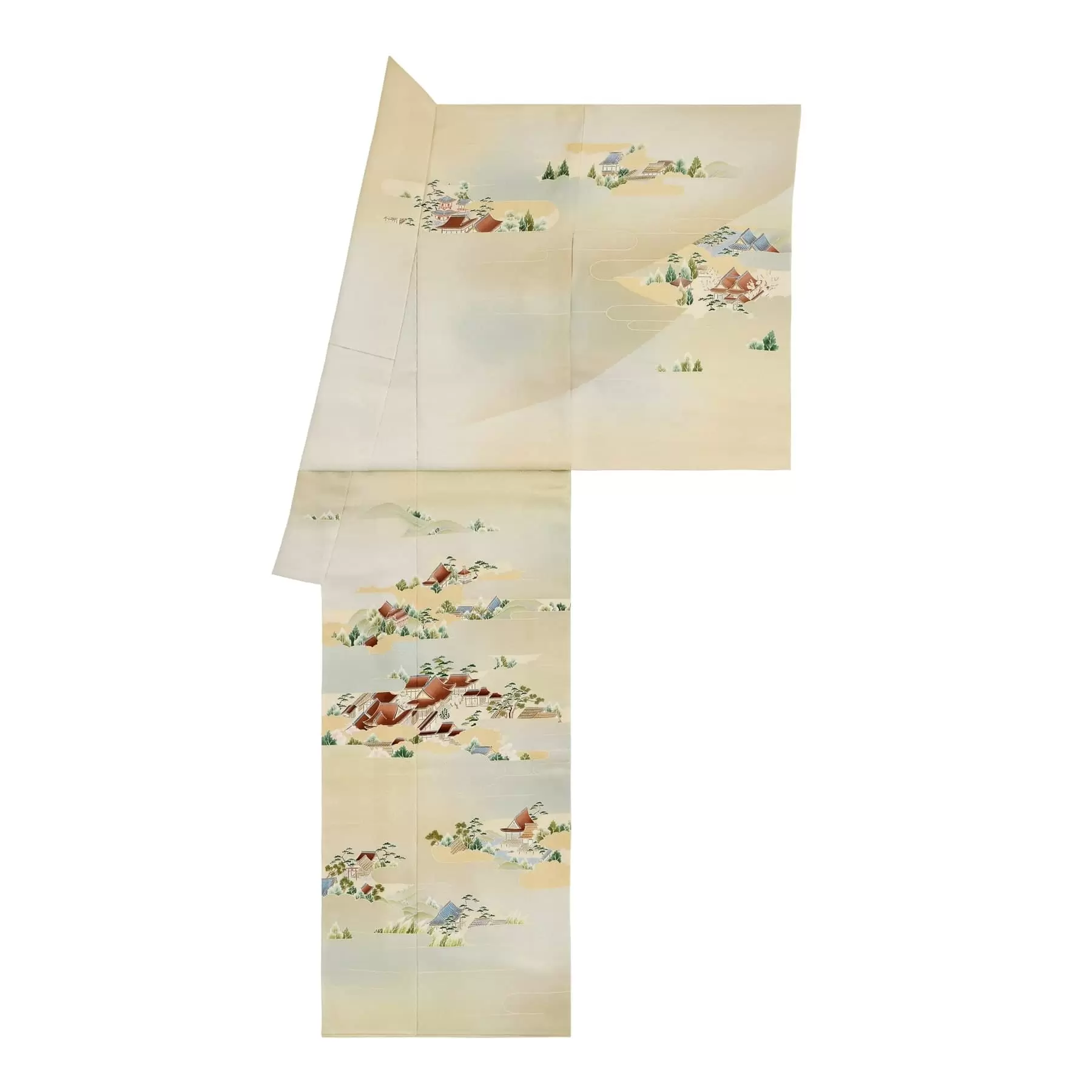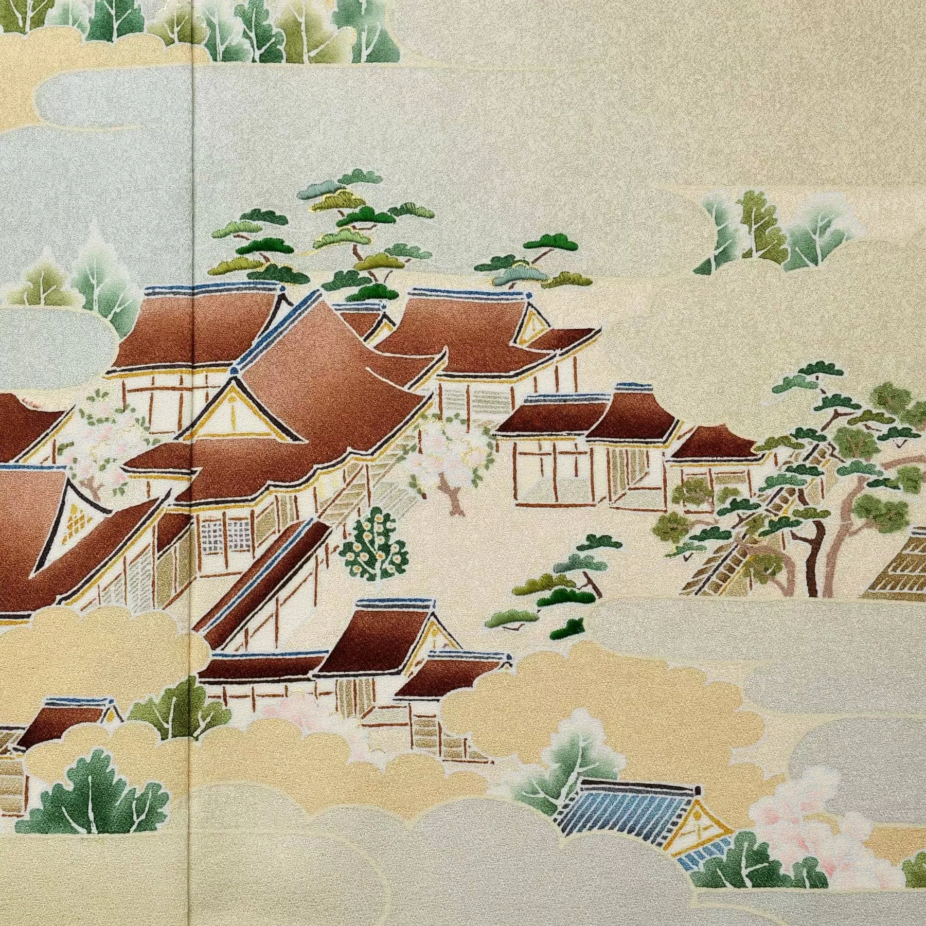 霞の中に幻想的に浮かび上がる京都の名所の風景を描いた、1点ものの訪問着です。