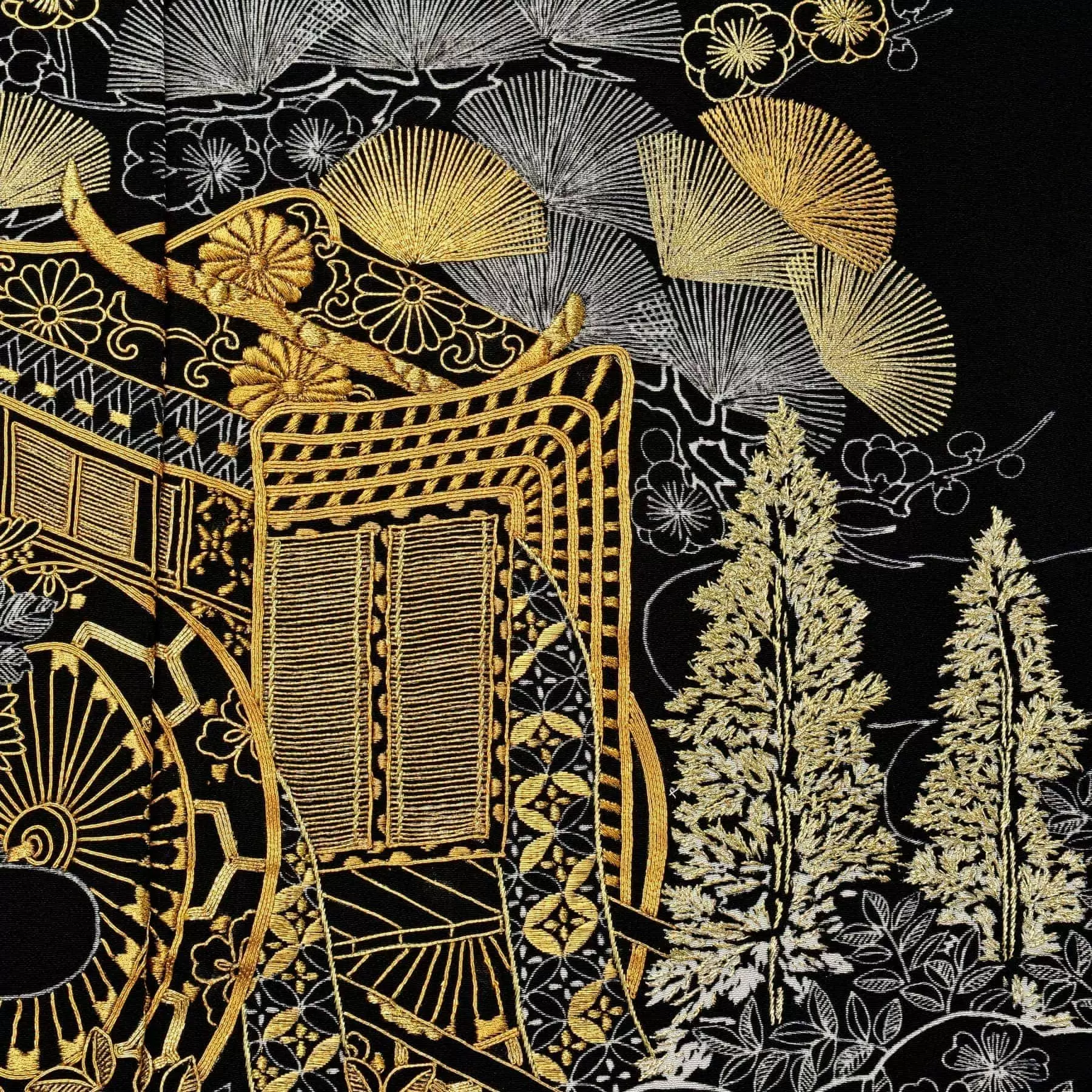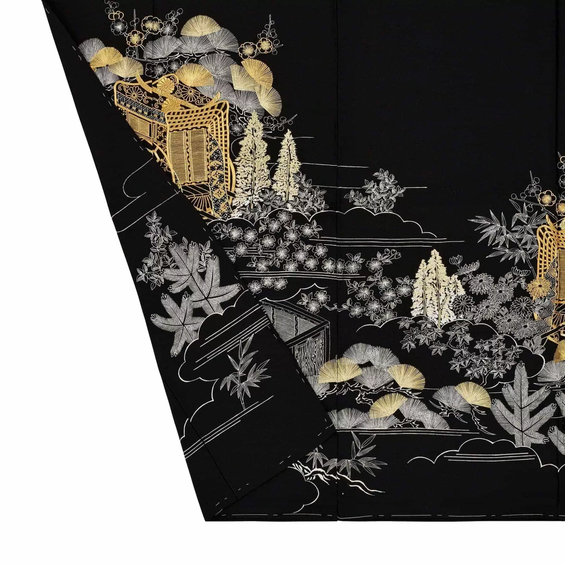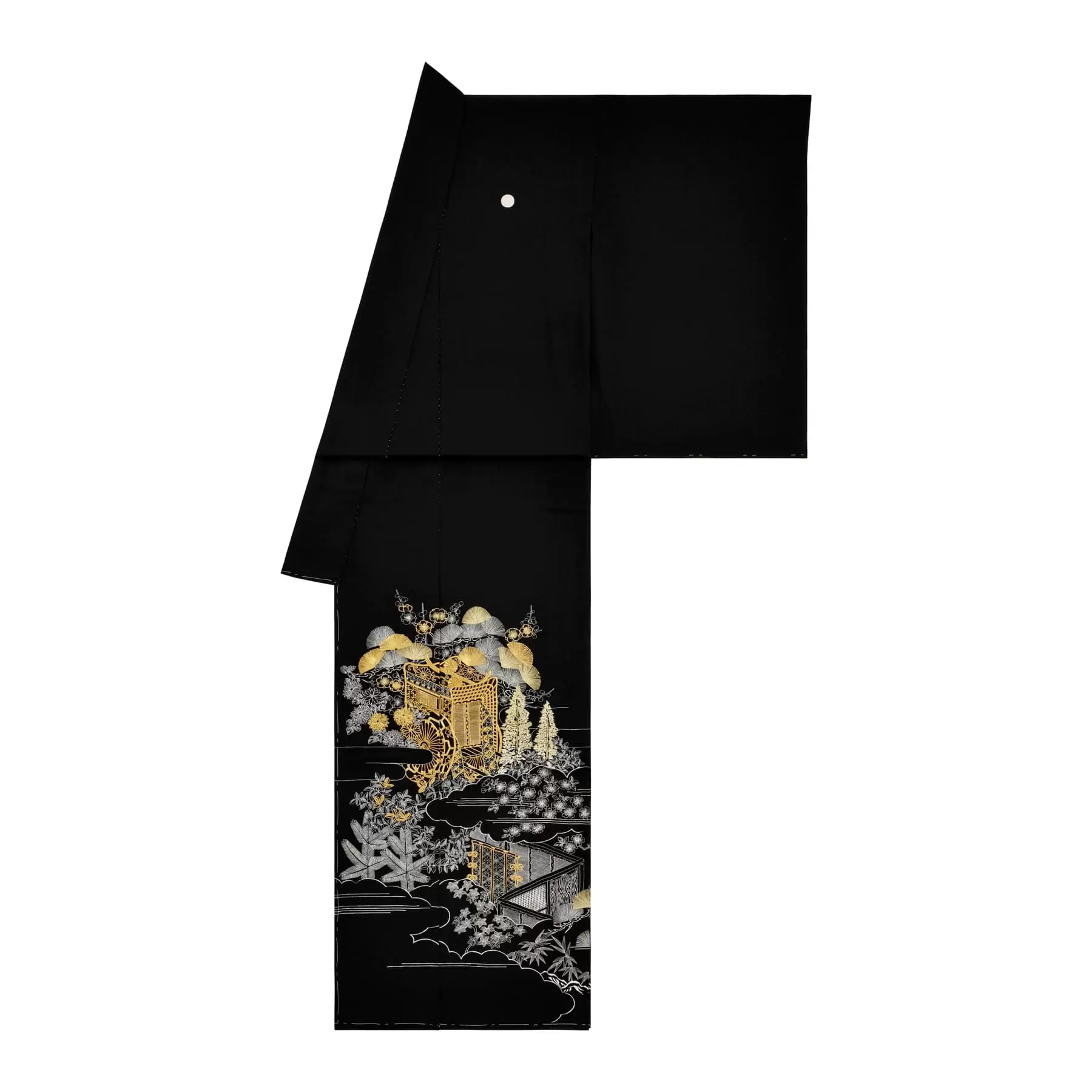 身分の高い人を象徴する御所車や御殿が、山水の風景と草花とともに描かれた趣のある1点ものの黒留袖です。黒の美しさが引き立つよう、柄を白と金のみで表現しました。