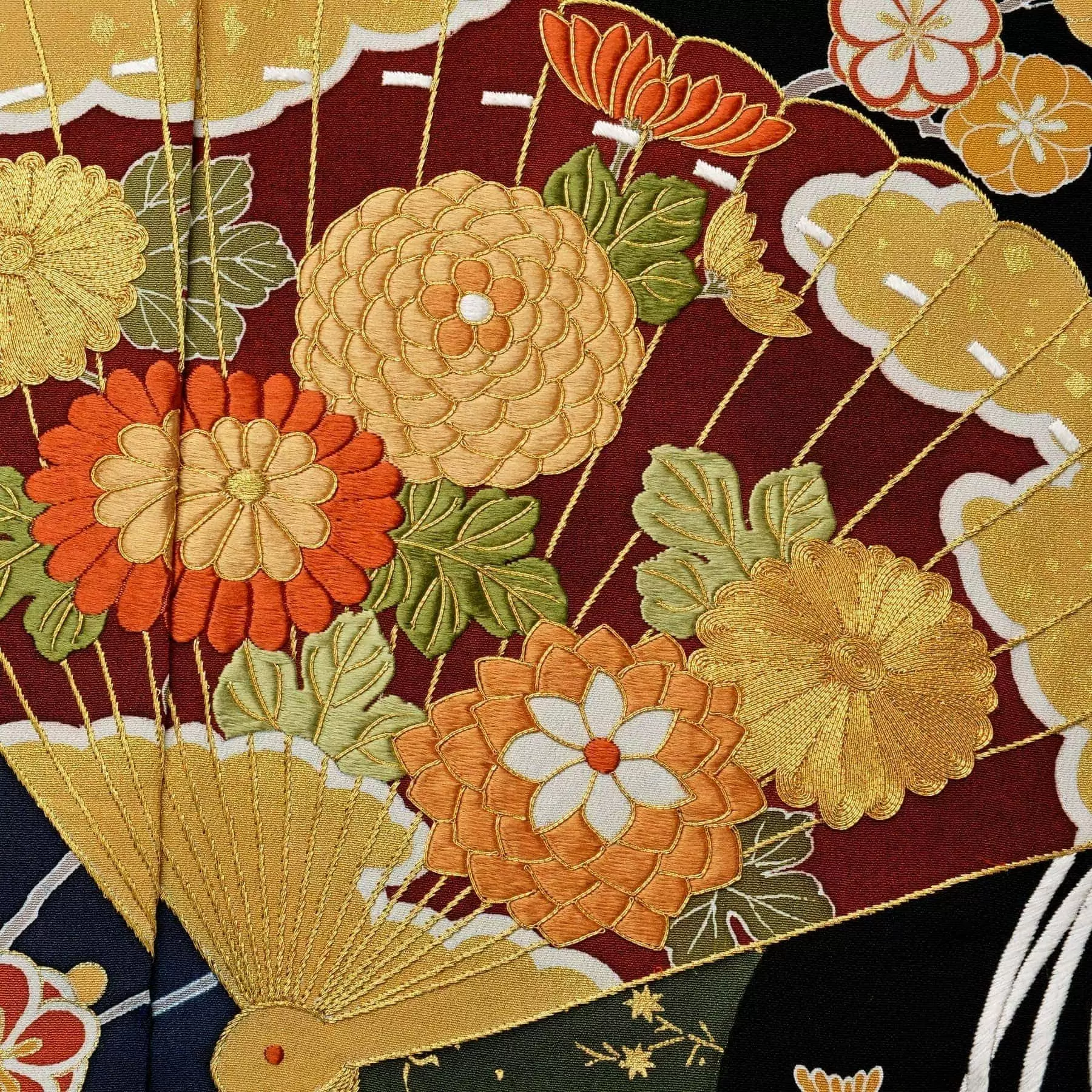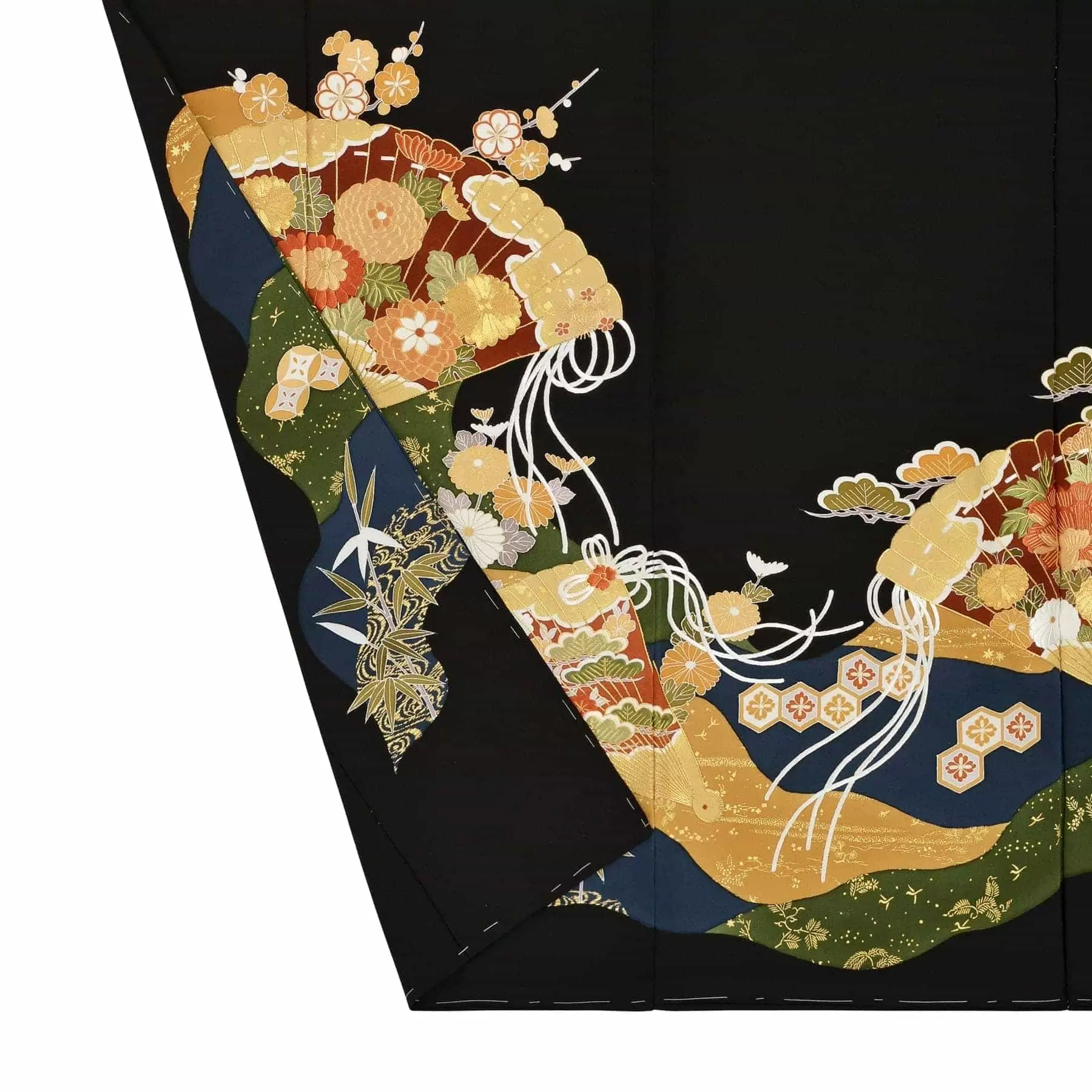 料紙紋様の中に描かれる七宝や流水は箔や染め、桧扇の中の柄や飾り紐は刺繍と、多彩な表現を使い陰影を際立たせました。身に纏うと絵柄の立体感が着姿を美しく演出してくれます。