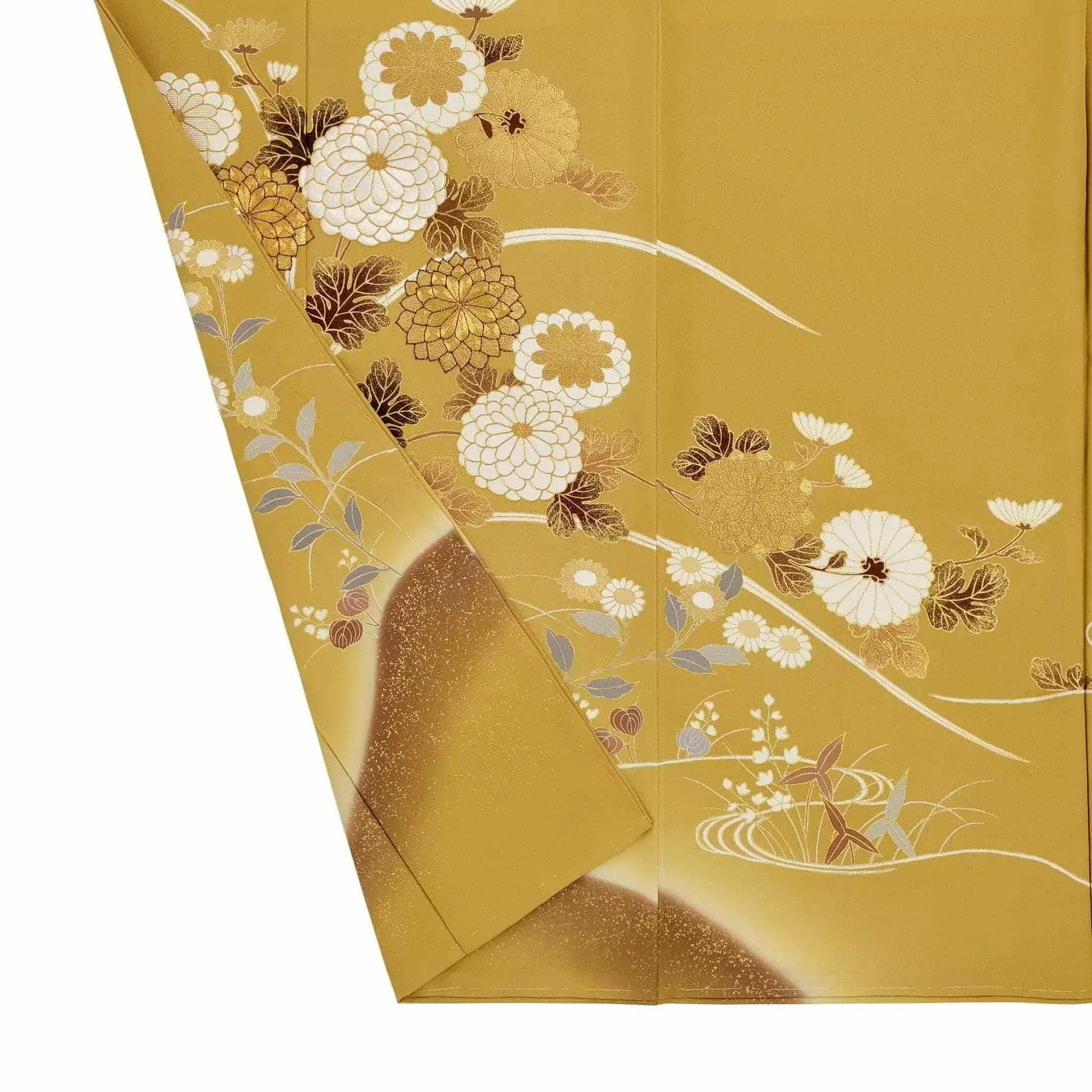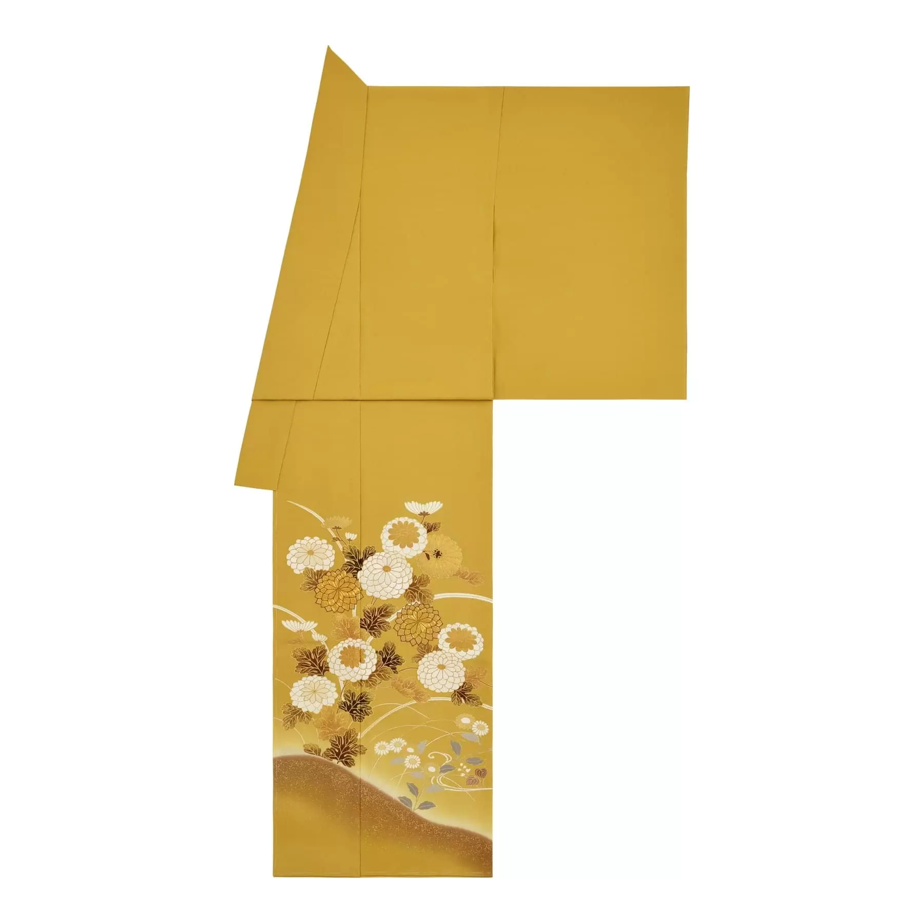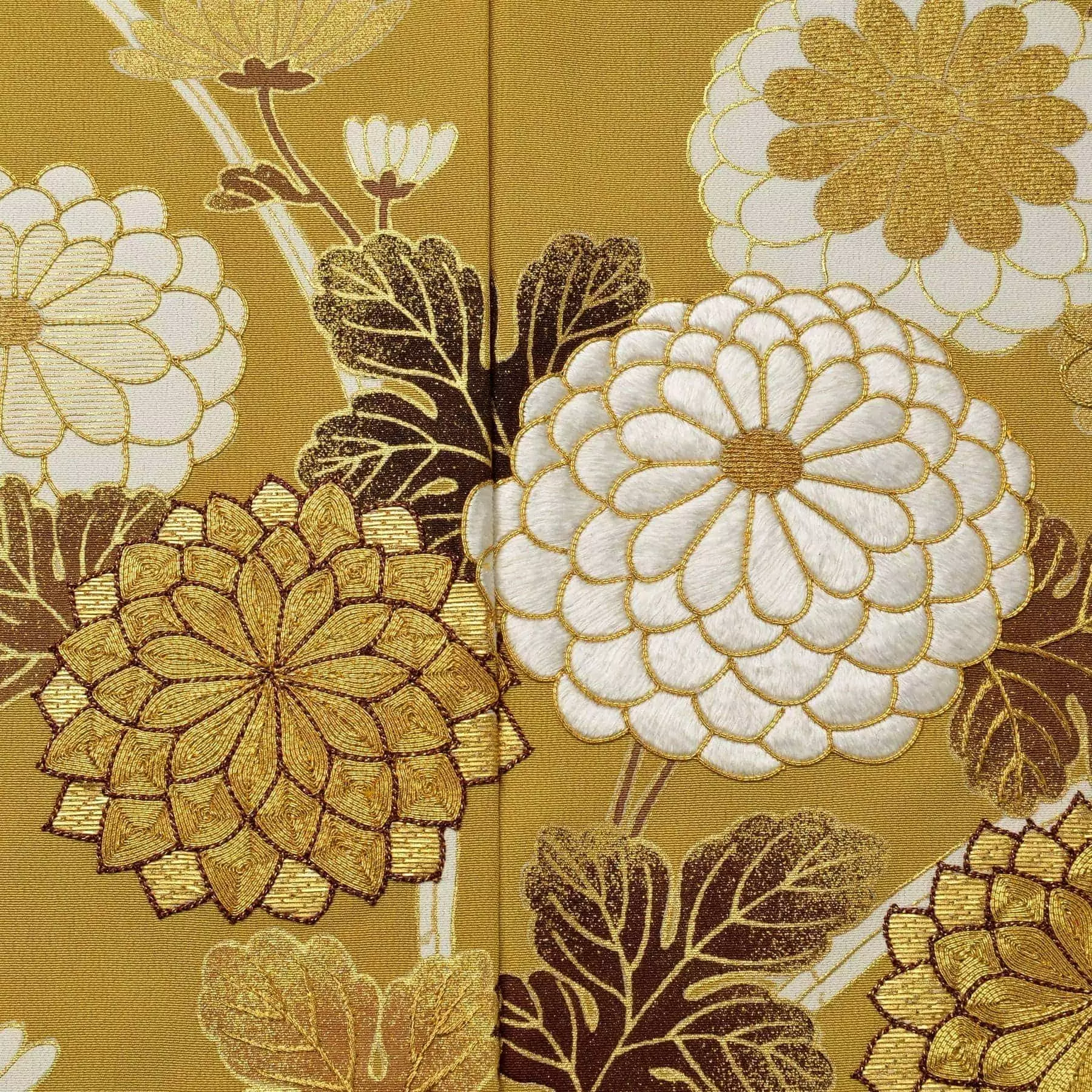 朽ちていく木の葉の色として古来より愛された朽葉(くちば)色の中でも、とりわけ人気の高かった黄朽葉色が持つ晩秋の世界観に合わせ、柄もおさえた色彩で表現しています。落ち着いた色合いでありながらも、刺繍や箔が上品な華やかさを添えてくれています。