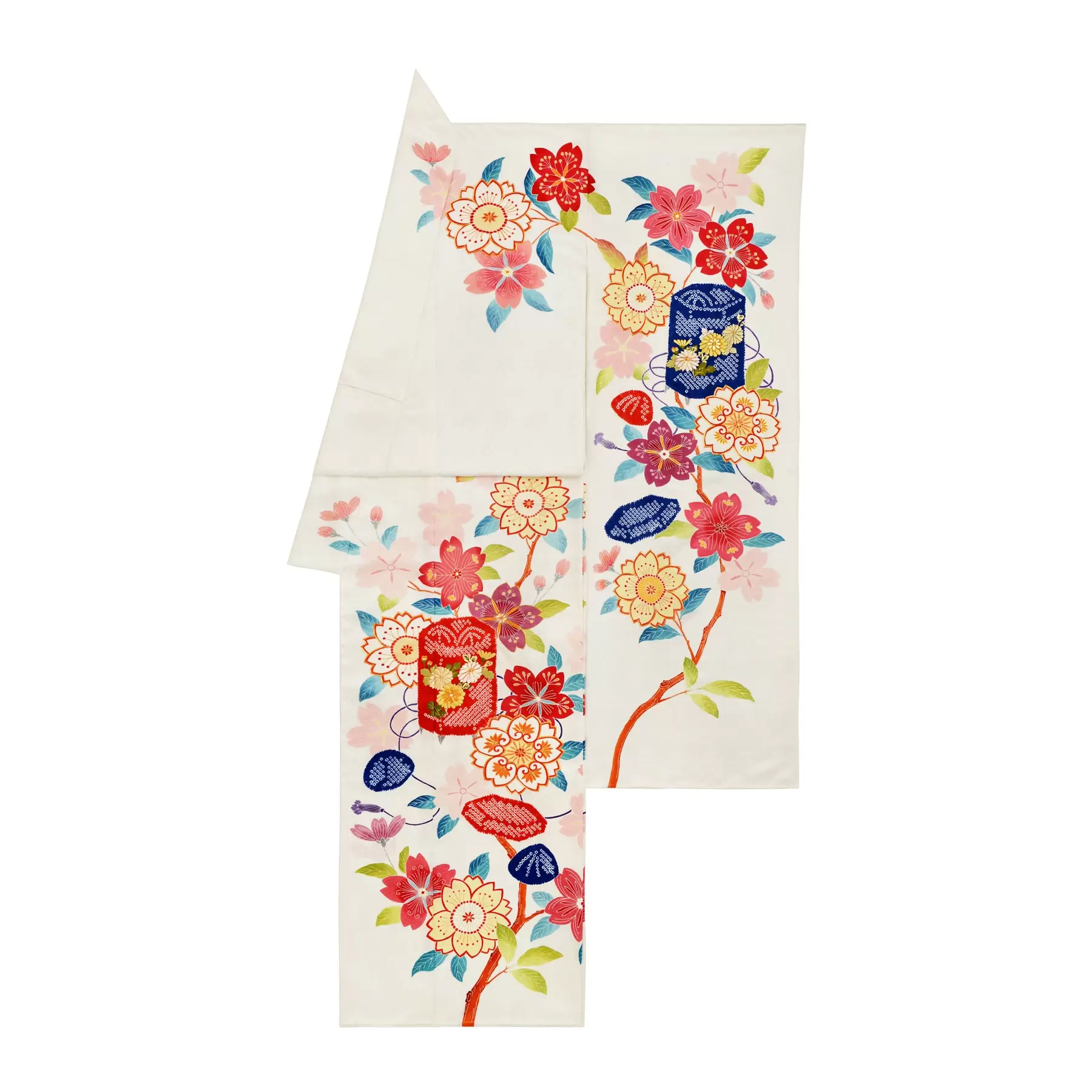 江戸時代の小袖を題材にした、満開の桜花の中で貝合わせを楽しむ優雅なデザインには、我が子の幸せを願う親の気持ちとともに、たおやかで優美な女性になって欲しいとの願いも込められています。